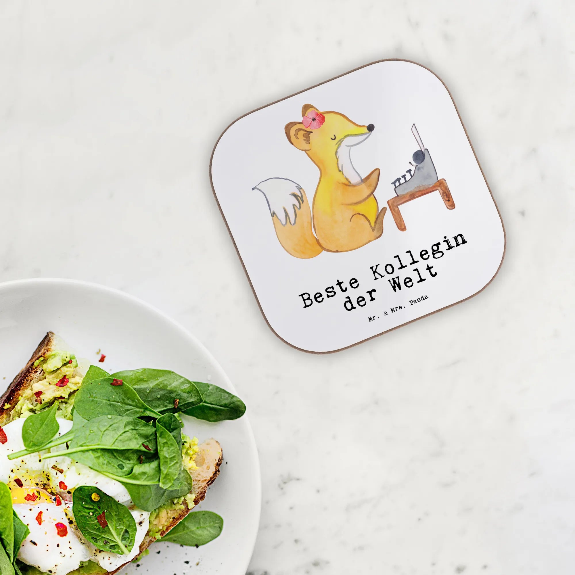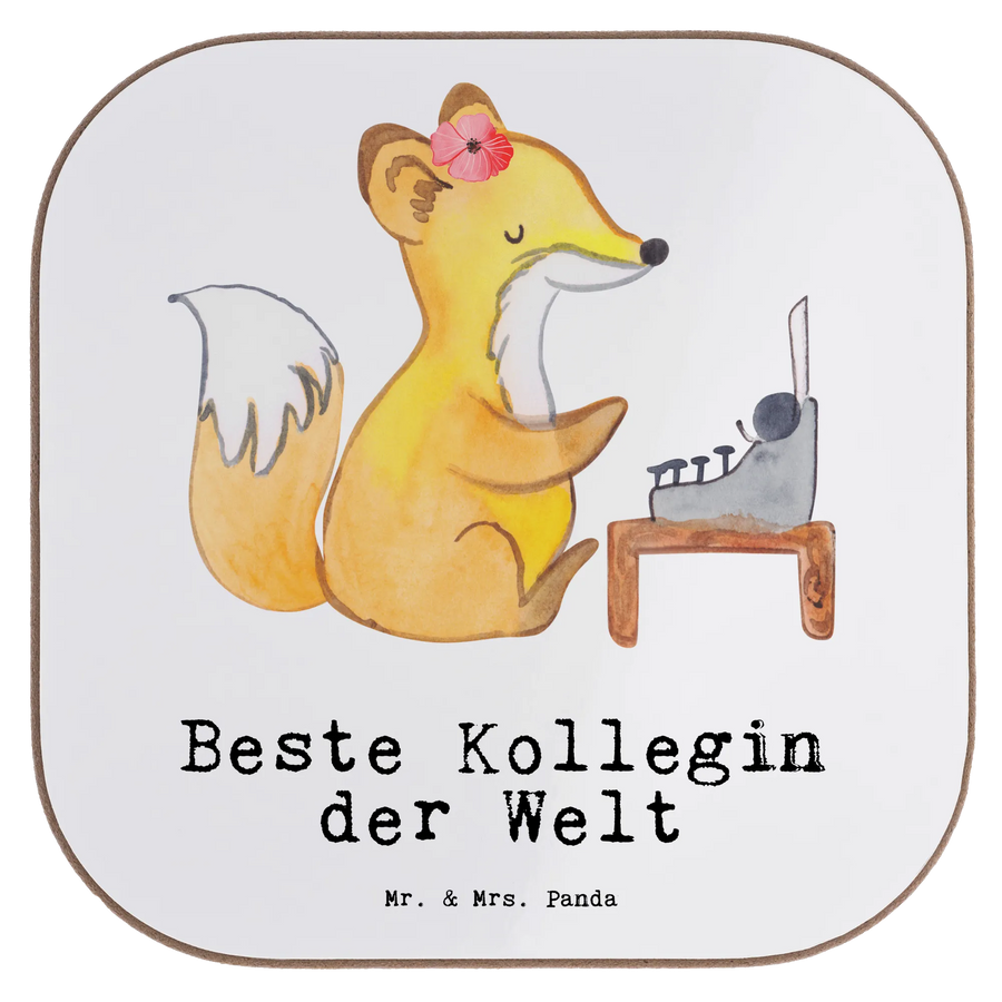 Suchst du nach dem perfekten Geschenk für deine beste Kollegin? Der quadratische Untersetzer mit dem entzückenden Motiv "Fuchs Beste Kollegin der Welt" von Mr. & Mrs. Panda könnte genau das Richtige sein! Mit einem süßen Fuchs, der eine Blume im Haar trägt und emsig an einer Schreibmaschine arbeitet, zeigt dieses schöne Accessoire nicht nur stilvollen Geschmack, sondern auch Wertschätzung für deine Kollegin.