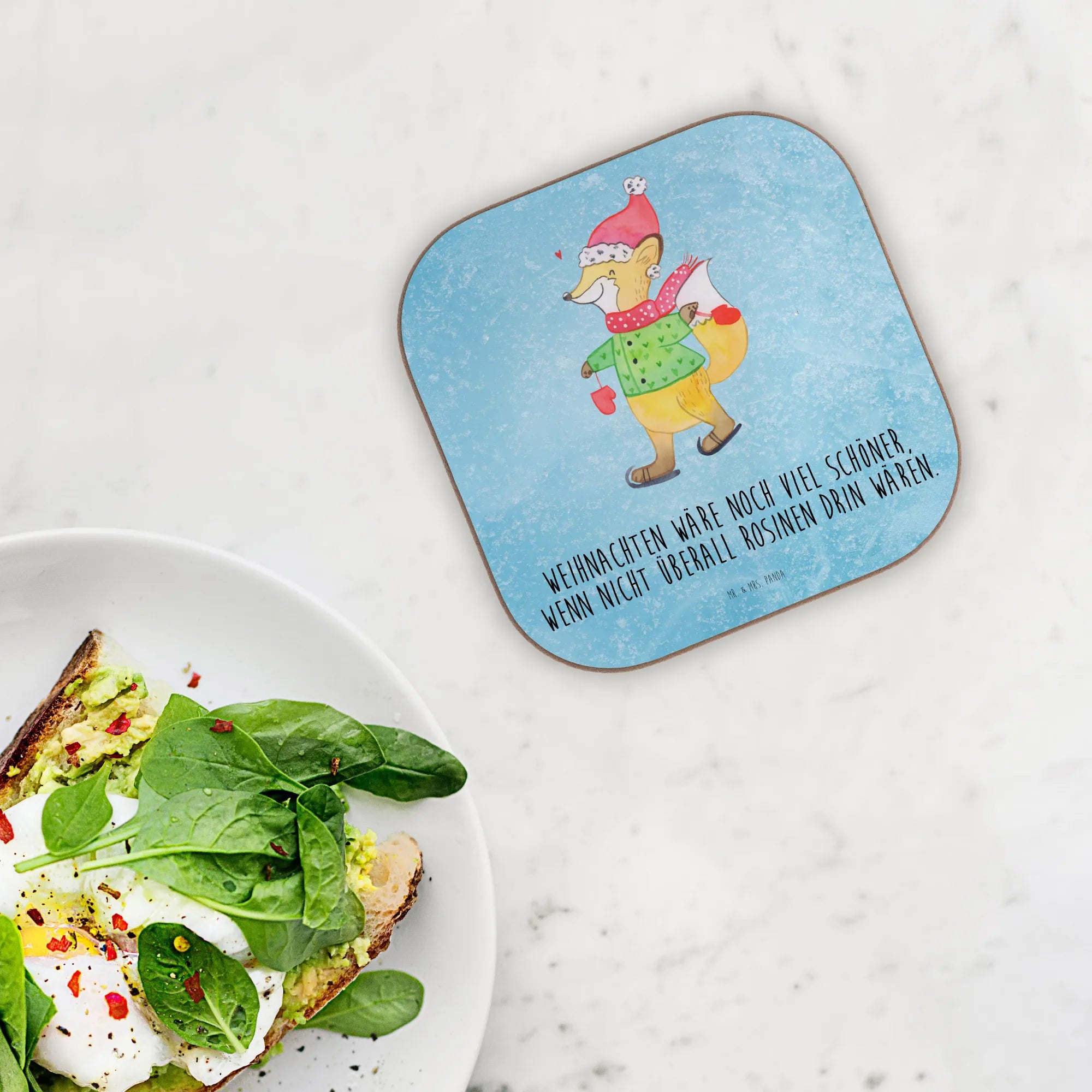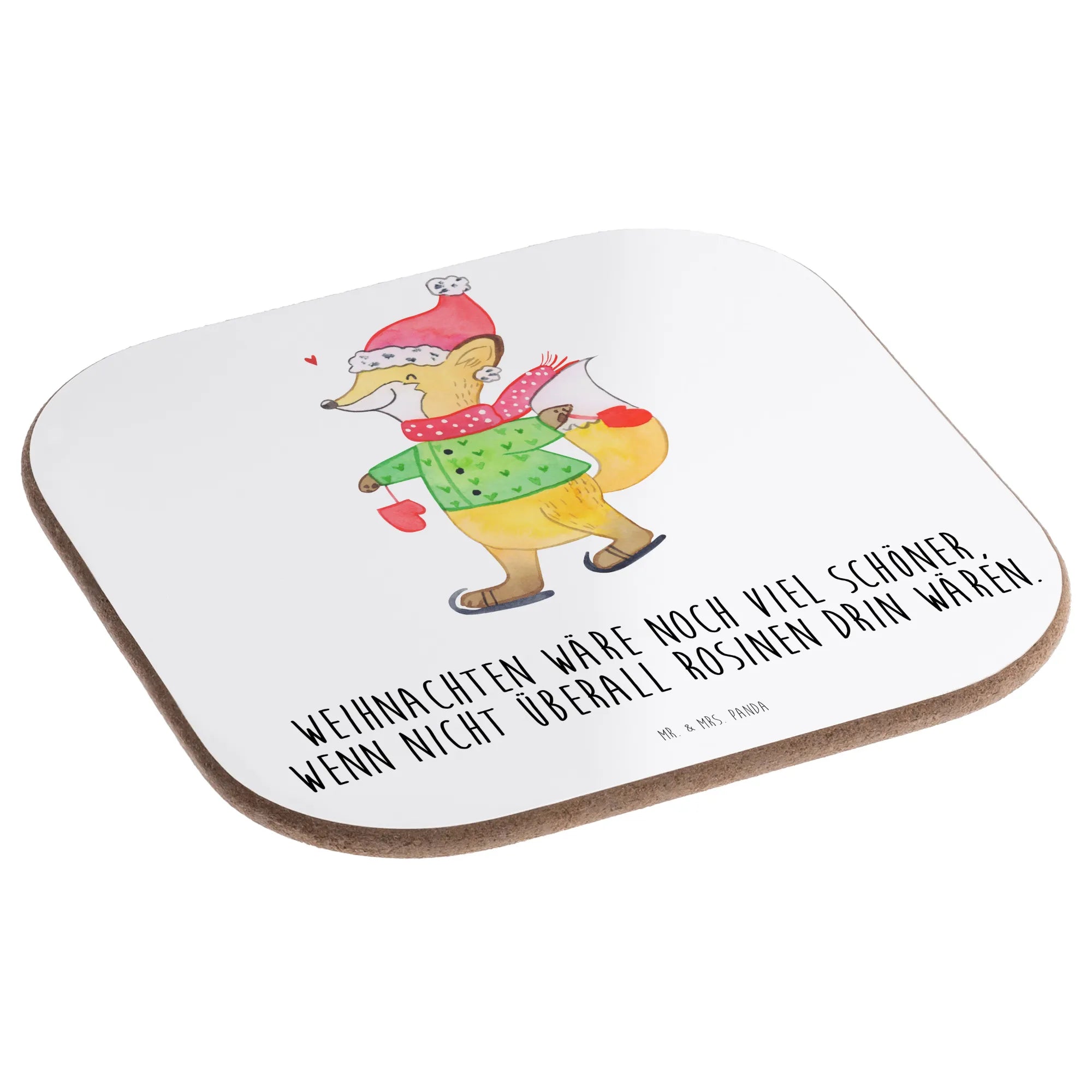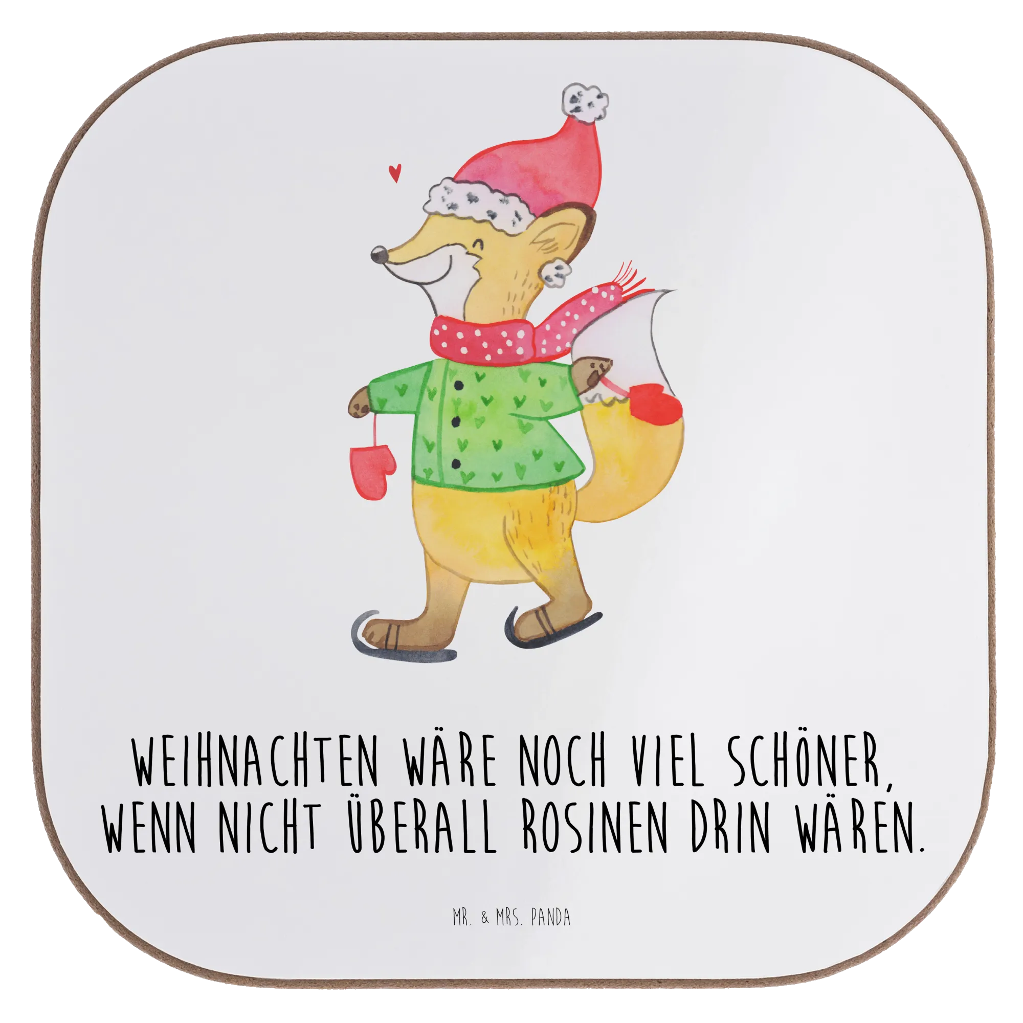 Juhu, die schönste Zeit des Jahres beginnt! Unser quadratischer Untersetzer „Fuchs Schlittschuhe" aus der Winter Kollektion von Mr. & Mrs. Panda bringt weihnachtliche Stimmung direkt auf deinen Tisch. Das liebevoll handgezeichnete Motiv zeigt einen fröhlichen Fuchs in grünem Mantel, rotem Schal und Weihnachtsmütze – und dazu der charmante Spruch: „Weihnachten wäre noch viel schöner, wenn nicht überall Rosinen drin wären."