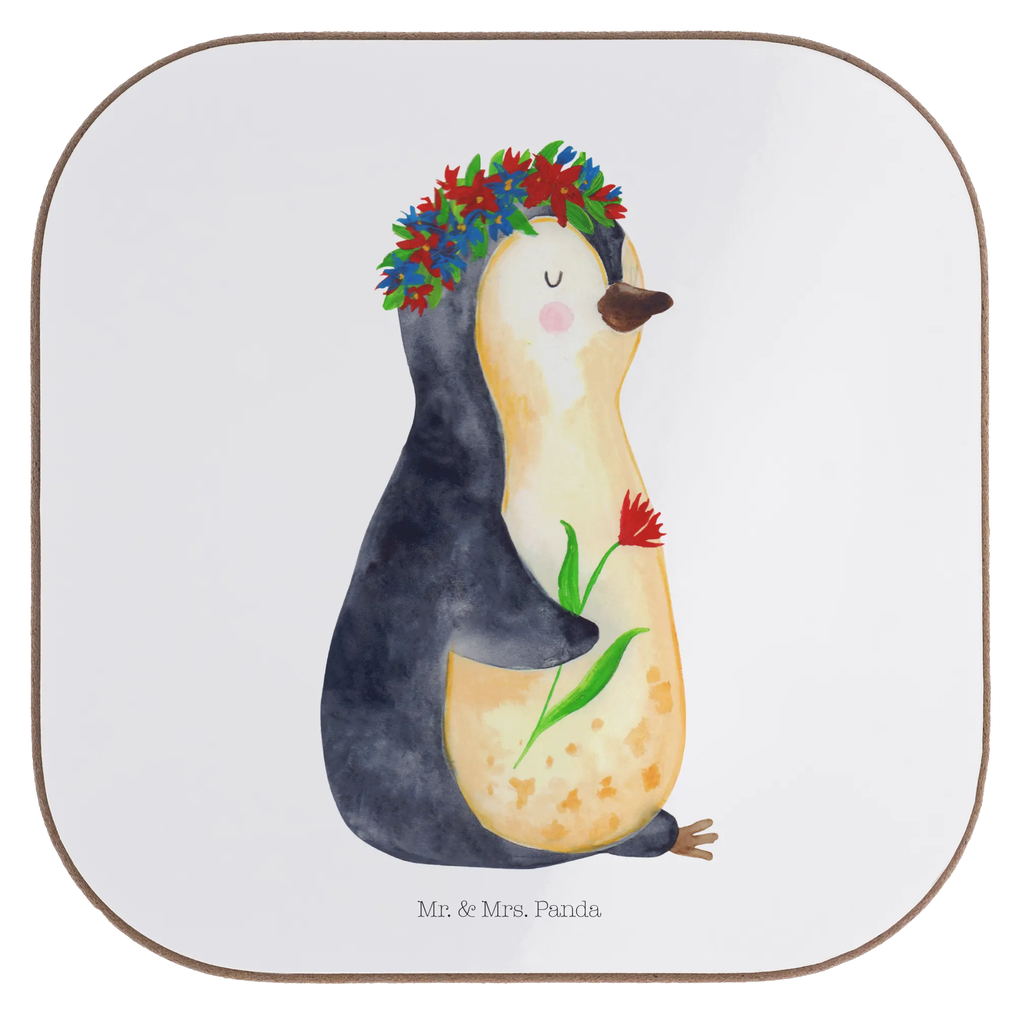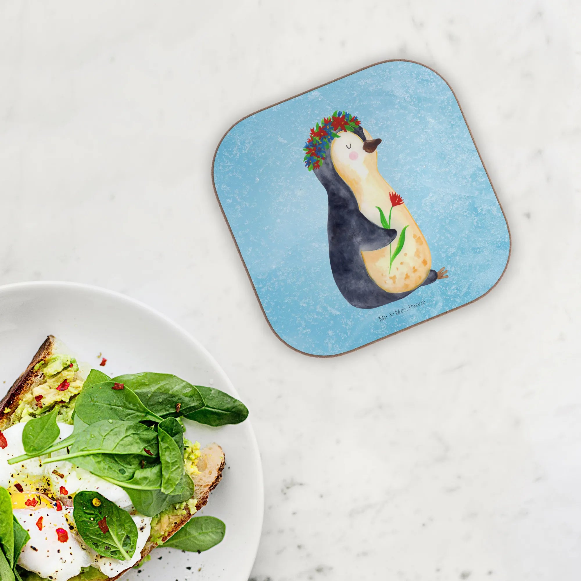Quadratische Untersetzer Pinguin Blumenkranz - ohne Spruch - Eisblau
