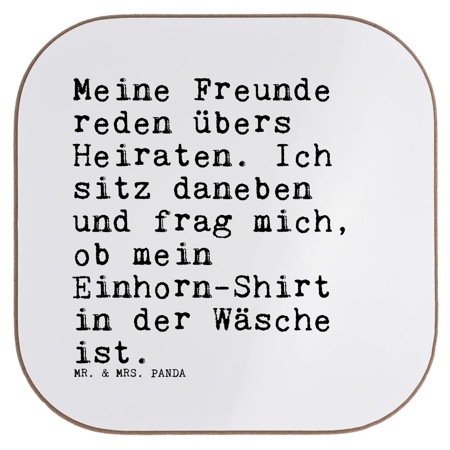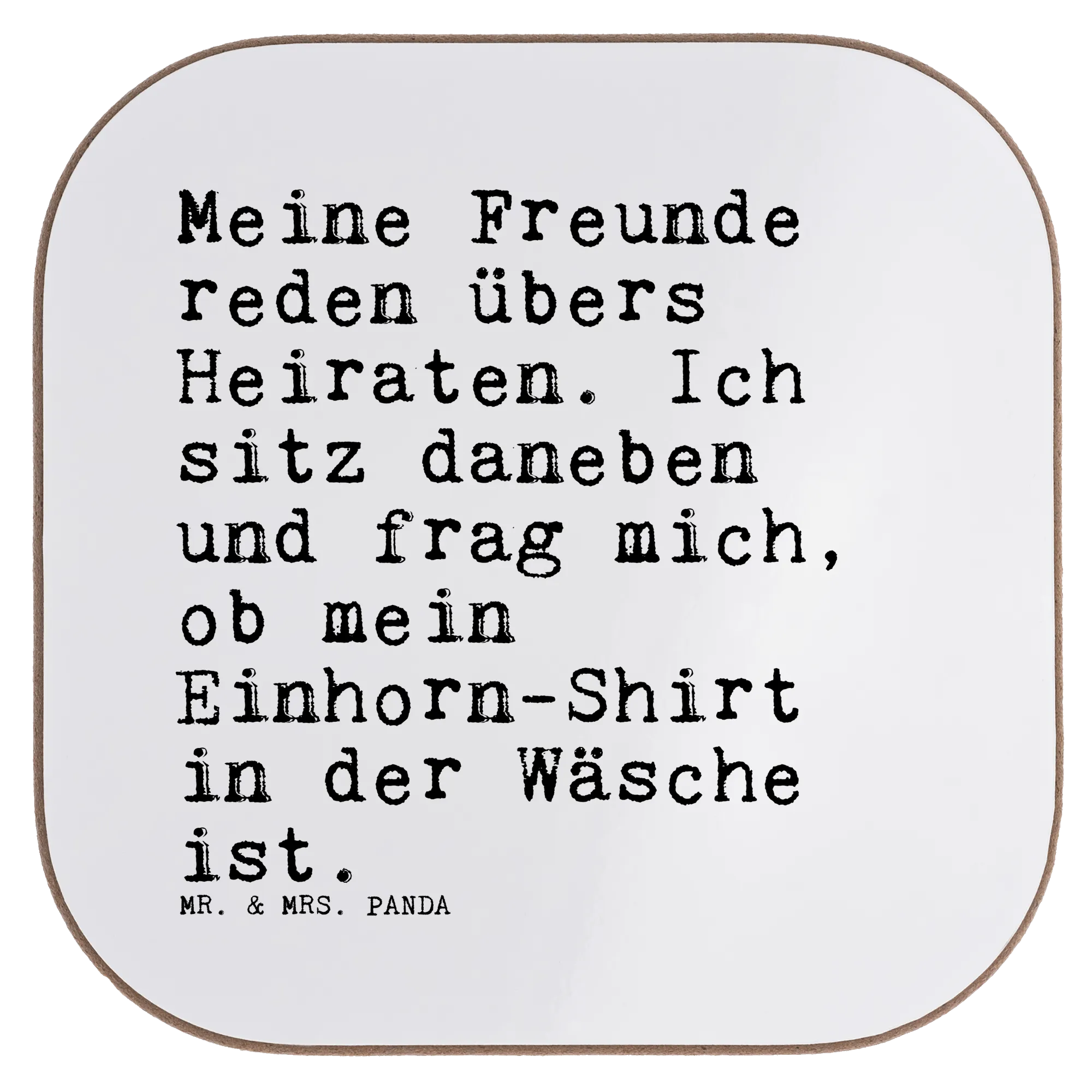 Quadratische Untersetzer Sprüche und Zitate Meine Freunde reden übers Heiraten. Ich sitz daneben und frag mich, ob mein Einhorn-Shirt in der Wäsche ist. - Weiß