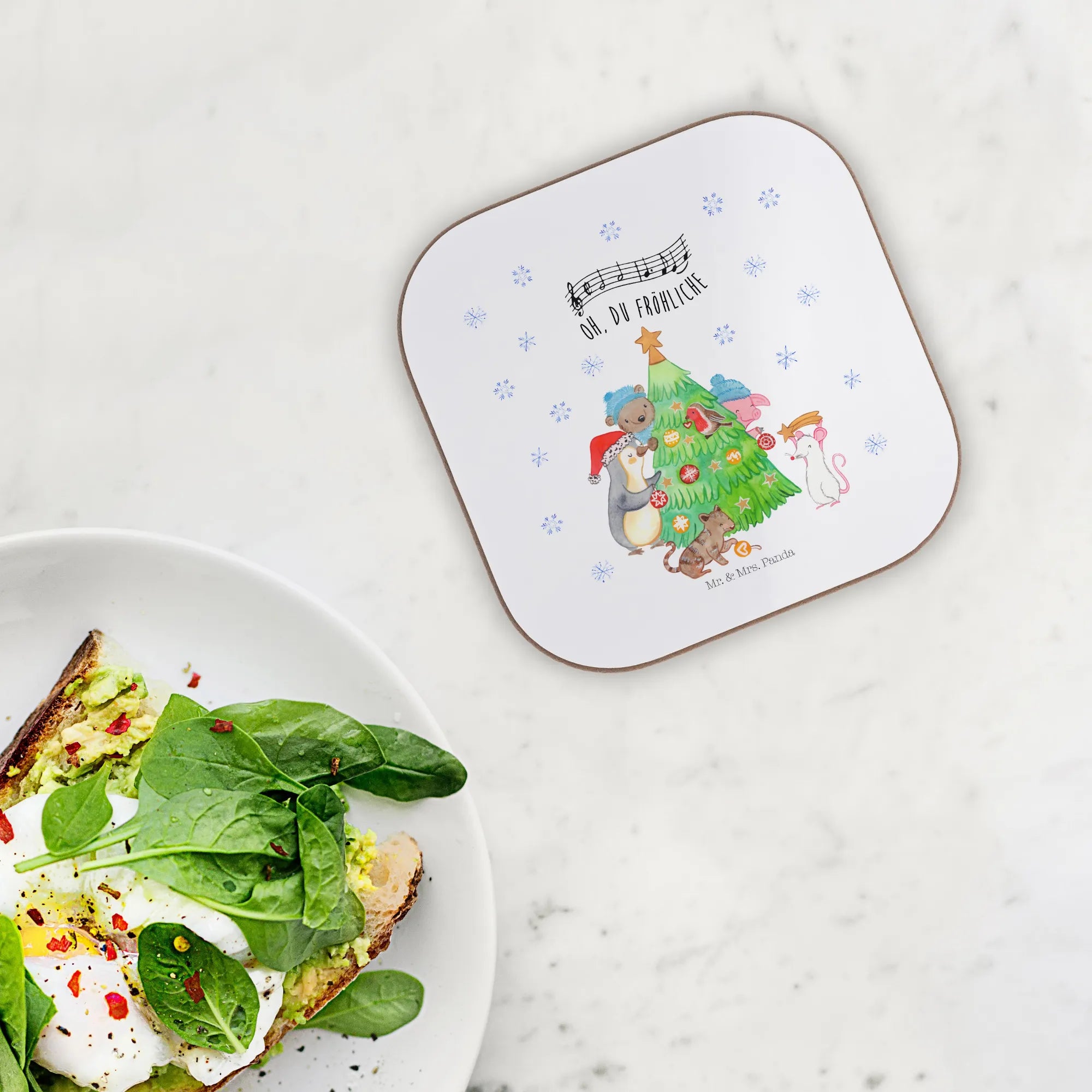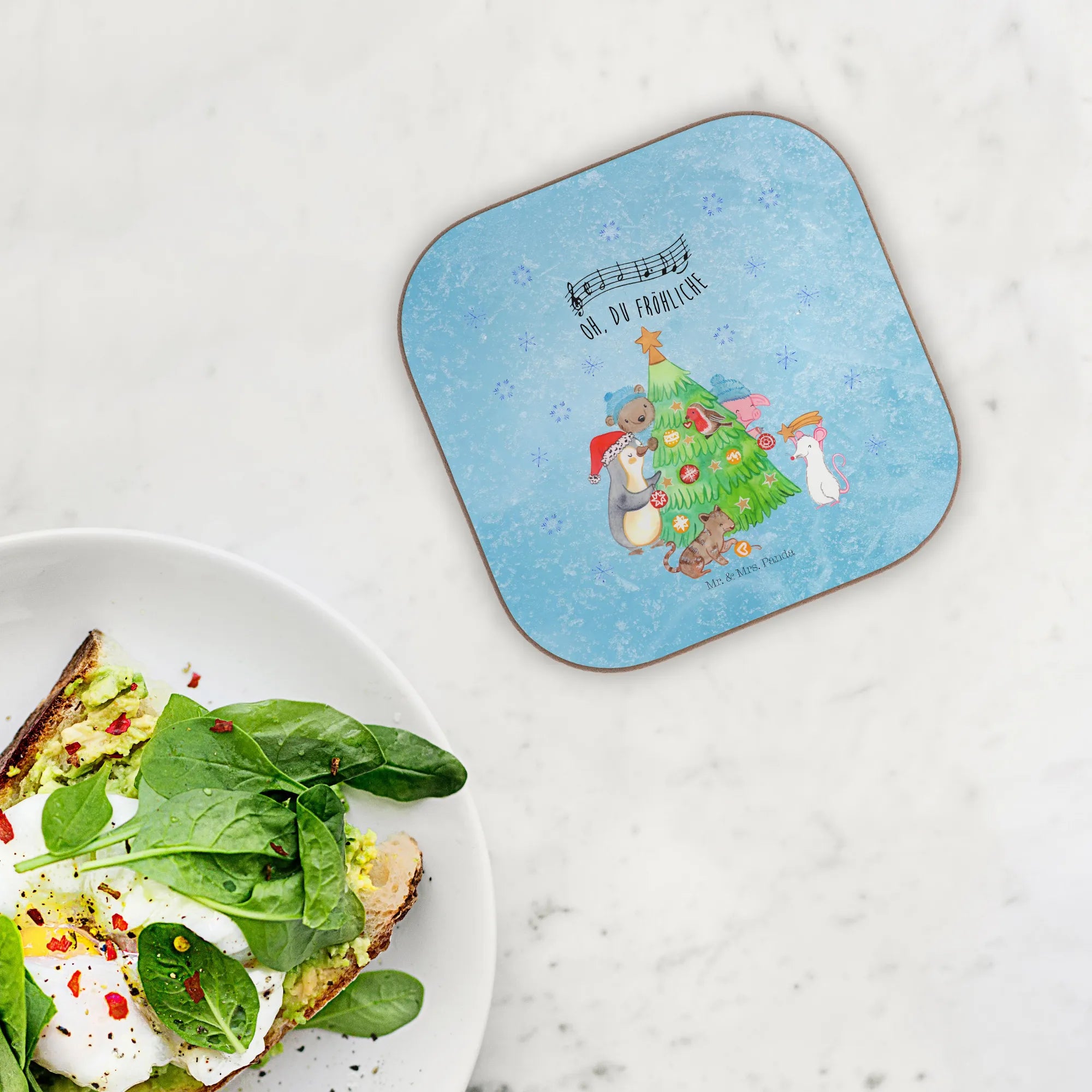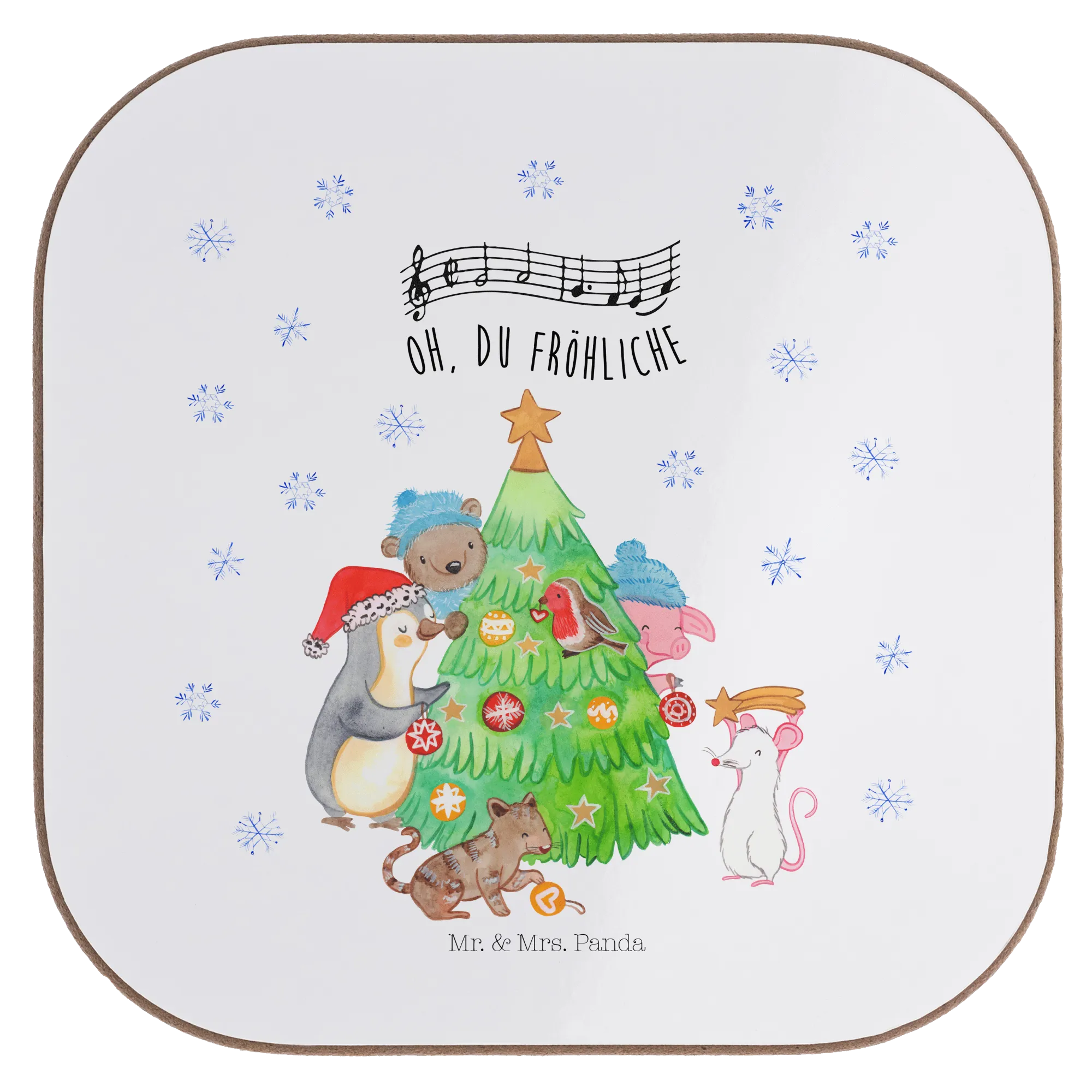Juhuu – die schönste Zeit des Jahres beginnt! Unser quadratischer Untersetzer „Weihnachtsbaum schmücken" aus der Winter Kollektion von Mr. & Mrs. Panda bringt dir weihnachtliche Stimmung direkt auf den Tisch. Auf dem liebevollen Aquarell-Motiv versammeln sich Pinguin, Schwein, Maus, Katze und Bär, um gemeinsam den Baum zu schmücken. Der Schriftzug „Oh, du fröhliche" macht das Bild komplett und zaubert ein Lächeln auf jedes Gesicht. 🎄