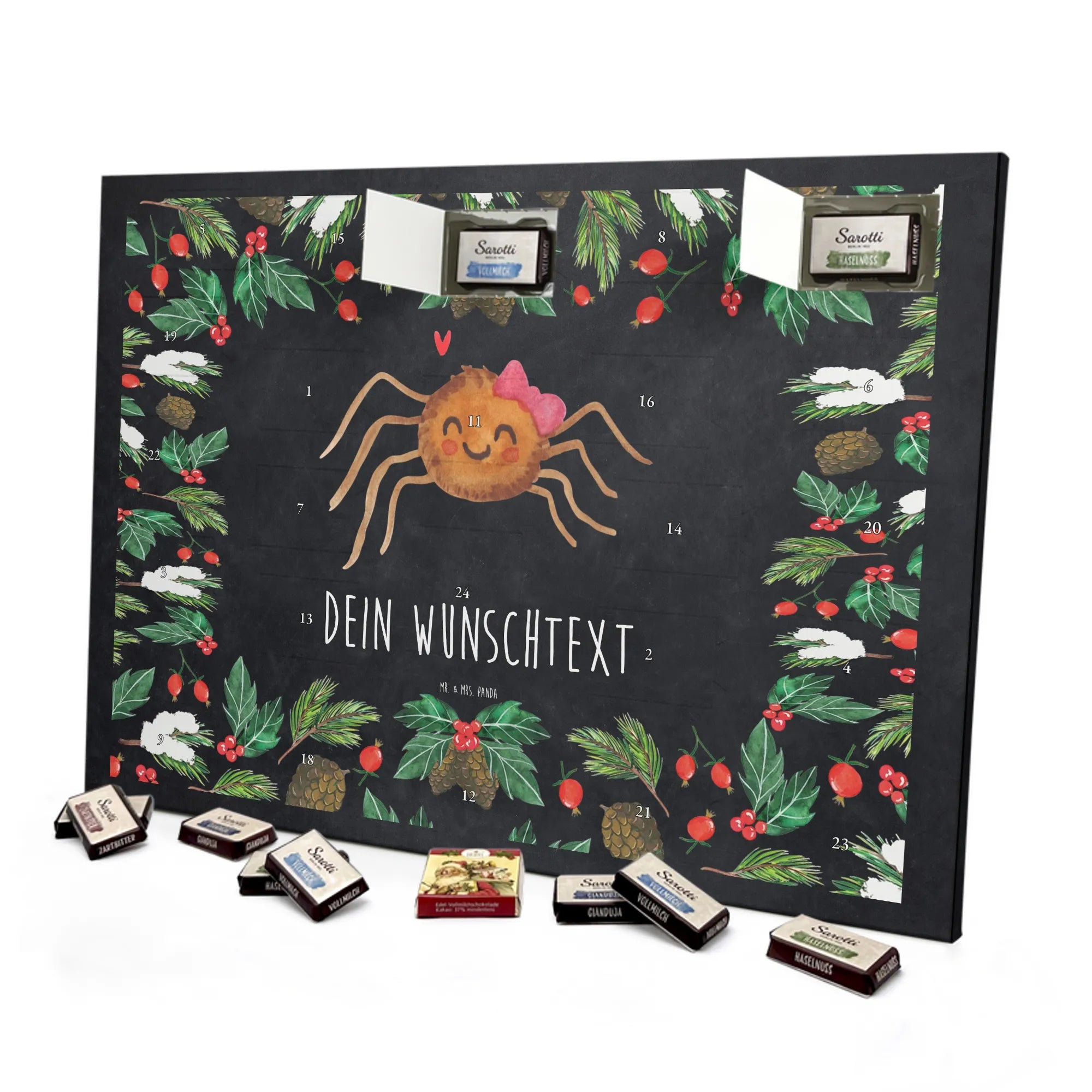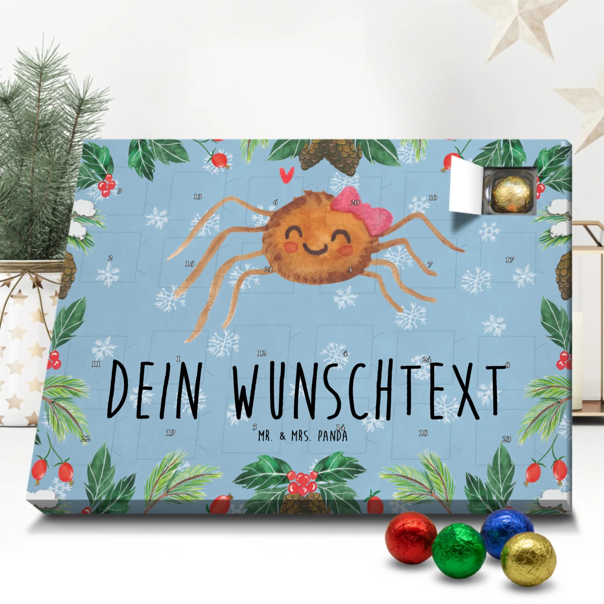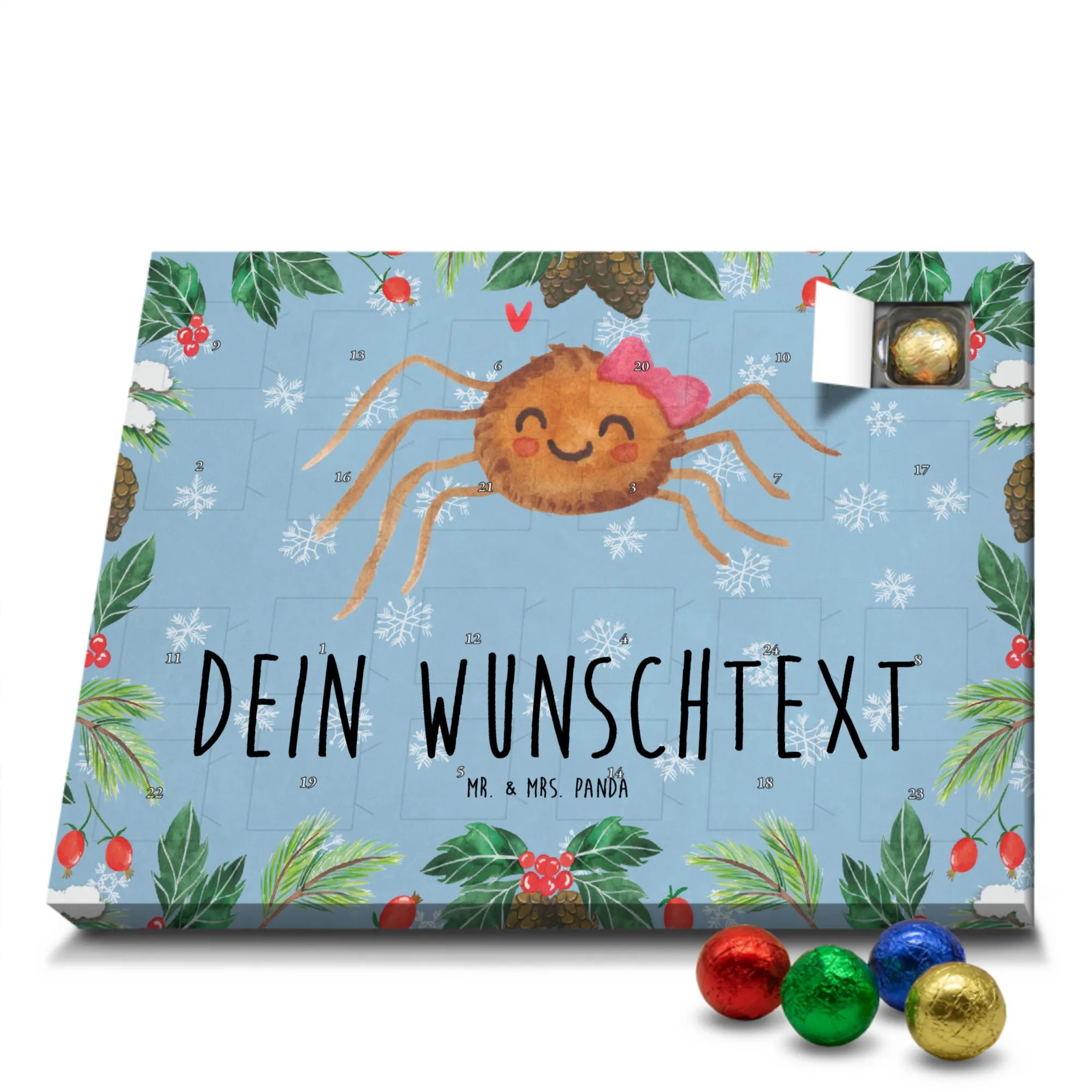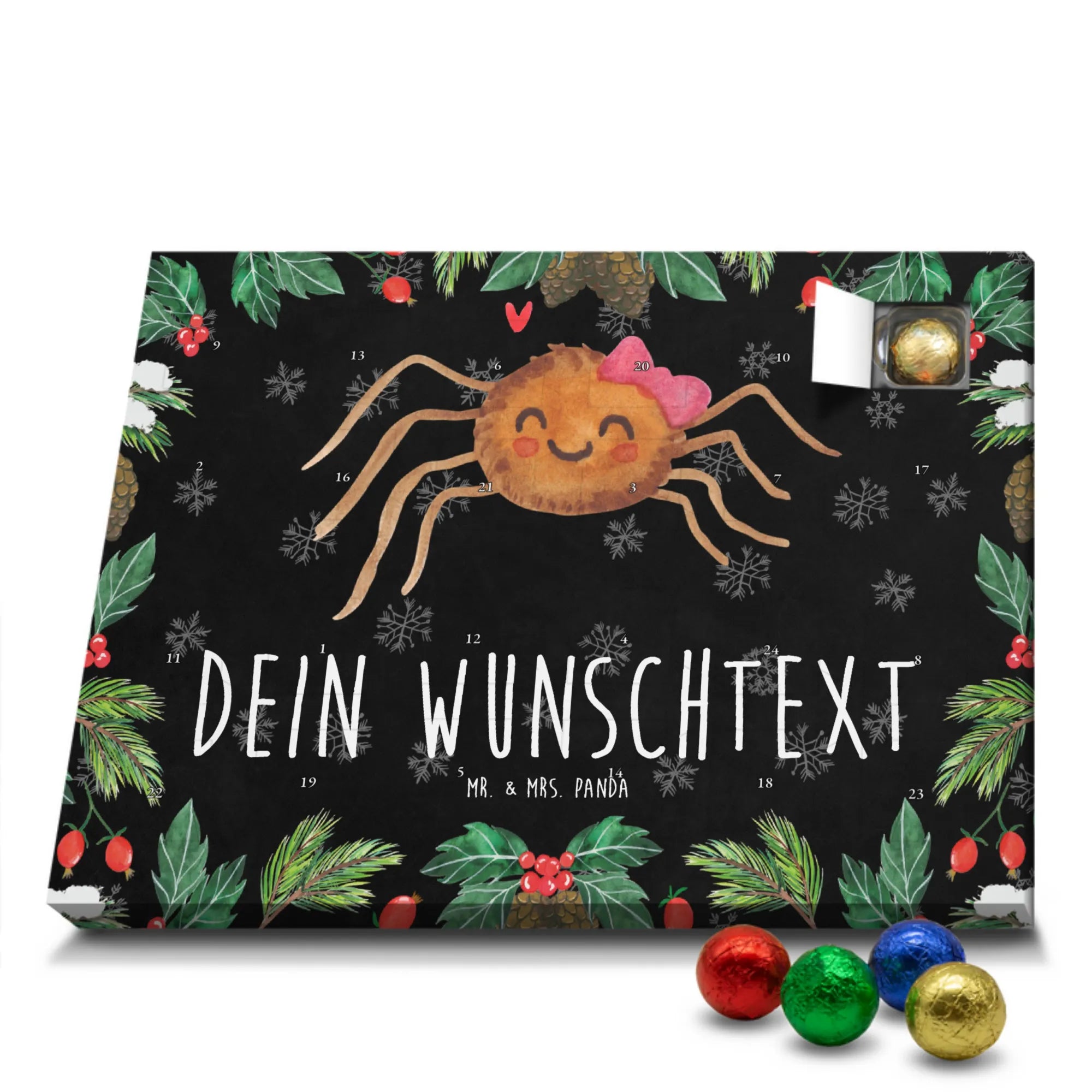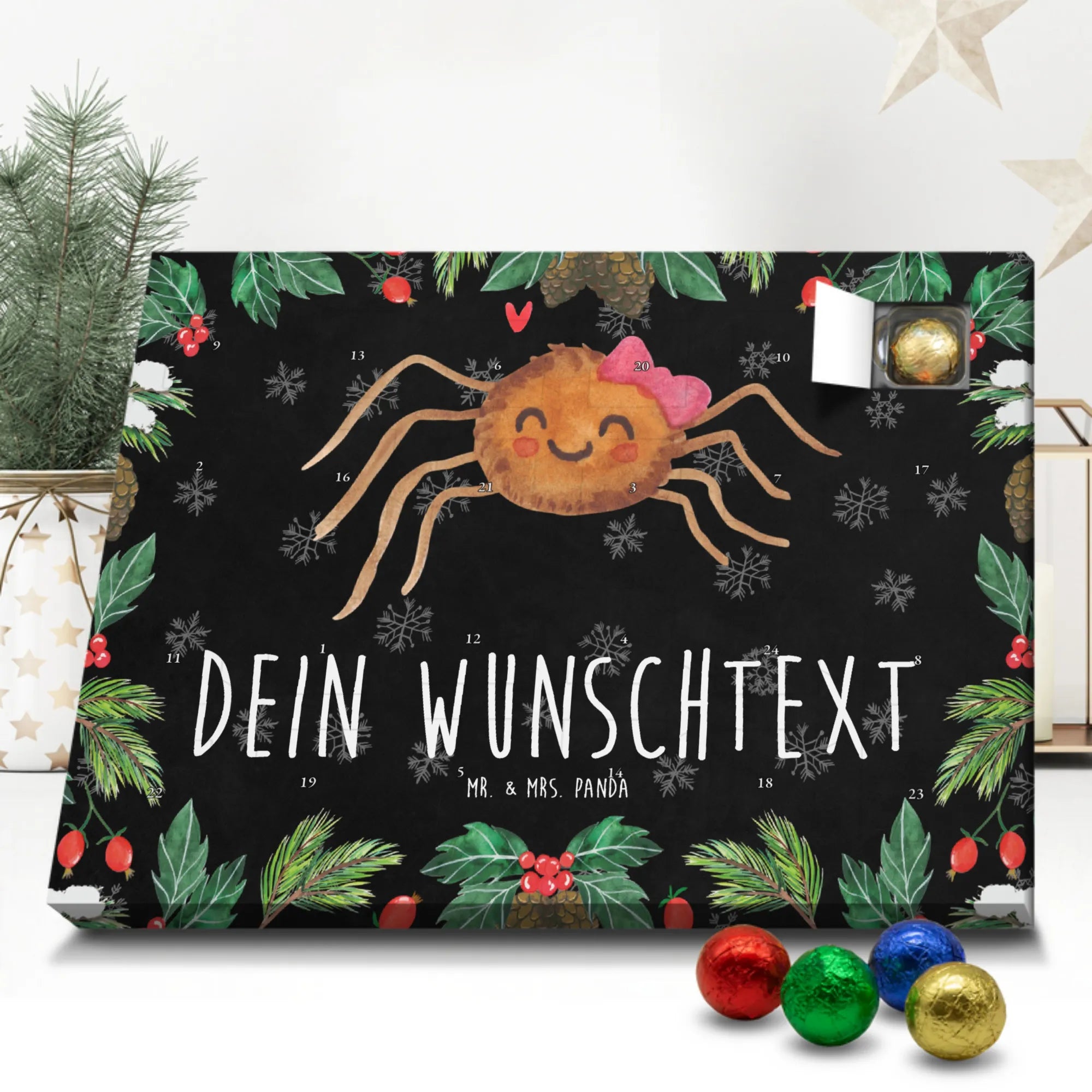 Mach die Adventszeit persönlich mit unserem Personalisierter Adventskalender mit Schokolade von Mr. & Mrs. Panda. Jeder Kalender ist liebevoll illustriert und bedruckt mit charmanten Sprüchen und Motiven – perfekt als Geschenk oder Deko für dein Zuhause. Du kannst deinen Wunschname oder einen kurzen Text hinzufügen, damit der Kalender ganz individuell wird. Die brillante Druckqualität und die seidenmatte Oberflächenveredelung sorgen für eine edle Optik, und auch die Seitenflächen sind komplett bedruckt. Maße: 233 mm x 178 mm x 24 mm. Die clevere Konstruktion erlaubt es, den Kalender aufzuhängen oder aufzustellen – flexibel und dekorativ zugleich. Gefüllt mit MARKENNAMEN Schokolade sowie köstlichen Schokoladenkugeln ist jeder Tag im Advent eine süße Überraschung. Wichtiger Hinweis: (Kann Spuren von Haselnüssen, Mandeln, Gluten und Soja enthalten!), kühl und trocken lagern! Egal ob für Kinder, Partner oder beste Freundin – dieser personalisierte Adventskalender bringt ein Lächeln und zaubert gemütliche Vorfreude. Bestell jetzt und gestalte deine Adventszeit mit einem Hauch Mr. & Mrs. Panda.