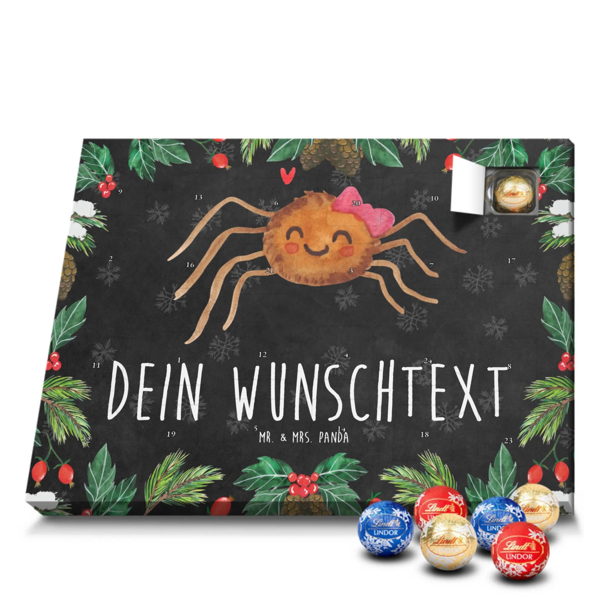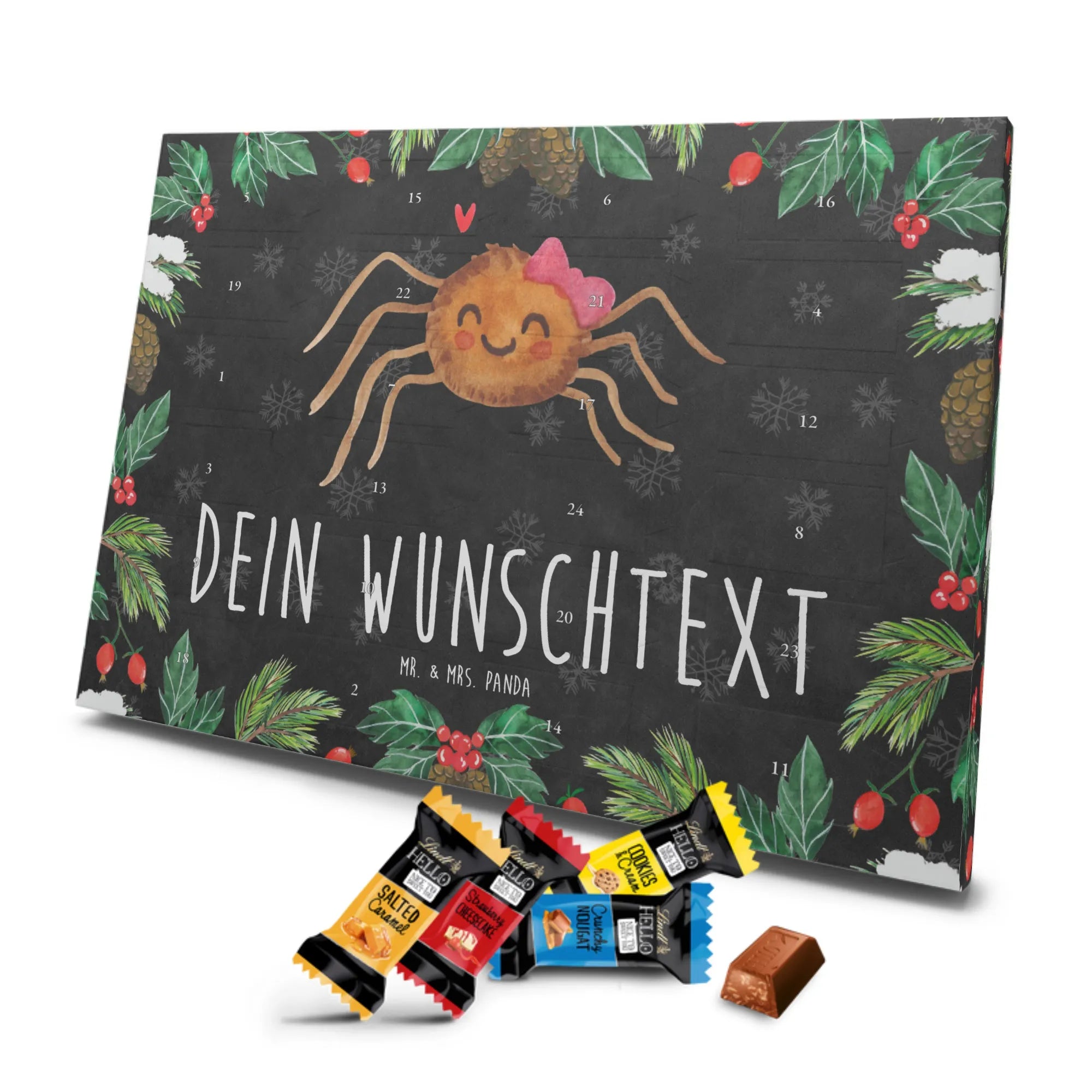 Individueller Schoko Adventskalender von Mr. & Mrs. Panda – das perfekte, persönliche Geschenk für die Adventszeit! Dieser Kalender wurde liebevoll gestaltet, mit fröhlichen Motiven und charmanten Sprüchen bedruckt und lässt sich mit deinem Wunschnamen oder einem individuellen Text versehen. Die brillante Druckqualität gepaart mit seidenmatter Oberflächenveredelung verleiht dem Kalender einen edlen Look; auch die Seitenflächen sind bedruckt, damit das Design rundum stimmig ist. Maße: 233 mm x 178 mm x 24 mm. Praktisch: Du kannst den Kalender aufstellen oder an der Wand aufhängen – ganz nach deinem Geschmack. Gefüllt mit Lindt Lindor Schokolade: 24 einzeln verpackte Markenschokoladen Kugeln in drei verführerischen Sorten. Geschmacksrichtungen: Vollmilch, Feinherb und Weiße Schokolade. Zutaten: Zucker, pflanzliches Fett (Kokosnuss, Palmkern), Kakaobutter, Vollmilchpulver, Kakaomasse, Milchzucker, Magermilchpulver, Butterreinfett, Emulgator (Sojalecithin), Gerstenmalzextrakt, Aromen. Besondere Hinweise: Kann Haselnüsse und Mandeln enthalten. Überrasche deine Liebsten mit einem persönlichen Adventskalender voller kleiner Schoko-Momente und viel Vorfreude.