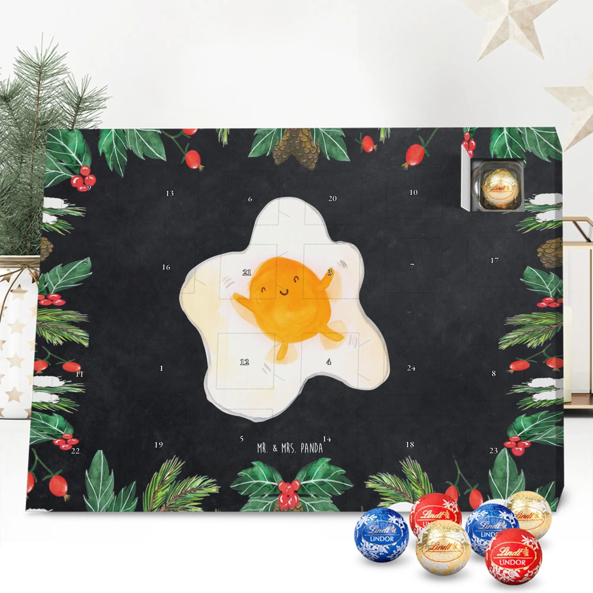 Der Schokolade Adventskalender von Mr. & Mrs. Panda ist ein liebevoll gestaltetes Highlight für deine Adventsdeko. Bedruckt mit wunderschönen Motiven & Sprüchen, nicht personalisierbar, bietet er eine charmante Optik für jeden Haushalt. Die brillante Druckqualität mit seidenmatter Oberflächenveredelung sorgt für edle Akzente, und die bedruckten Seitenflächen machen den Kalender rundum schön. Maße: 233 mm x 178 mm x 24 mm. Besonderheit: kann aufgehängt oder aufgestellt werden – richtig praktisch! Gefüllt mit Lindt Lindor: 24 einzeln verpackte Markenschokoladen Kugeln in drei köstlichen Varianten – Vollmilch, Feinherb und Weiße Schokolade – sorgen für tägliche Freuden. Zutaten: Zucker, pflanzliches Fett (Kokosnuss, Palmkern), Kakaobutter, Vollmilchpulver, Kakaomasse, Milchzucker, Magermilchpulver, Butterreinfett, Emulgator (Sojalecithin), Gerstenmalzextrakt, Aromen. Besondere Hinweise: Kann Haselnüsse und Mandeln enthalten. Ob als Geschenk oder für dich selbst – dieser Kalender ist eine wunderbare Mischung aus Design und feiner Markenschokolade.
