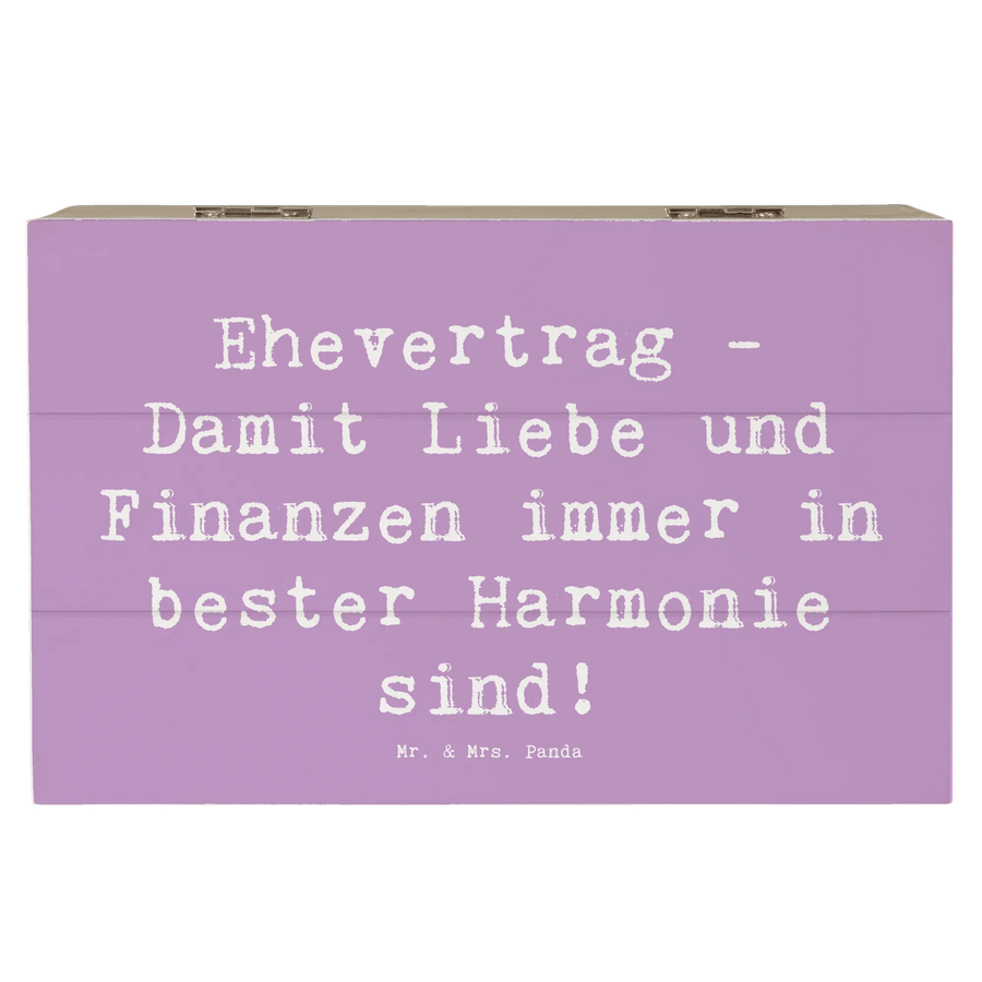 Du suchst nach dem perfekten Geschenk für die nächste Hochzeit? Die wunderschöne Holzkiste von Mr. & Mrs. Panda mit dem Motto 'Ehevertrag - Damit Liebe und Finanzen immer in bester Harmonie sind!' ist genau das Richtige für dich und das Brautpaar! Diese zauberhafte Erinnerungsbox ist nicht nur eine tolle Dekokiste, sondern auch ideal als Aufbewahrungsort für all die wertvollen Schätze, die im Laufe der Jahre gesammelt werden. Perfekt für Hochzeitsgeschenke, Verlobungsgeschenke oder Selbstgeschenke, um jede schöne Erinnerung festzuhalten!