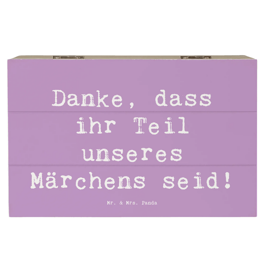 Die wunderschöne Holzkiste von Mr. & Mrs. Panda ist das perfekte Geschenk für jeden besonderen Anlass, insbesondere für Hochzeiten. Mit dem liebevollen Spruch 'Danke, dass ihr Teil unseres Märchens seid!' ist sie ideal als Erinnerungskiste für das Brautpaar und die Gäste gedacht.