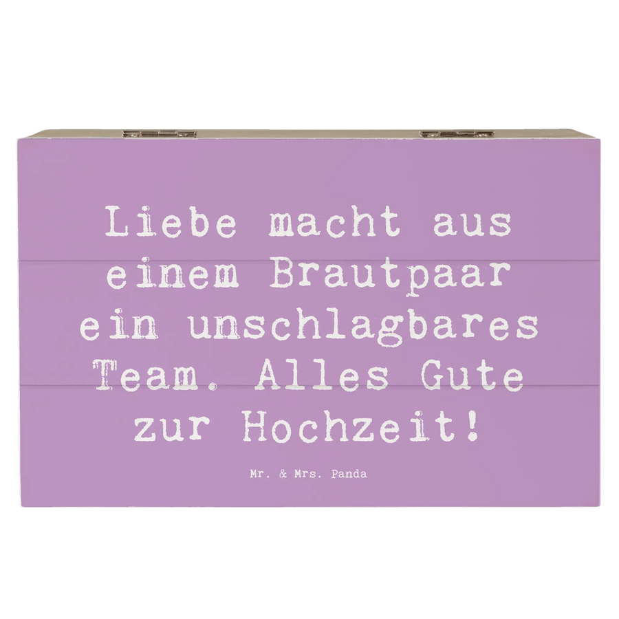 Die wunderschöne Holzkiste von Mr. & Mrs. Panda ist das ideale Geschenk für das Brautpaar an ihrem großen Tag. Mit der liebevollen Aufschrift 'Liebe macht aus einem Brautpaar ein unschlagbares Team. Alles Gute zur Hochzeit!' wird diese Erinnerungskiste zu einem besonderen Aufbewahrungsort für all die schönen Erlebnisse rund um die Hochzeit.