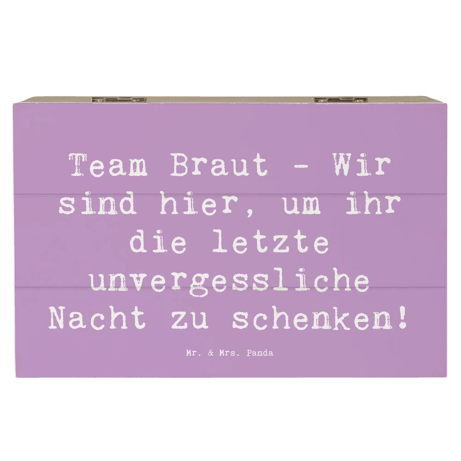 Mr. & Mrs. Panda Holzkiste Junggesellinnenabschied – die perfekte Aufbewahrungsbox Holz für den schönsten Abschiedsabend. Diese bezaubernde Holzbox mit Deckel im Farbton Lavendeltraum ist bedruckt mit dem witzigen Spruch: "Team Braut - Wir sind hier, um ihr die letzte unvergessliche Nacht zu schenken!" und eignet sich ideal als Geschenk Junggesellinnenabschied, Hochzeitsgeschenk oder Erinnerungskiste.