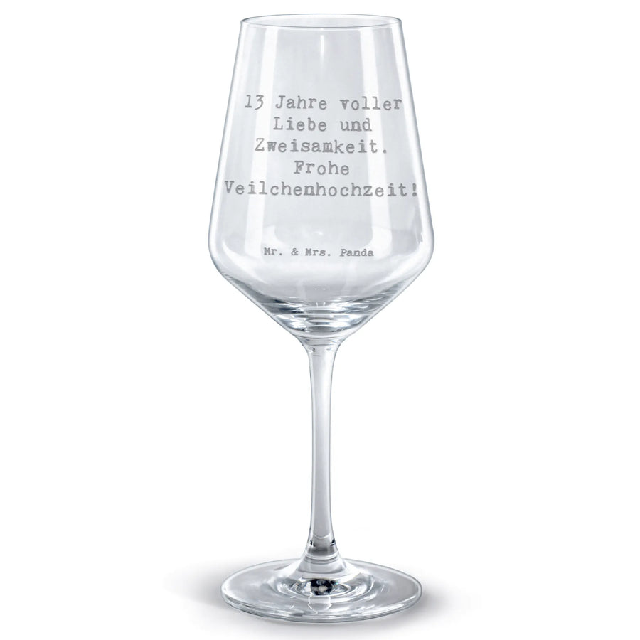 Entdecke das perfekte Geschenk für den 13. Hochzeitstag mit unserem wunderschönen Rotweinglas, das mit dem liebevollen Spruch '13 Jahre voller Liebe und Zweisamkeit. Frohe Veilchenhochzeit!' graviert ist. Wenn du auf der Suche nach einem ganz besonderen Geschenk für Weinliebhaber oder romantische Paare bist, dann ist dieses Weinglas aus hochwertigem Premium Glas genau das Richtige!