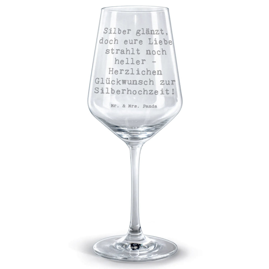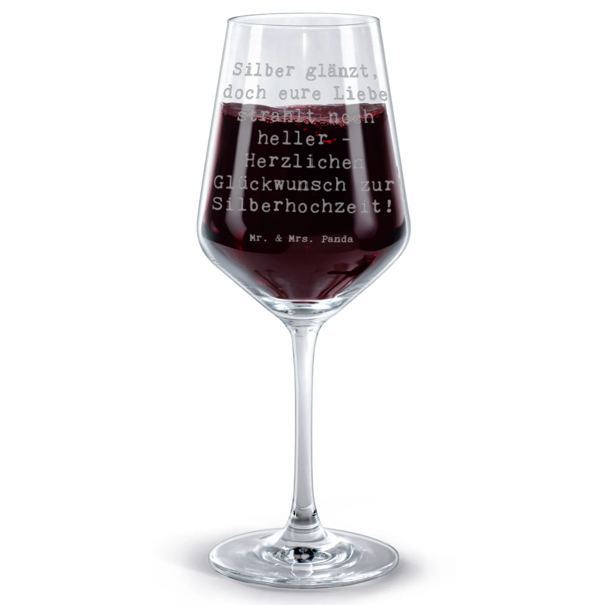 Entdecke das perfekte Geschenk für den 25. Hochzeitstag mit unserem wunderschönen Rotwein Glas von Mr. & Mrs. Panda! Dieses edle Weinglas ist nicht nur ein stilvolles Accessoire für Weinliebhaber, sondern auch eine liebevolle Hommage an eure Silberhochzeit. Mit der eindrucksvollen Gravur „Silber glänzt, doch eure Liebe strahlt noch heller - Herzlichen Glückwunsch zur Silberhochzeit!“ wird jeder Schluck Rotwein zu einem besonderen Moment.