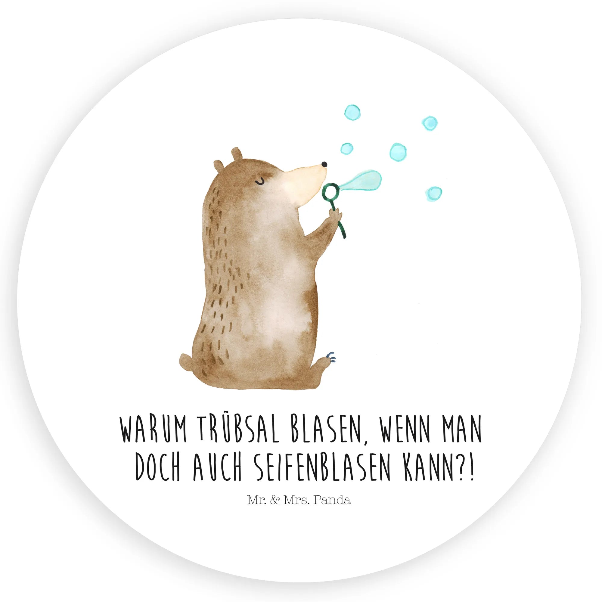 Entdecke den zauberhaften 120mm Rund Aufkleber Bär Seifenblasen von Mr. & Mrs. Panda – ein kleines Stück Freude zum Aufkleben. Der süße Bär sitzt gemütlich und bläst zarte Seifenblasen, während der fröhliche Spruch „Warum Trübsal blasen, wenn man doch auch Seifenblasen kann?!“ direkt ins Herz trifft. Dieses Motiv ist ein Lieblingsstück aus der Bär Kollektion, liebevoll von Mrs. Panda handgezeichnet.