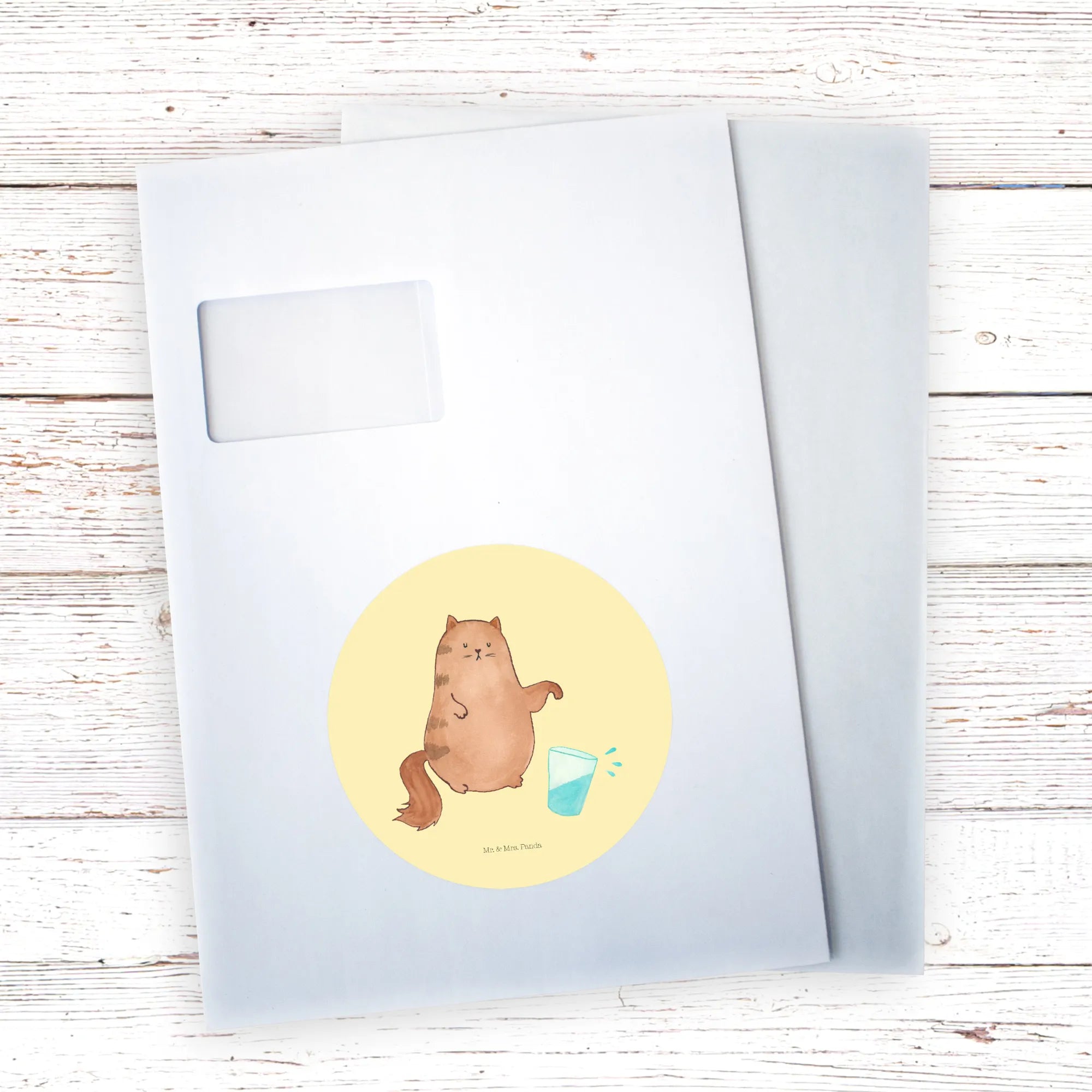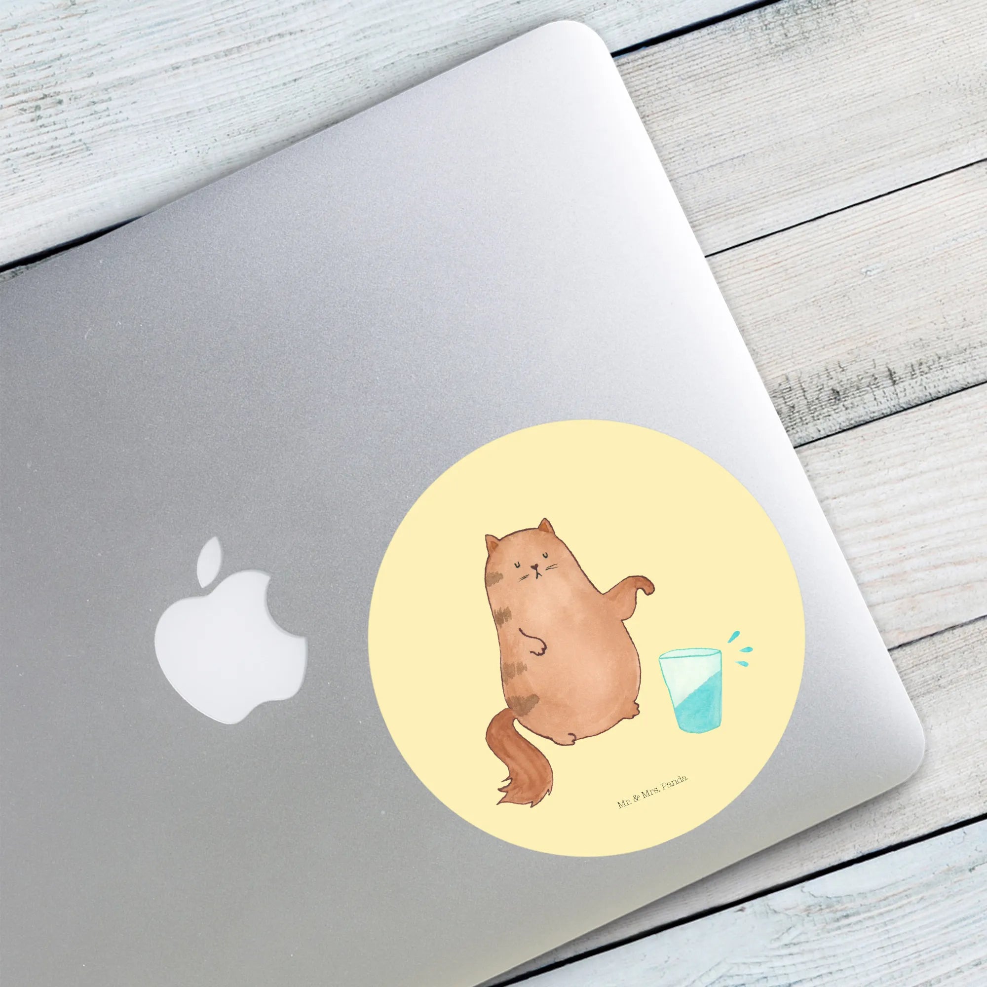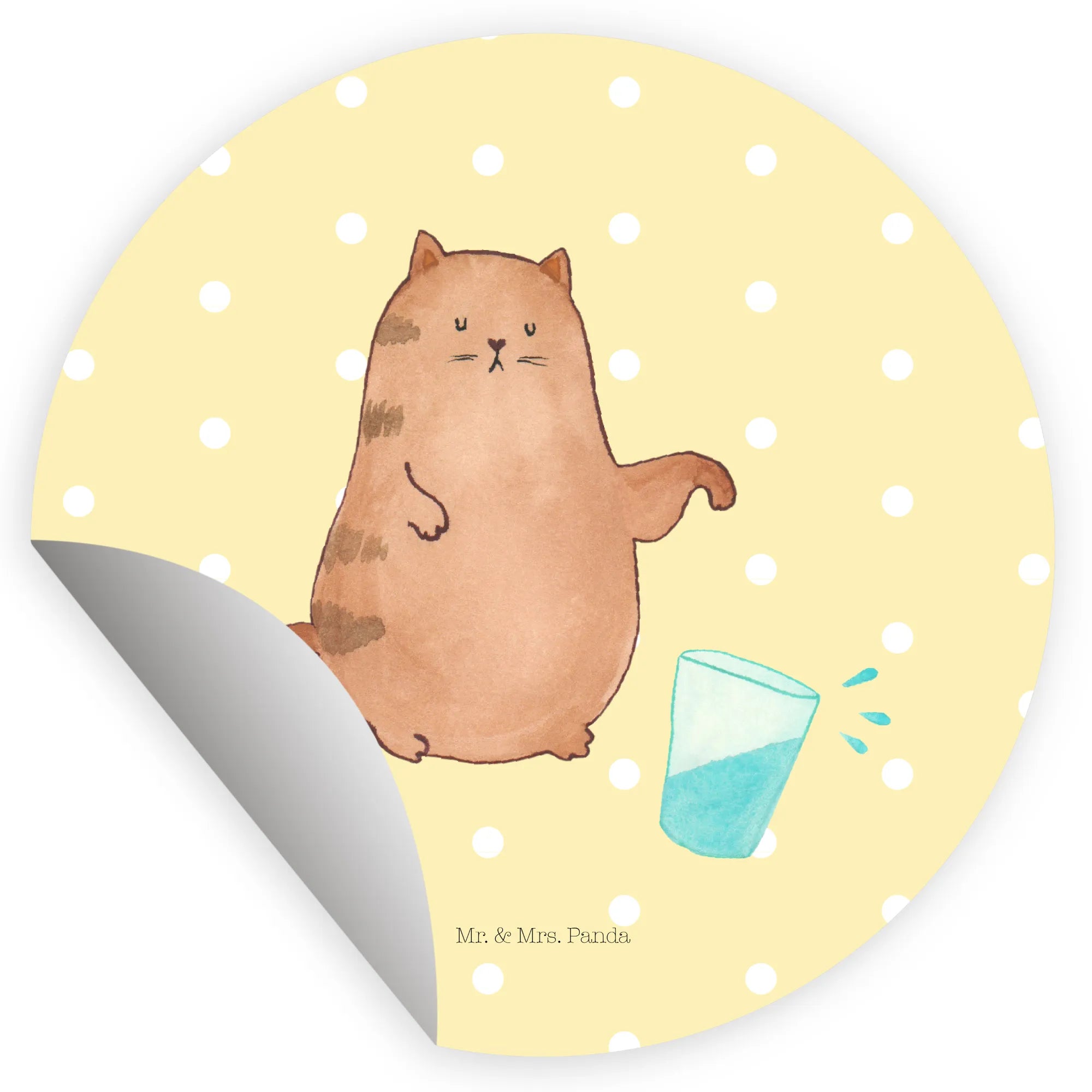 Unser entzückender, runder Aufkleber zeigt eine freche Katze, die ein Wasserglas umstößt – ein Motiv, das sofort gute Laune macht. Die zarte Pastell-Gelb Hintergrundfarbe und die handgezeichnete Illustration aus der Mr. & Mrs. Panda Manufaktur verleihen dem Sticker viel Charme und Persönlichkeit.