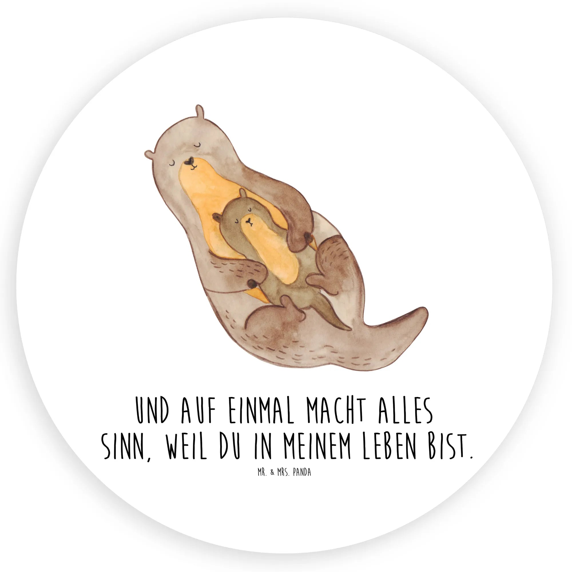 Kannst du dir etwas Friedvolleres vorstellen als ein Otterpaar, ruhig auf dem Wasser treibend? Der erwachsene Otter, behutsam sein Kind auf dem Bauch haltend, ist ein Abbild tiefster elterlicher Liebe. 'Und auf einmal macht alles Sinn, weil du in meinem Leben bist', sagt der Spruch, der dieses hinreißende Motiv von Mr. & Mrs. Panda schmückt. Es ist eine Hommage an die magischen Momente des Lebens, in denen die Anwesenheit eines geliebten Wesens unsere Welt erhellt und uns zeigt, wie wunderschön das Leben sein kann. Dieses Design erinnert uns daran, jeden Moment der Gemeinschaft und Zuneigung zu schätzen.
