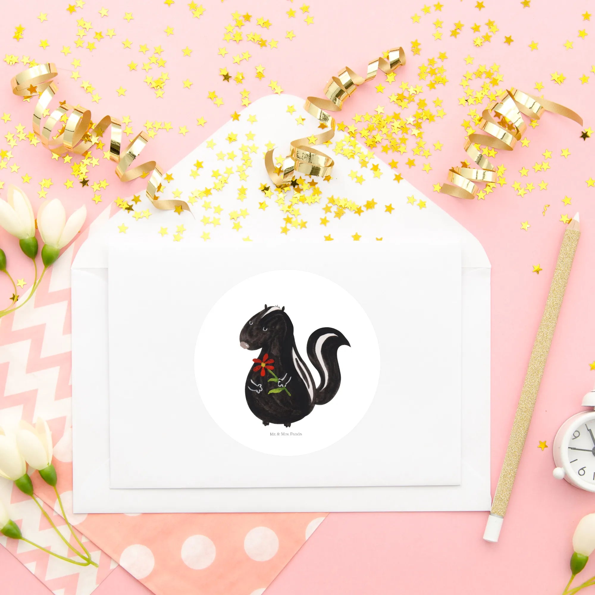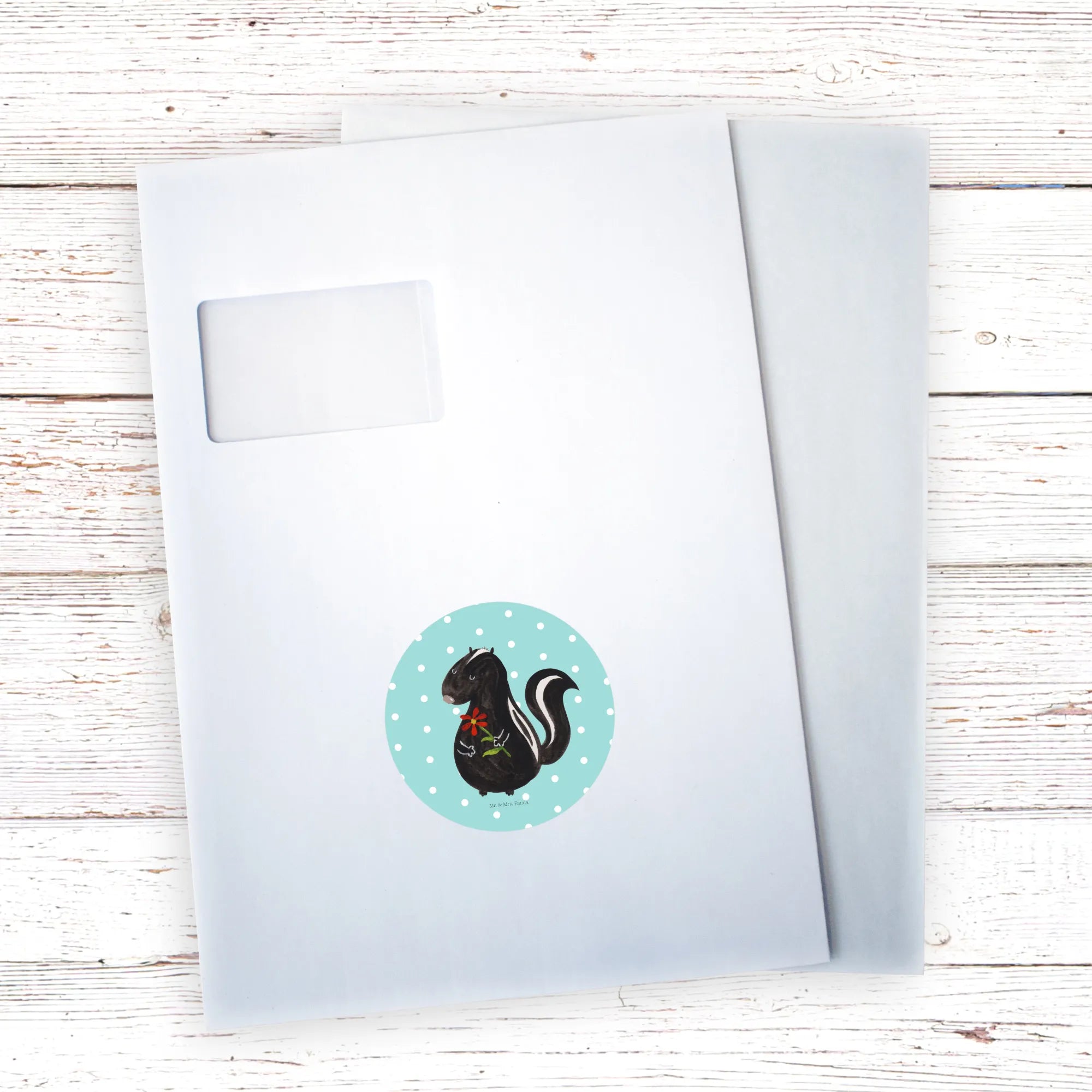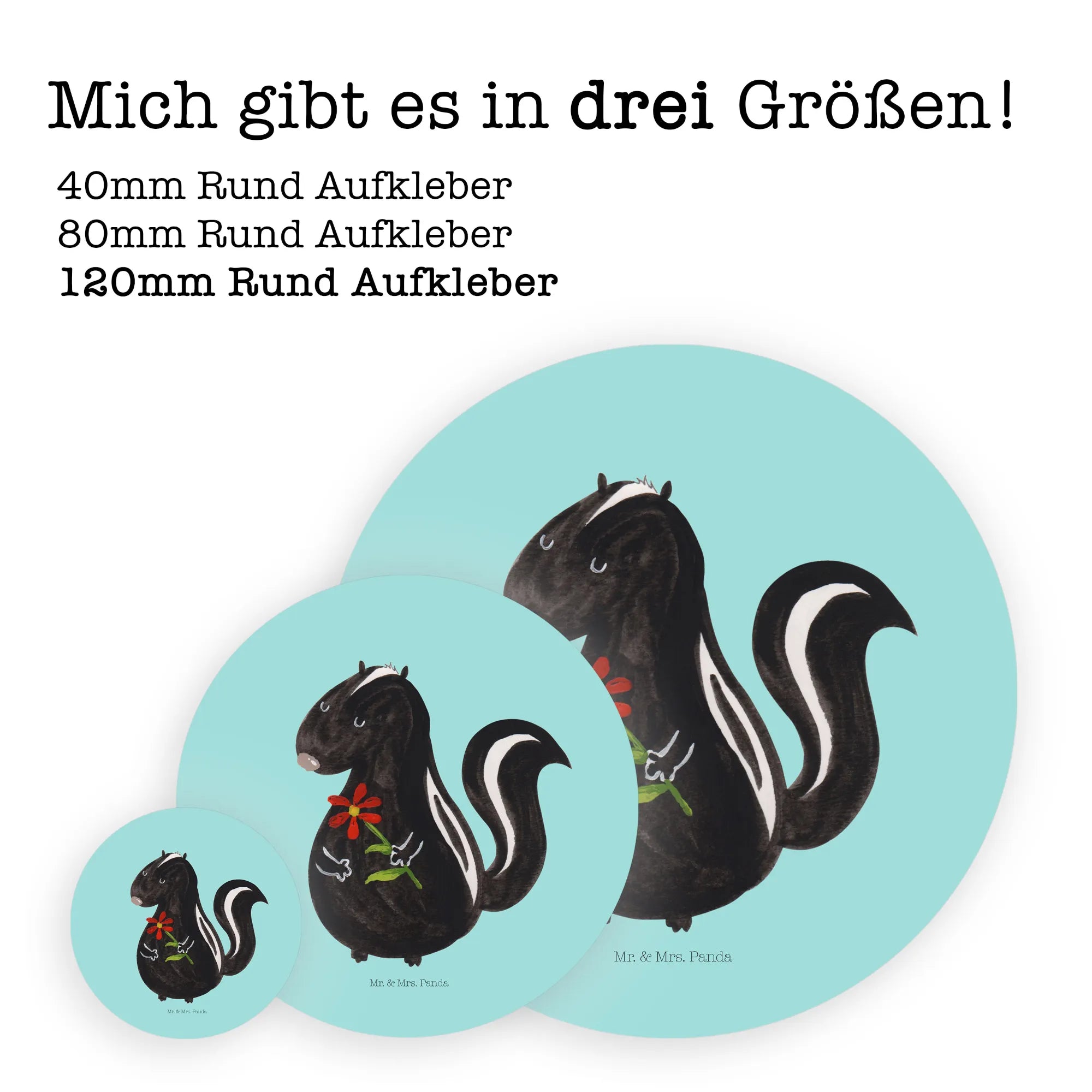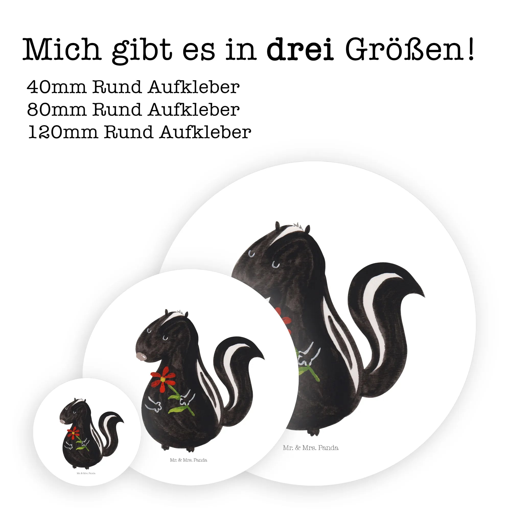 Ein zauberhafter 40 mm Rundaufkleber von Mr. & Mrs. Panda: Das Motiv "Stinktier Blume" aus der Stinktier - Kollektion verzaubert mit einem liebevoll gezeichneten Aquarell-Stinktier und einem bunten Blumenkranz. Das Design ist verspielt, zart und ideal für alle, die ihrem Projekt eine freundliche, verspielte Note geben möchten.