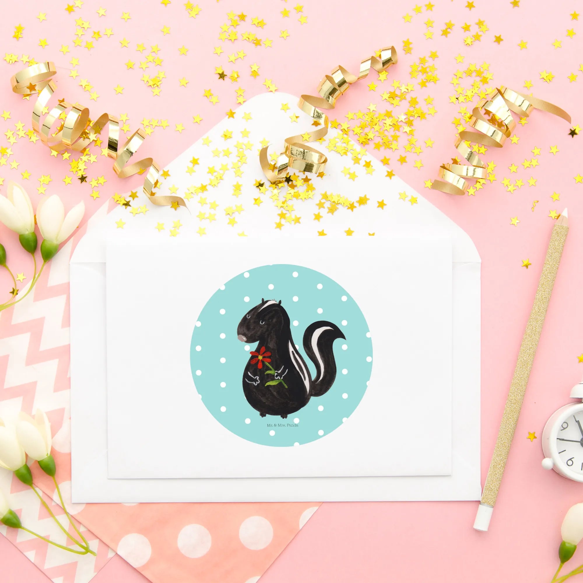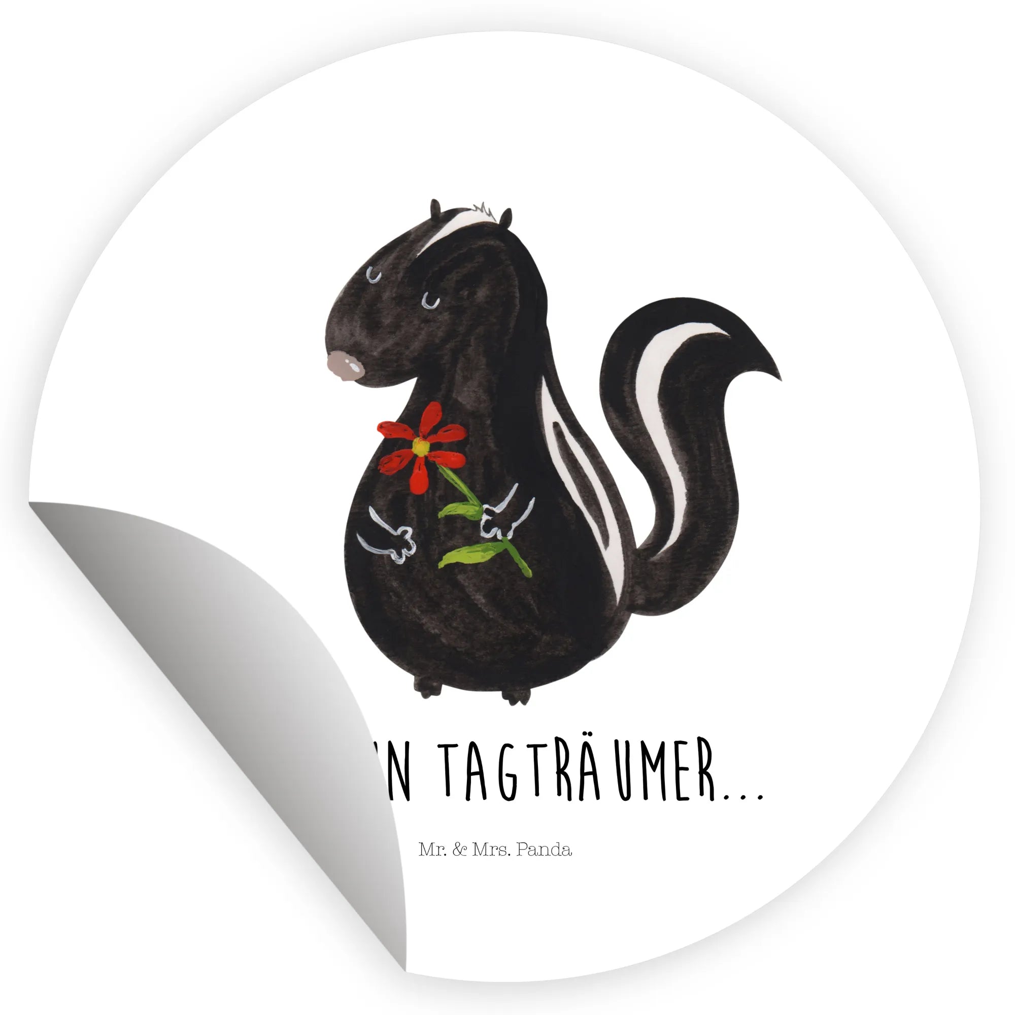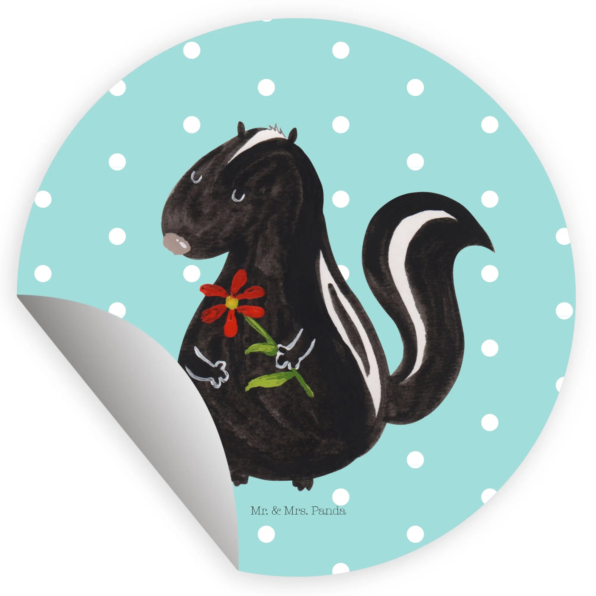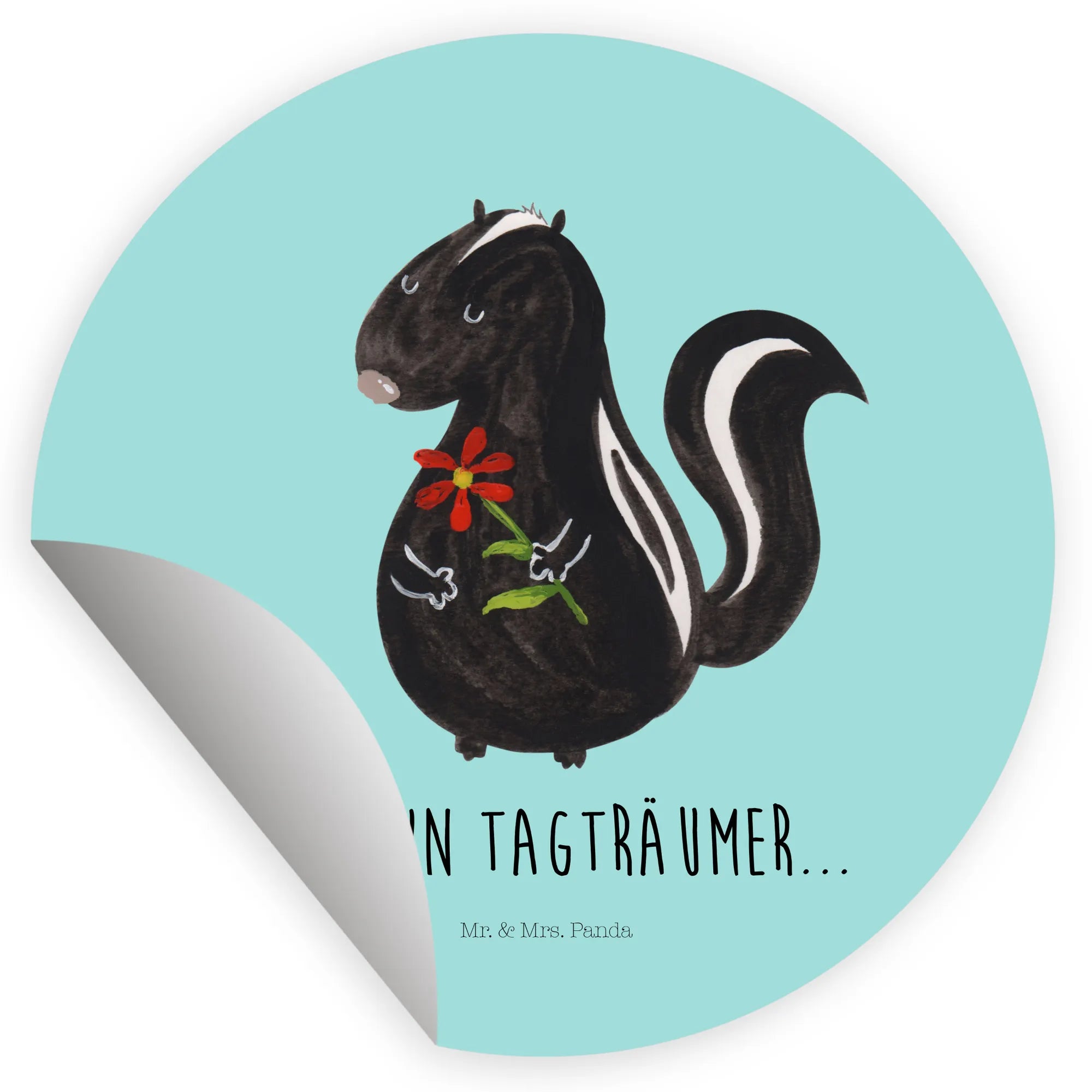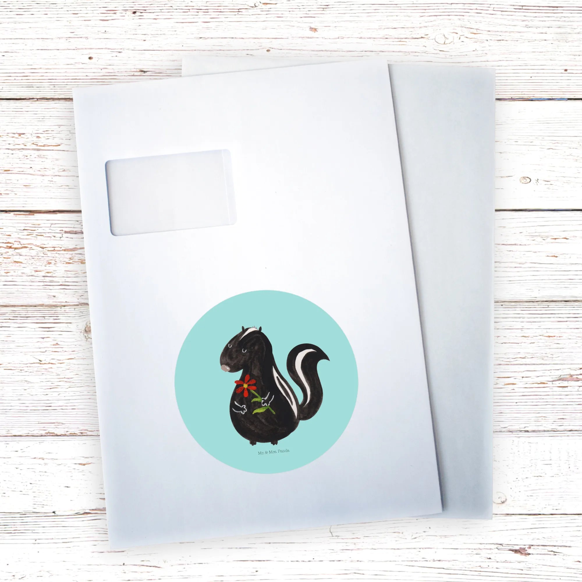 Ein zauberhafter 40 mm Rundaufkleber von Mr. & Mrs. Panda: Das Motiv "Stinktier Blume" aus der Stinktier - Kollektion verzaubert mit einem liebevoll gezeichneten Aquarell-Stinktier und einem bunten Blumenkranz. Das Design ist verspielt, zart und ideal für alle, die ihrem Projekt eine freundliche, verspielte Note geben möchten.