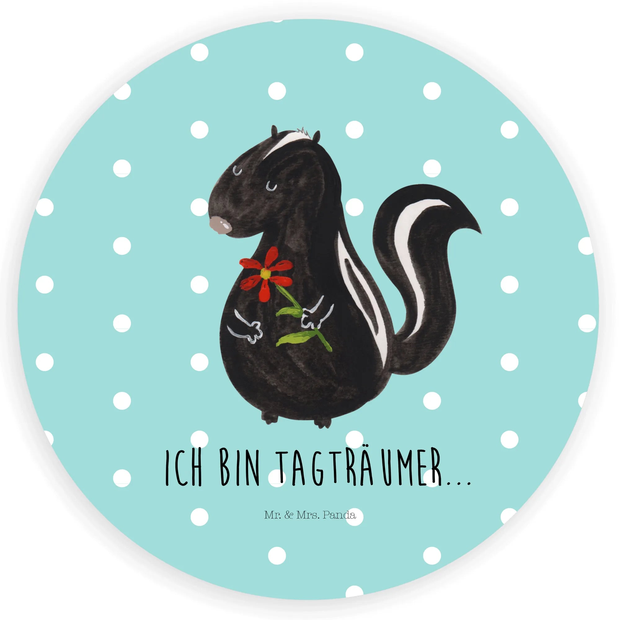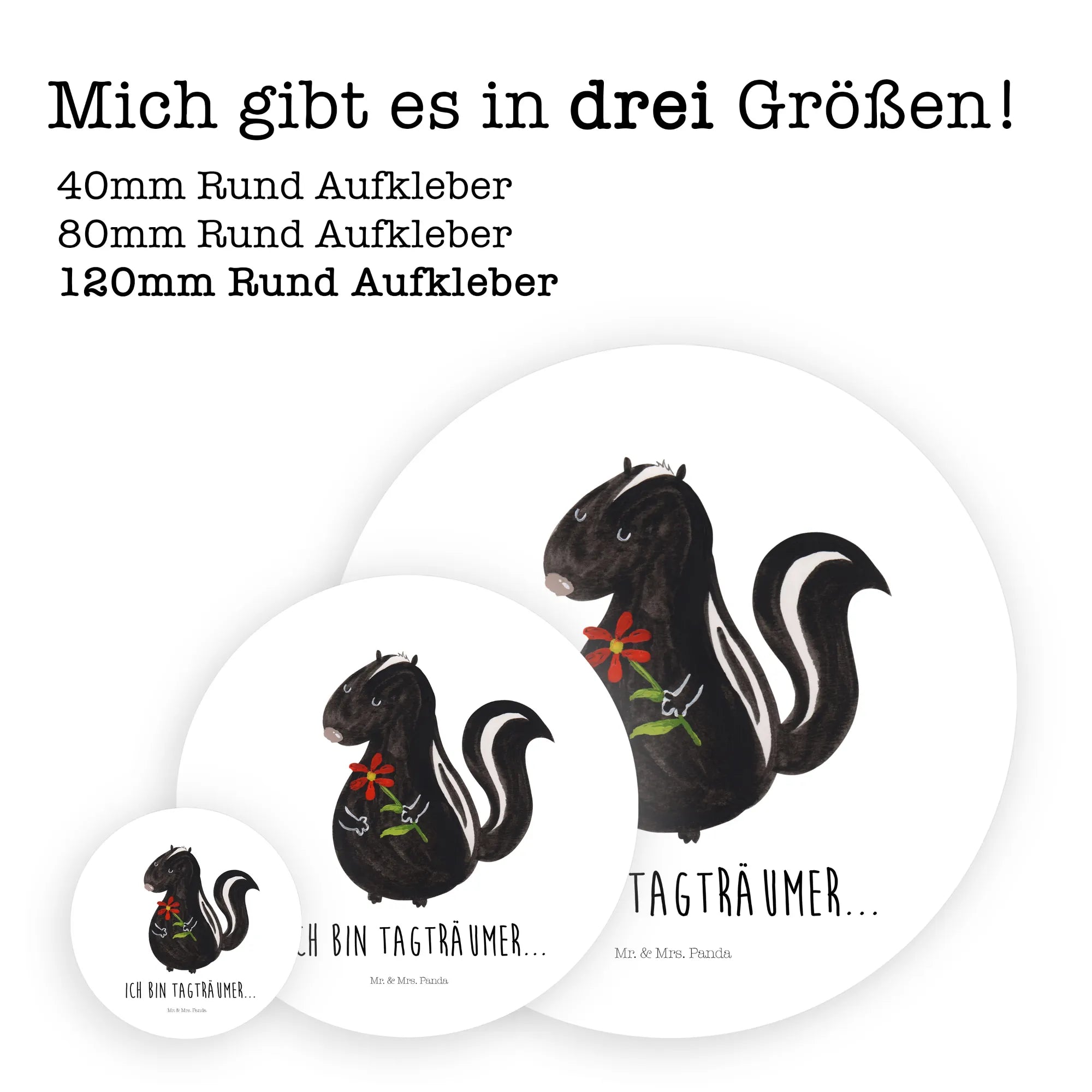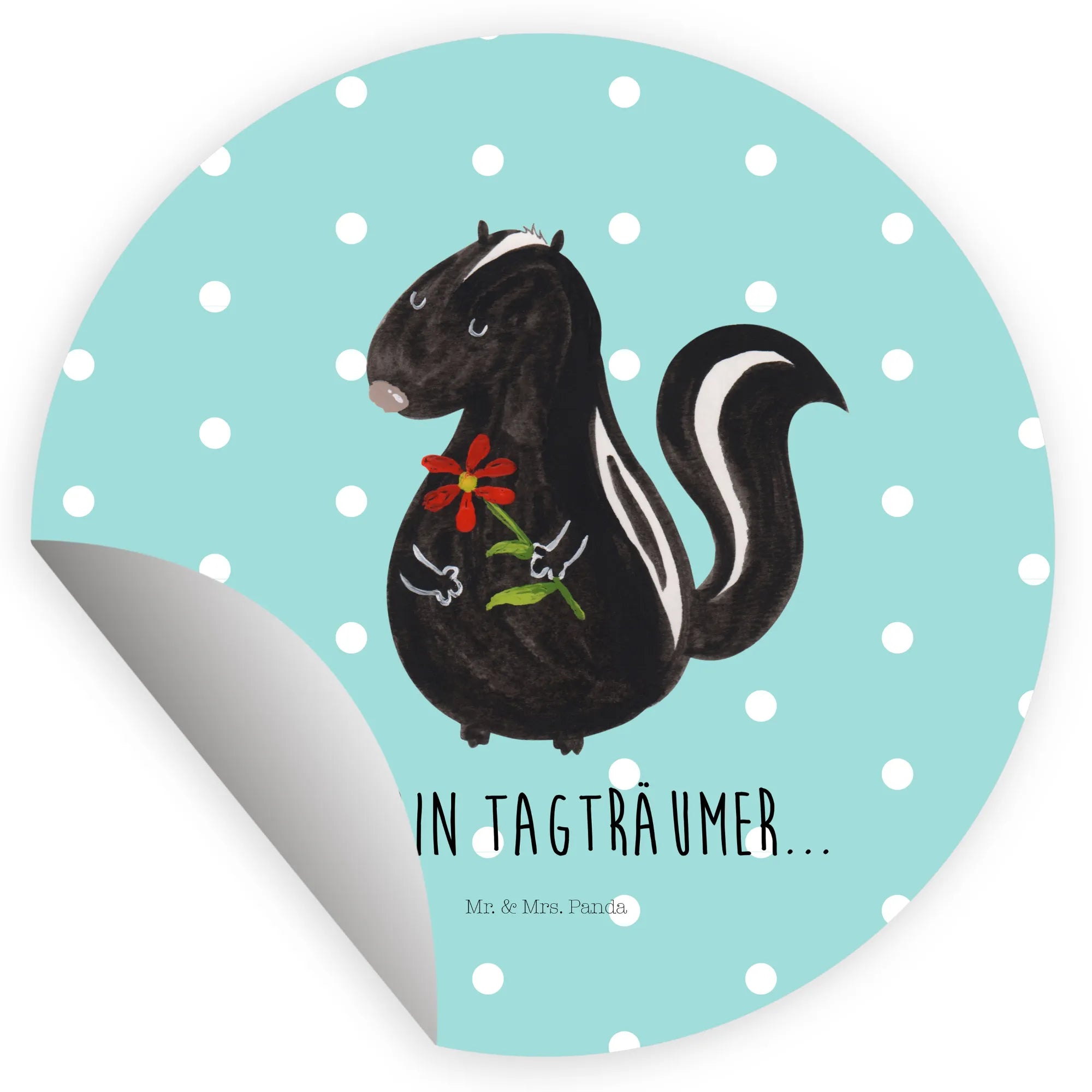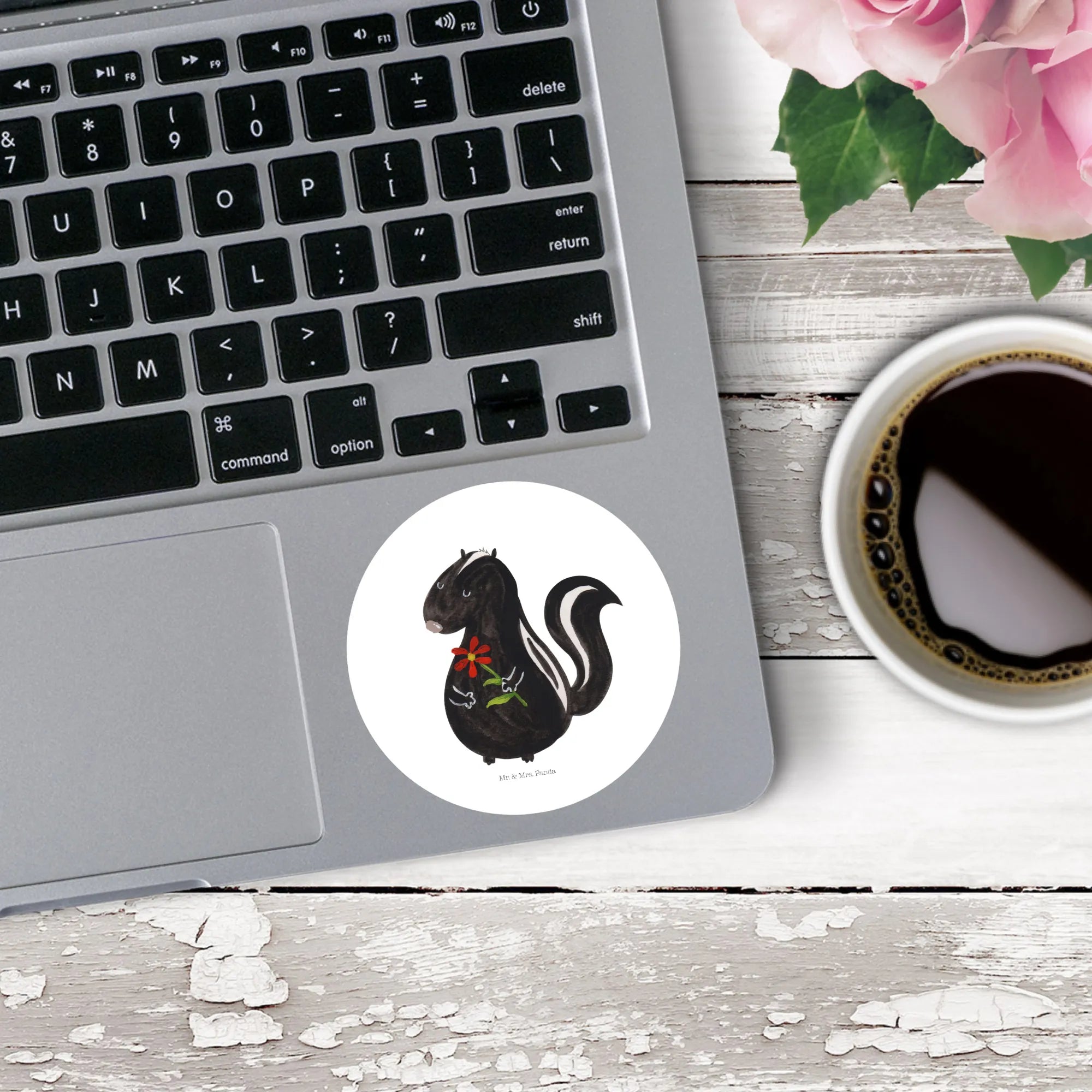 Ein zauberhafter 40 mm Rundaufkleber von Mr. & Mrs. Panda: Das Motiv "Stinktier Blume" aus der Stinktier - Kollektion verzaubert mit einem liebevoll gezeichneten Aquarell-Stinktier und einem bunten Blumenkranz. Das Design ist verspielt, zart und ideal für alle, die ihrem Projekt eine freundliche, verspielte Note geben möchten.