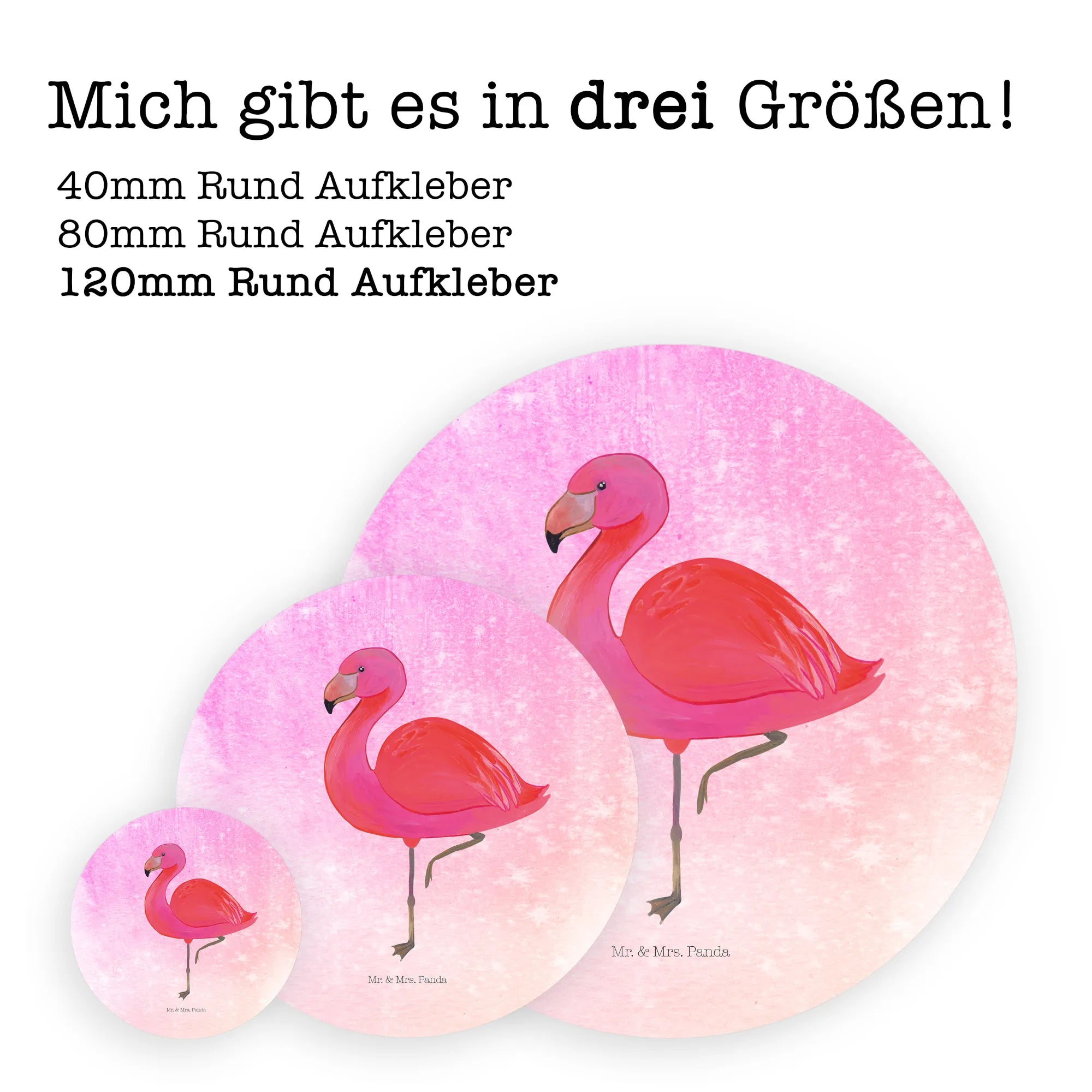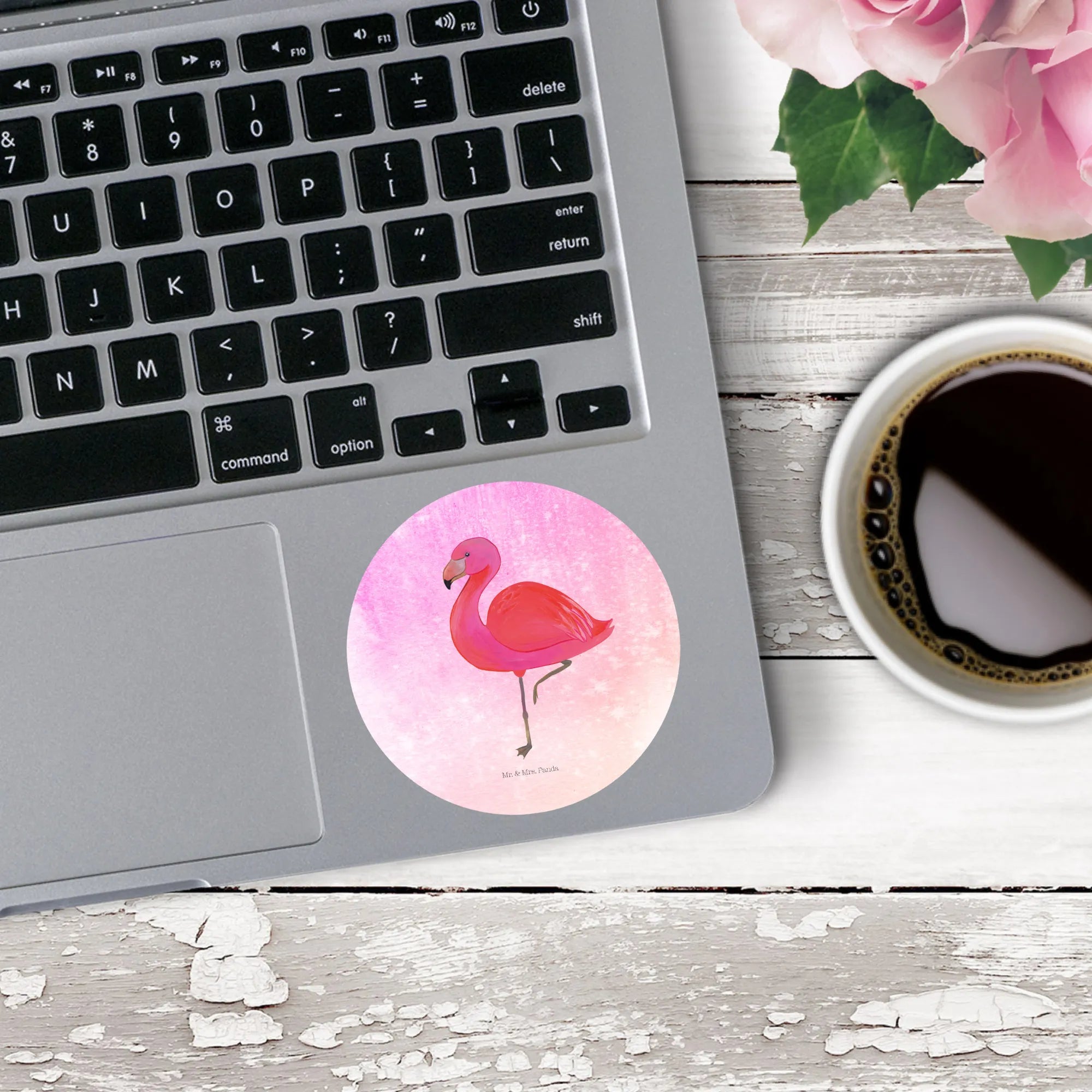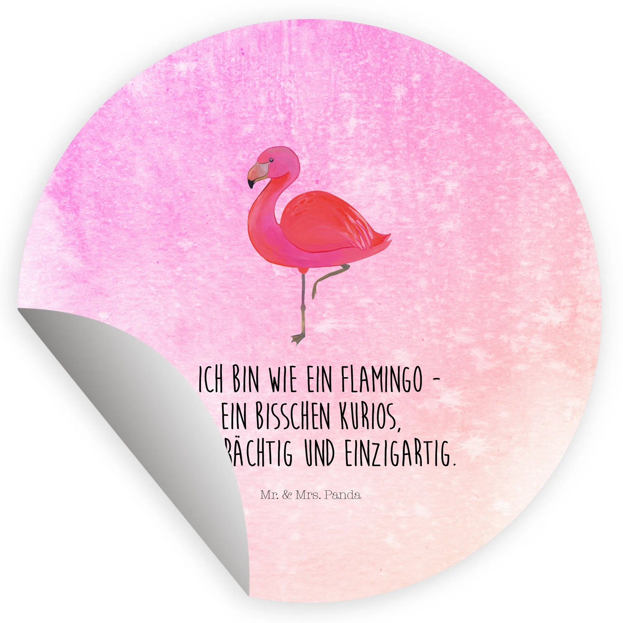 Dank der hochwertigen Premium Folie ist der Aufkleber besonders langlebig und edel bedruckt, sodass die handgezeichnete Aquarell-Illustration von Mrs. Panda in ihren vollen Rosatönen erstrahlt. Die Anwendung ist kinderleicht: Die runden Sticker kleben auf fast allen glatten Untergründen. Ob als Deko Aufkleber auf einer Grußkarte oder als Kalender Sticker – der Flamingo classic macht überall eine gute Figur. ✨