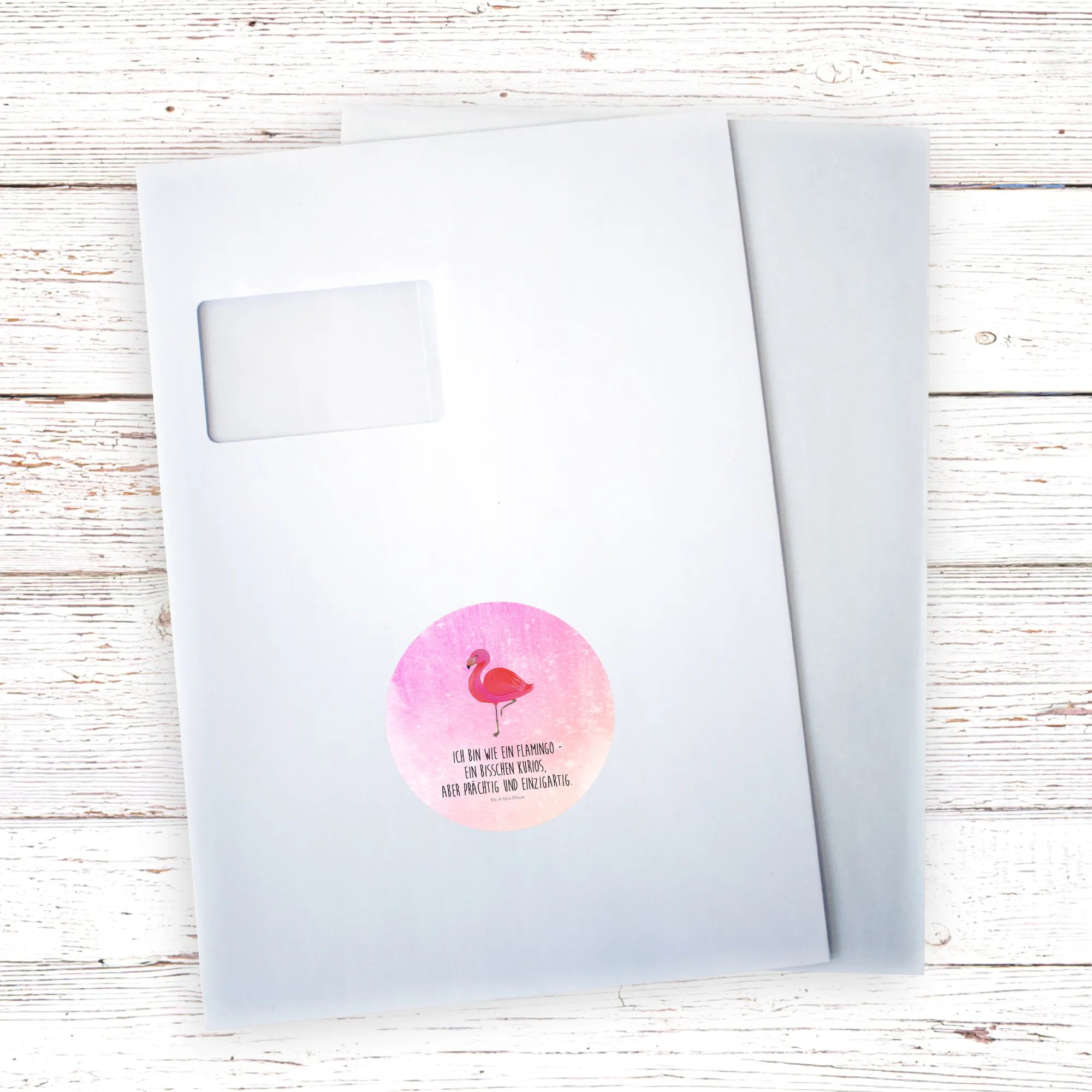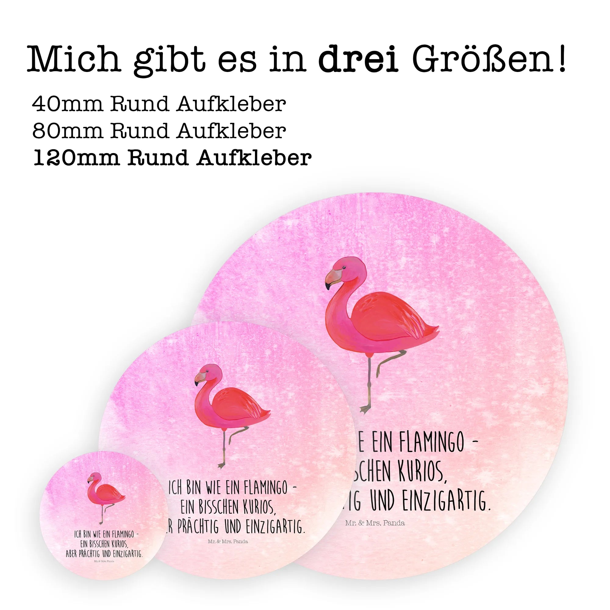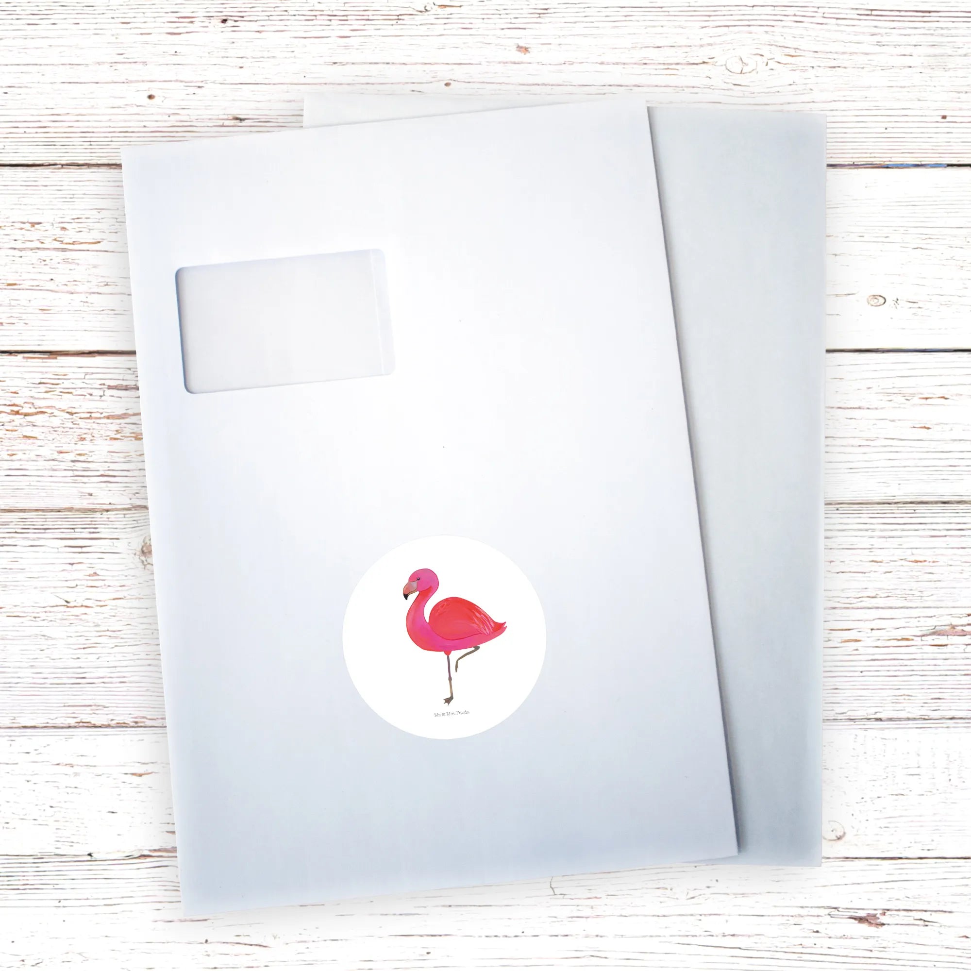 Dank der hochwertigen Premium Folie ist der Aufkleber besonders langlebig und edel bedruckt, sodass die handgezeichnete Aquarell-Illustration von Mrs. Panda in ihren vollen Rosatönen erstrahlt. Die Anwendung ist kinderleicht: Die runden Sticker kleben auf fast allen glatten Untergründen. Ob als Deko Aufkleber auf einer Grußkarte oder als Kalender Sticker – der Flamingo classic macht überall eine gute Figur. ✨