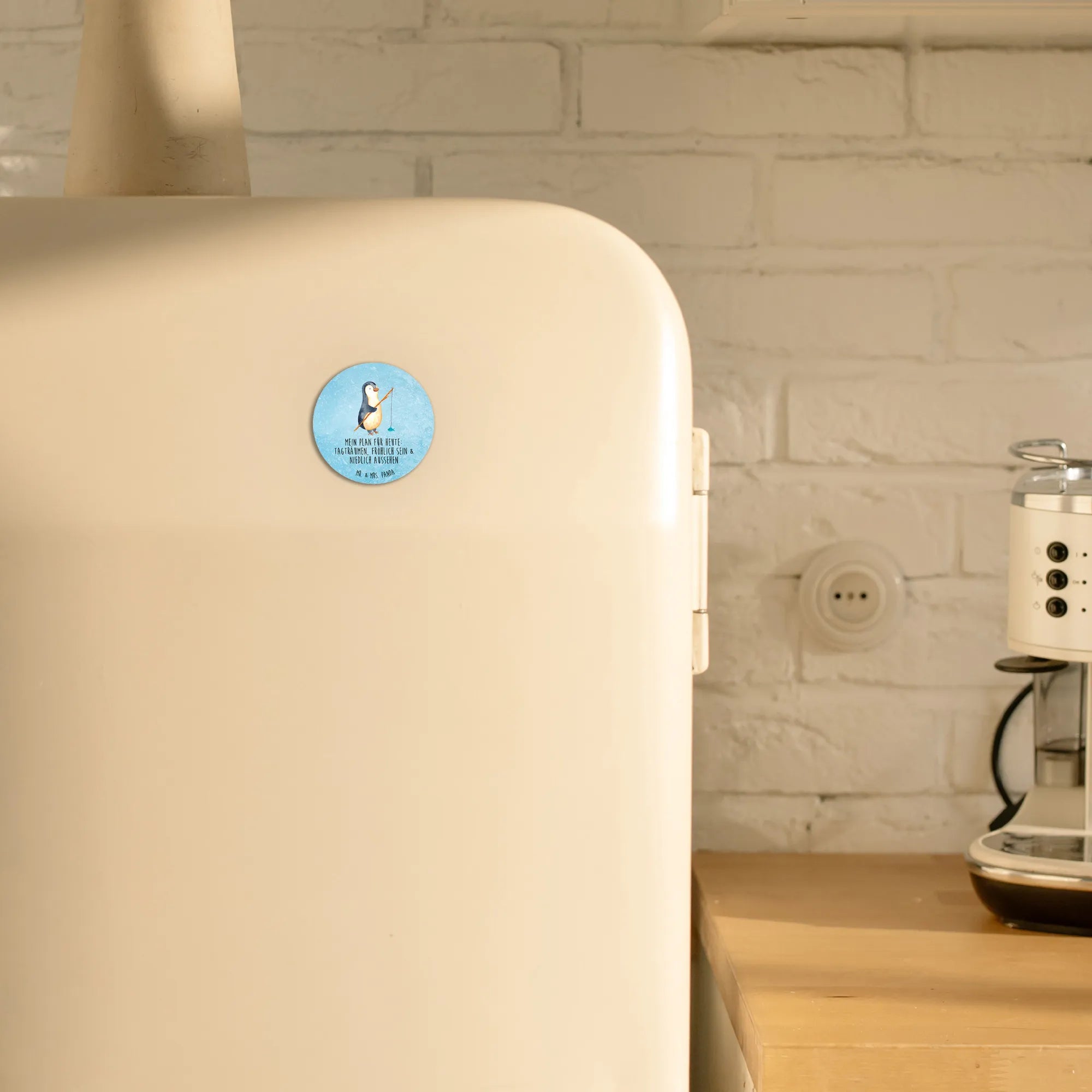 \nLass deinen Tagträumen freien Lauf, in dem du diesen fröhlichen Pinguin in dein Leben und in deine Wohnung einlädst. Hol dir jetzt diesen besonderen Rund Magnet und verleihe deinen Kühlschrank oder deine Pinnwand einen einzigartigen Charme! Ein Geschenk von Mr. & Mrs. Panda, das niemanden kalt lässt – natürlich auch nicht dich!