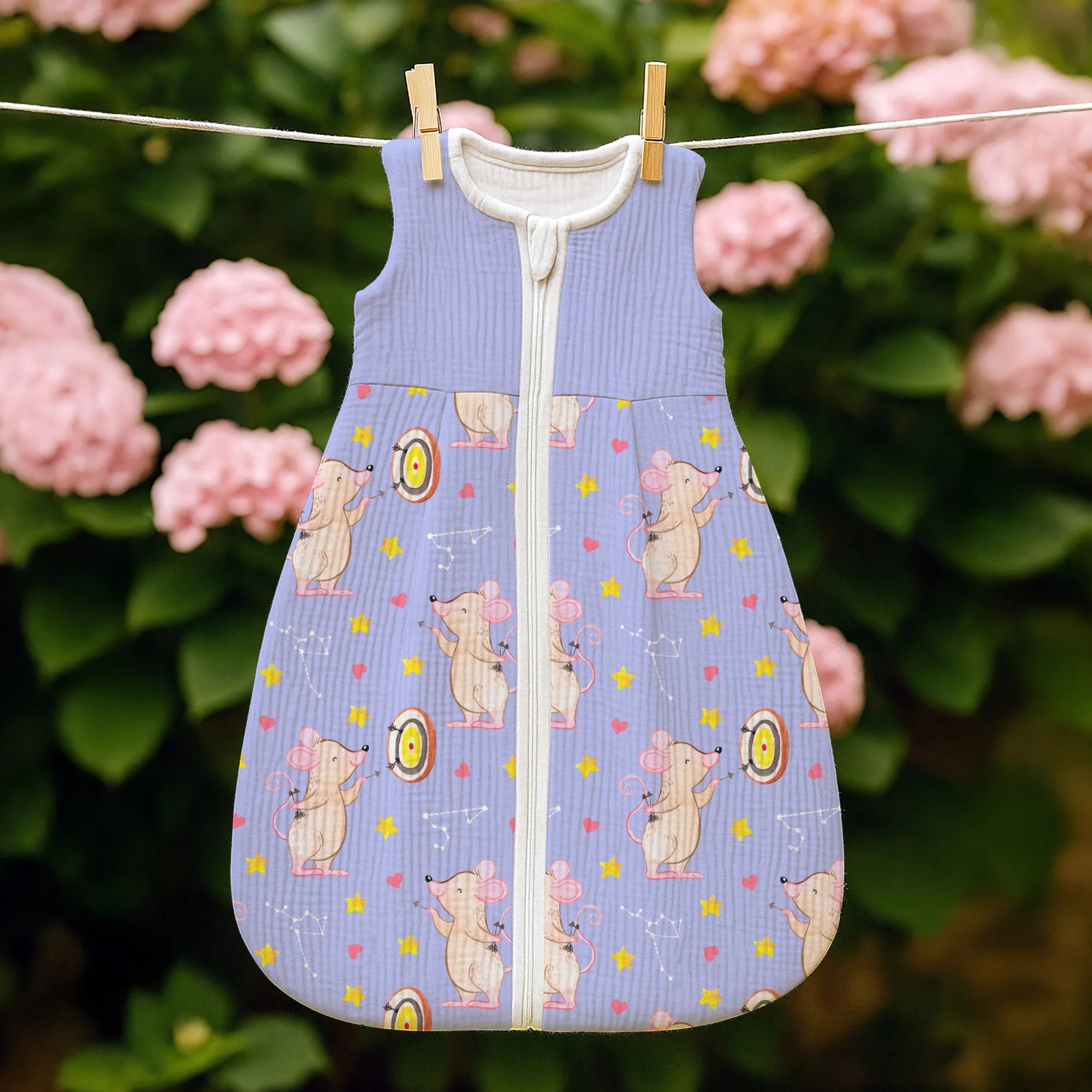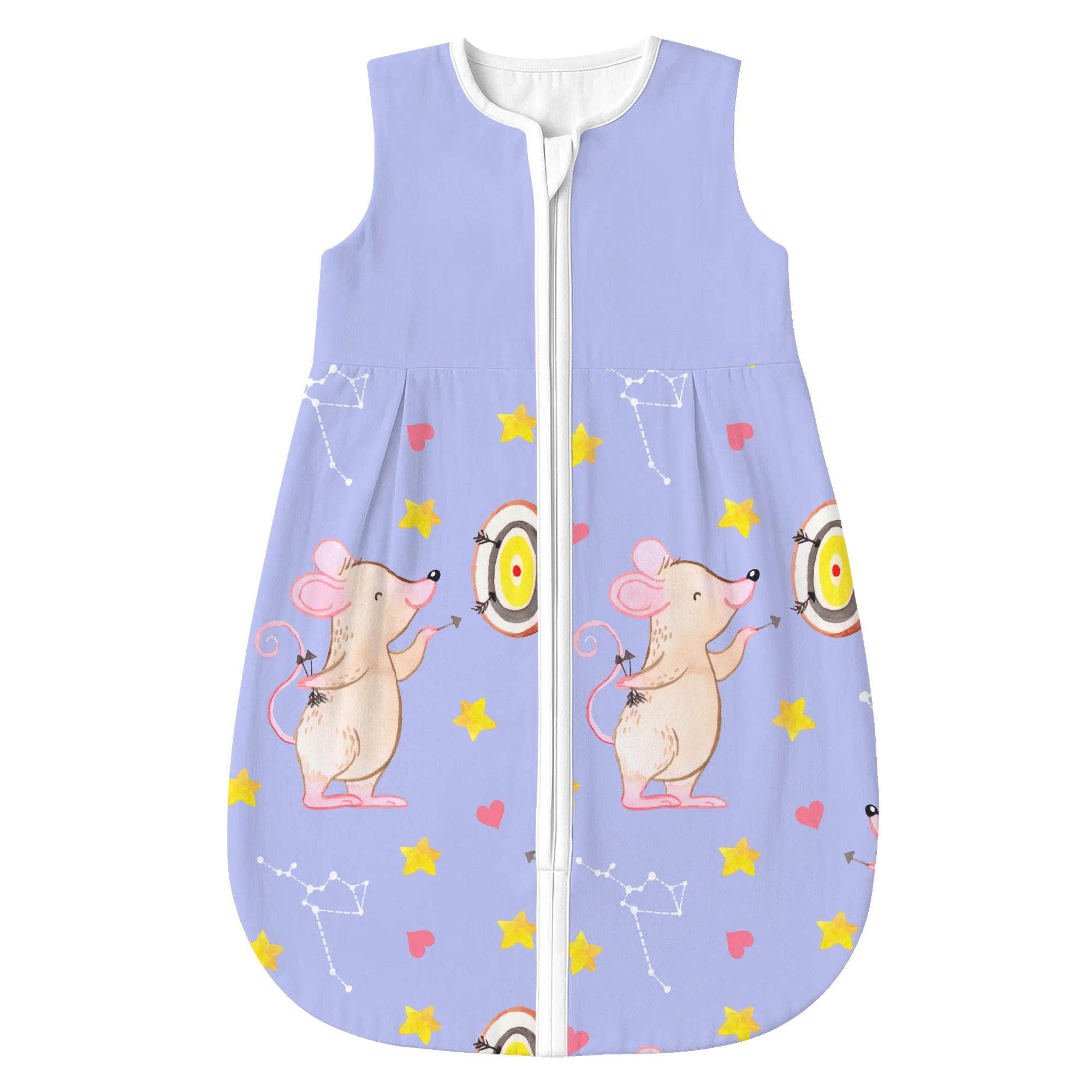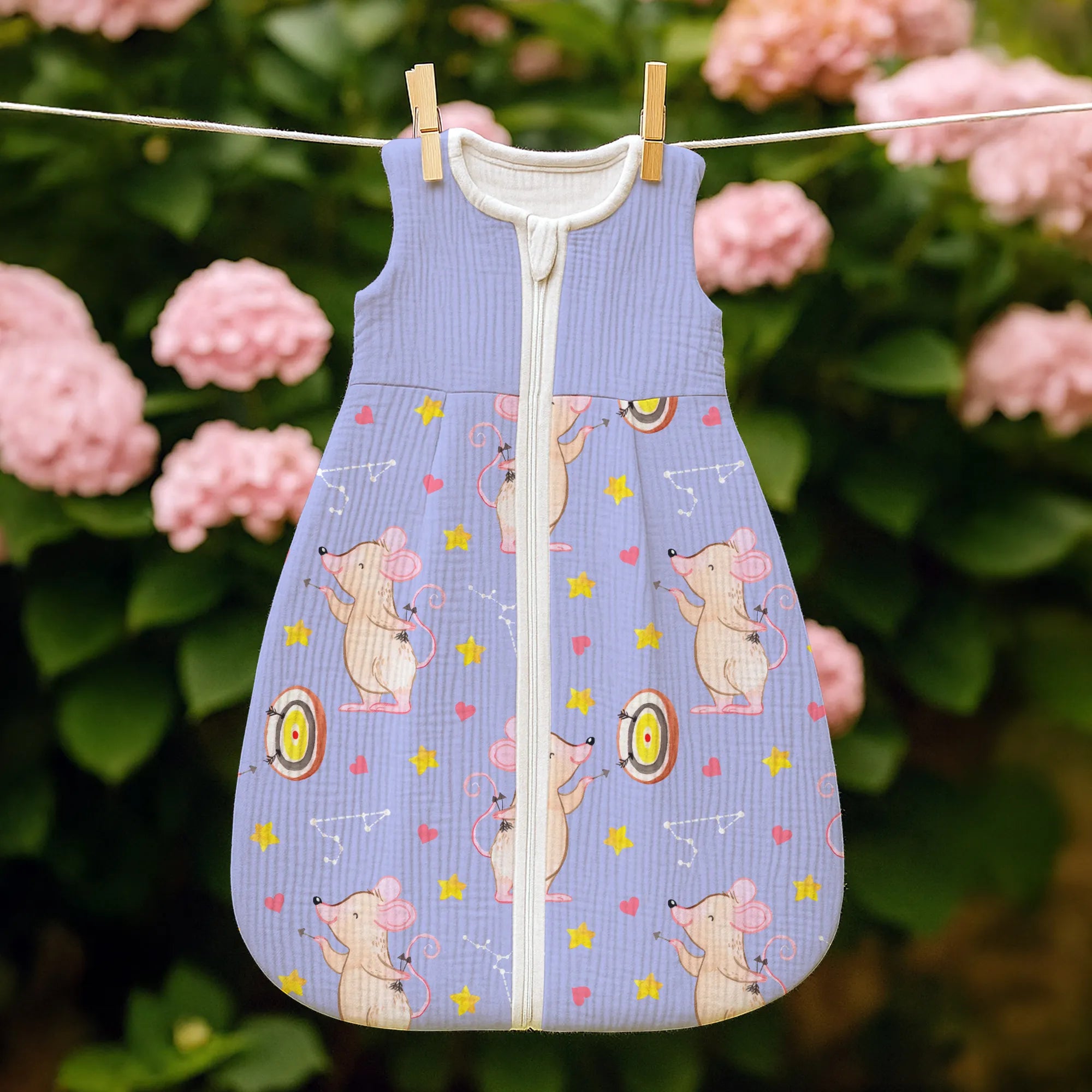 Ein besonderes Highlight ist der praktische Reißverschluss, der weit nach unten reicht. So wird das nächtliche Wickeln zum Kinderspiel, ohne dass du dein Baby komplett ausziehen musst. Jedes Motiv bei Mr. & Mrs. Panda wird von Mrs. Panda mit viel Liebe zum Detail in Aquarell handgemalt. Das merkt man auch der kleinen Dart-Maus an, die mit ihrem Pfeil genau ins Schwarze trifft. 🎨