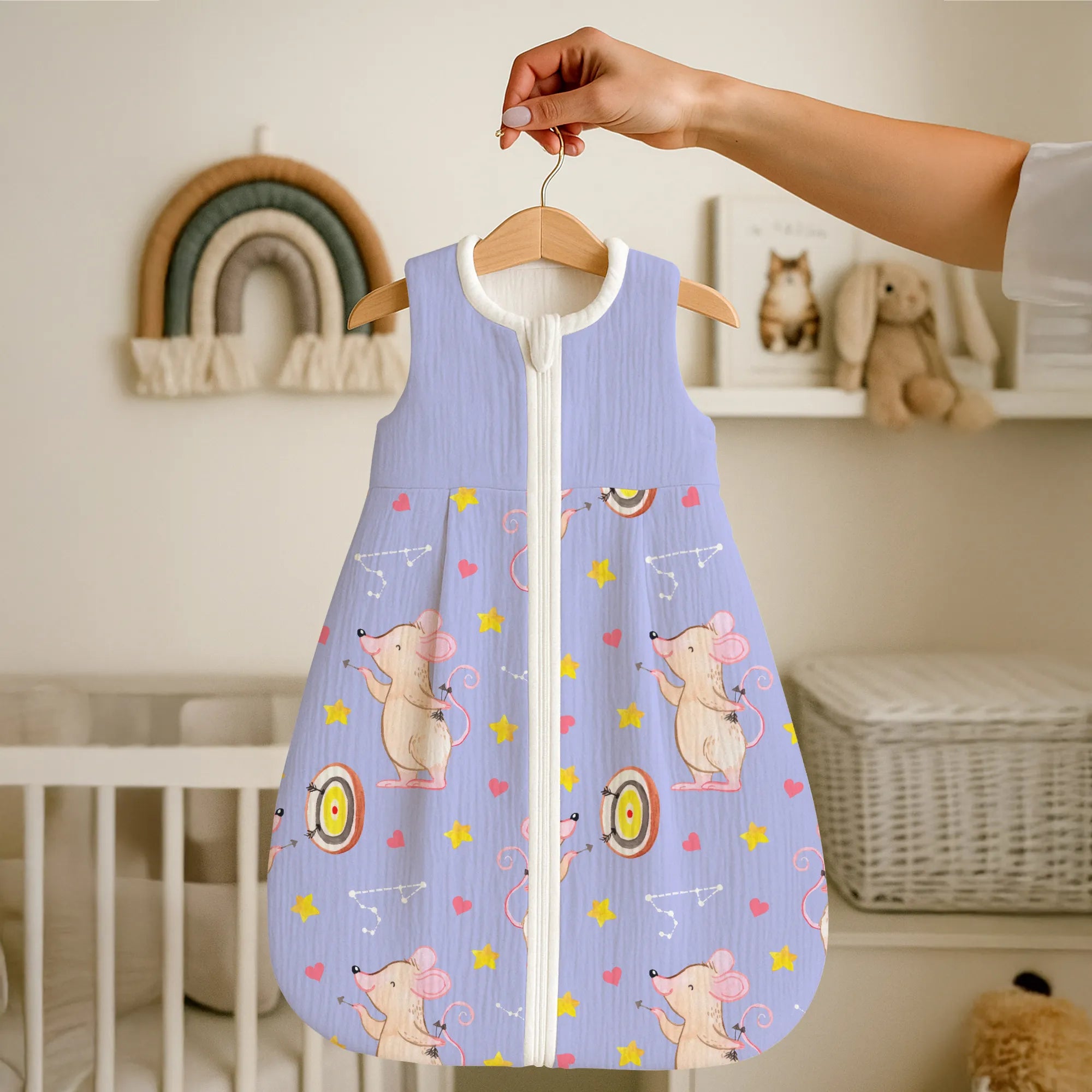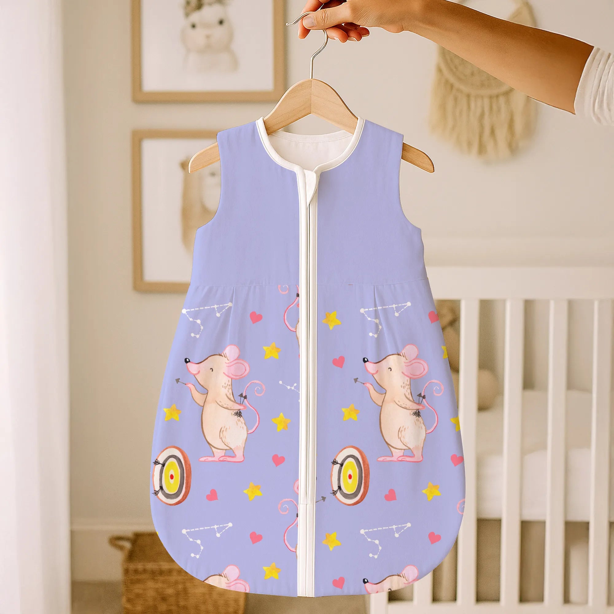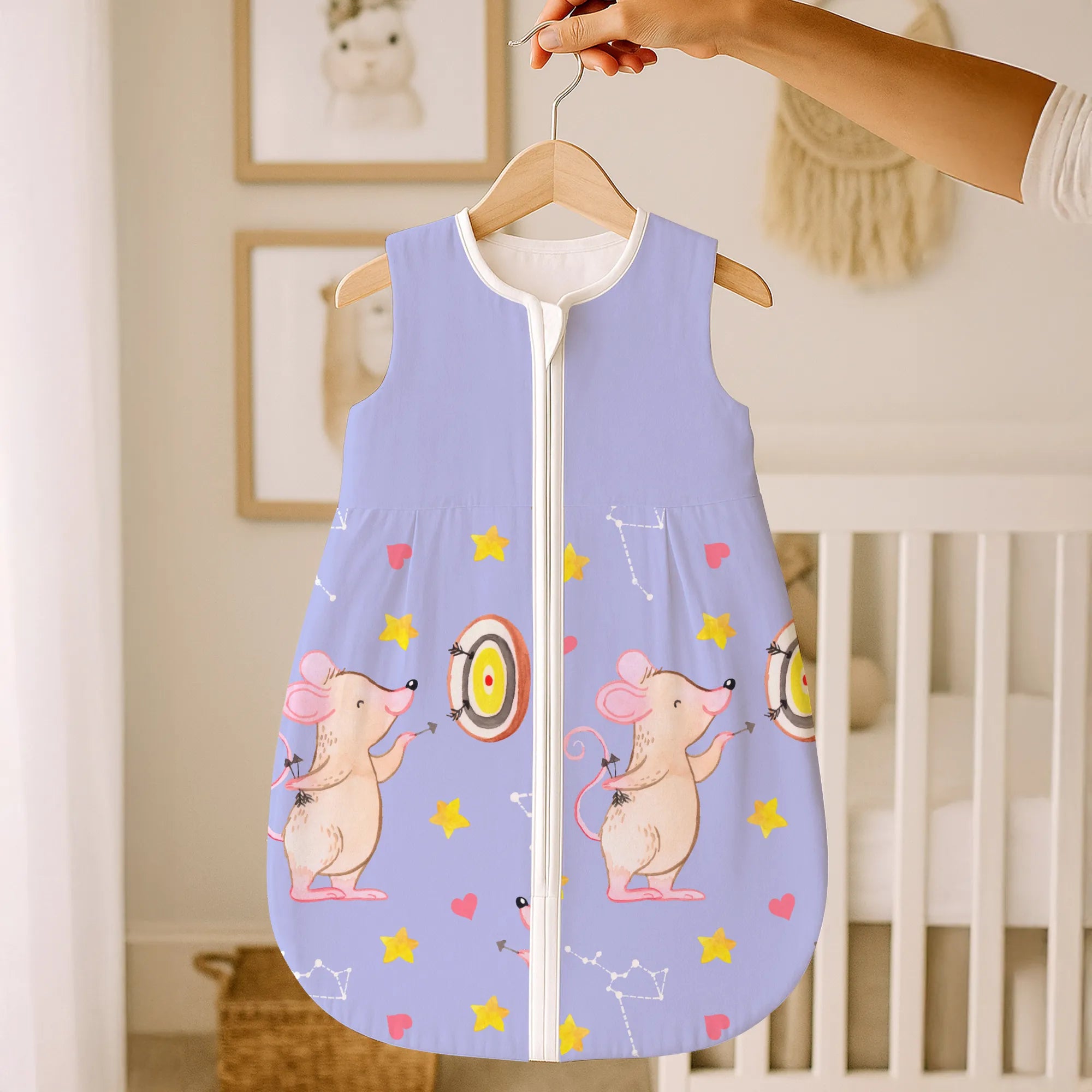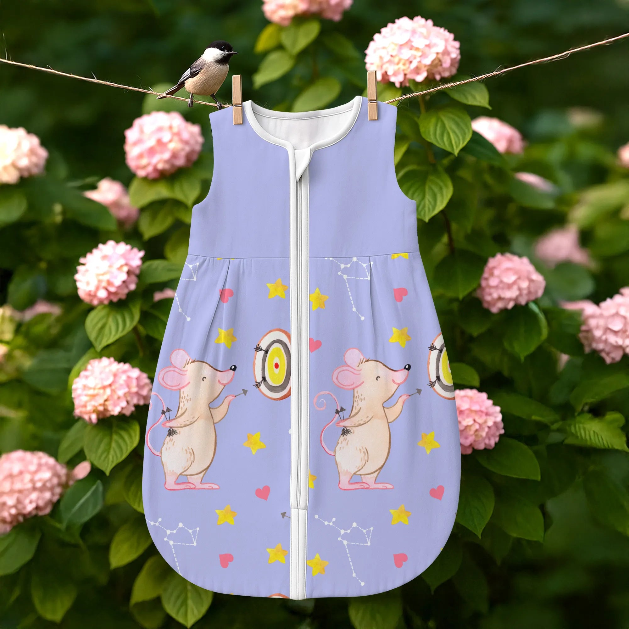Ein besonderes Highlight ist der praktische Reißverschluss, der weit nach unten reicht. So wird das nächtliche Wickeln zum Kinderspiel, ohne dass du dein Baby komplett ausziehen musst. Jedes Motiv bei Mr. & Mrs. Panda wird von Mrs. Panda mit viel Liebe zum Detail in Aquarell handgemalt. Das merkt man auch der kleinen Dart-Maus an, die mit ihrem Pfeil genau ins Schwarze trifft. 🎨