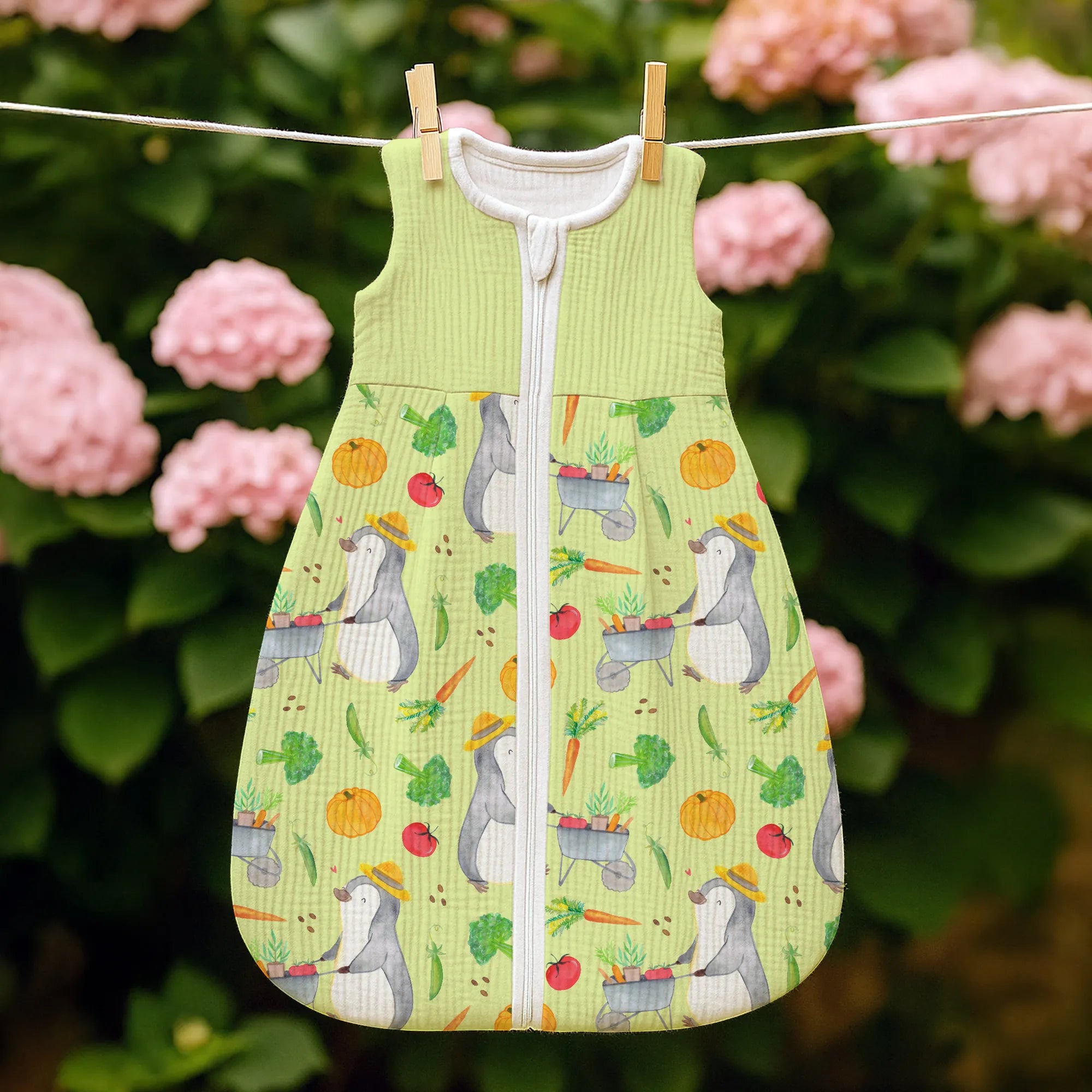 Unser Schlafsack Baby mit dem entzückenden Pinguin-Motiv aus der Hobby & Sport Kollektion ist mehr als nur eine Schlafbekleidung; es ist ein liebevolles Versprechen für Geborgenheit und Wärme. Das Motiv zeigt einen kleinen, süßen Pinguin mit einem gelben Sonnenhut auf dem Kopf, der stolz eine Schubkarre voller frischem Gemüse schiebt. 🐧🥕 Es ist eine Hommage an die Gartenarbeit und das Gärtnern – Tätigkeiten, die so viel Ruhe und Freude schenken.