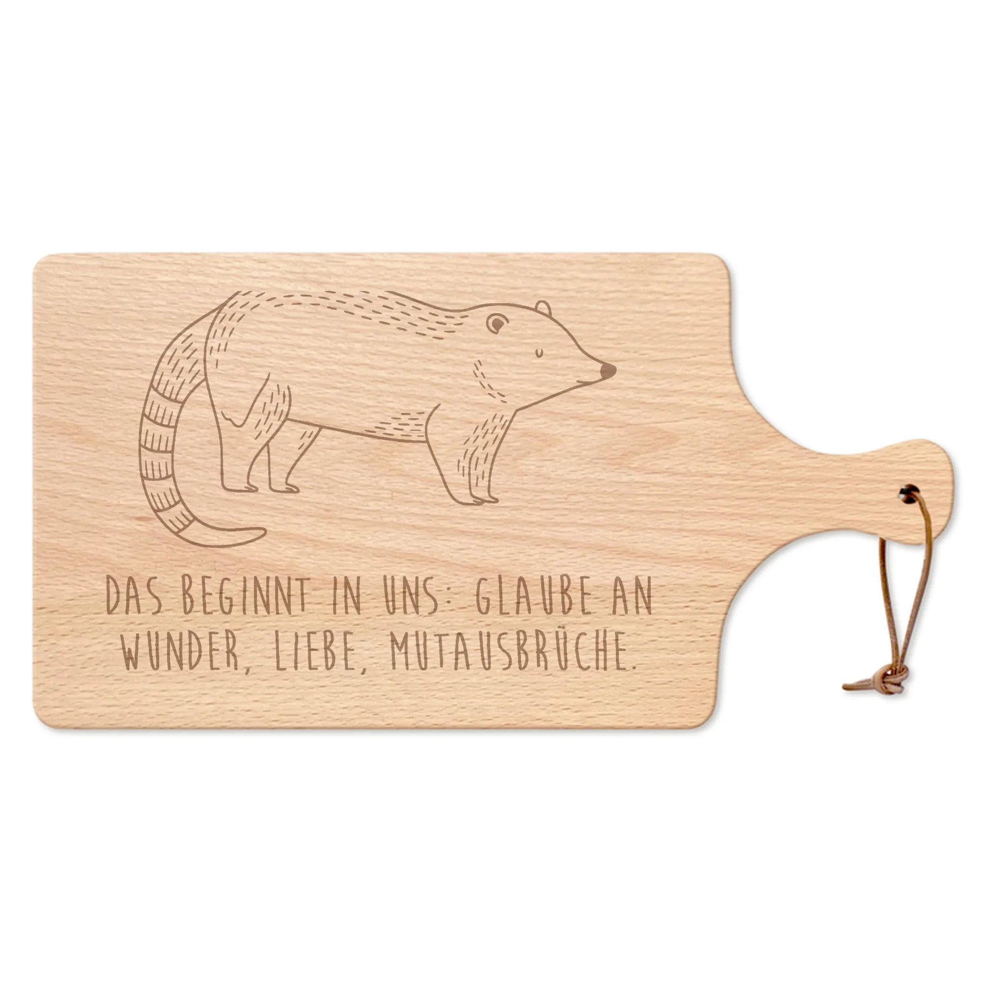 Stellen Sie sich einen kleinen Nasenbär vor - mit seinem charakteristischen langen Rüssel und den strahlend großen Augen, die Neugierde und Abenteuerlust versprühen. In der Welt von Mr. & Mrs. Panda wird dieser Nasenbär zu einem Symbol für die kleinen Wunder des Alltags. Er erinnert uns daran, dass es die unscheinbaren Momente sind, die unser Leben bereichern. Der Spruch 'Das beginnt in uns: Glaube an Wunder, Liebe, Mutausbrüche' ist nicht nur eine Aufforderung zum Träumen, sondern auch zum mutigen Ergreifen dieser Momente. Mit einem liebevollen Blick auf das Leben inspiriert das Motiv dazu, jeden Tag als eine neue Gelegenheit zu sehen, das Wunderbare im Gewöhnlichen zu entdecken.