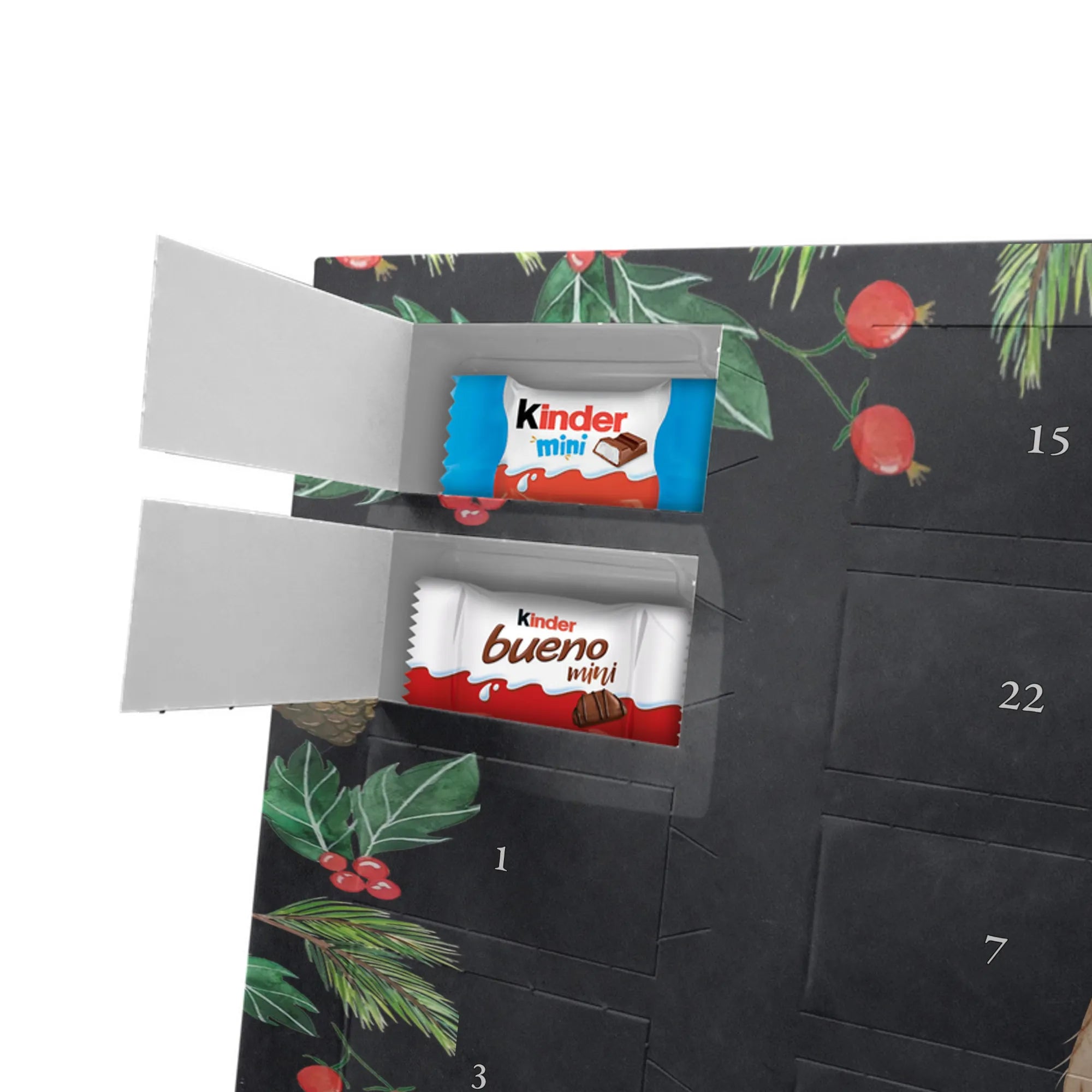 Schoko Adventskalender von Mr. & Mrs. Panda – die charmante Art, sich oder anderen die Adventszeit zu versüßen. Der Kalender ist bedruckt mit wunderschönen Motiven & Sprüchen von Mr. & Mrs. Panda und nicht personalisierbar. Wir legen Wert auf brillante Druckqualität mit seidenmatter Oberflächenveredelung sowie auf bedruckte Seitenflächen für ein stimmiges Gesamtbild. Maße: 355 mm x 245 mm x 11 mm. Besonders praktisch: kann aufgehängt oder aufgestellt werden und passt so in jede Wohnung. Gefüllt mit Markenname Schokolade: Adventskalender gefüllt mit kinder® Schokolade. Inhalt: kinder® Schoko-Bons, kinder® Bueno mini und kinder® Schokolade mini. Die 24 Türchen sind mit kleinen Schoko-Überraschungen bestückt und schaffen jeden Tag Vorfreude. Ob als Geschenk für Kinder, Partner oder als nette Aufmerksamkeit für Kolleginnen und Kollegen – dieser Kalender macht Freude. Robust, schön gestaltet und sofort einsatzbereit für die süßeste Zeit des Jahres!