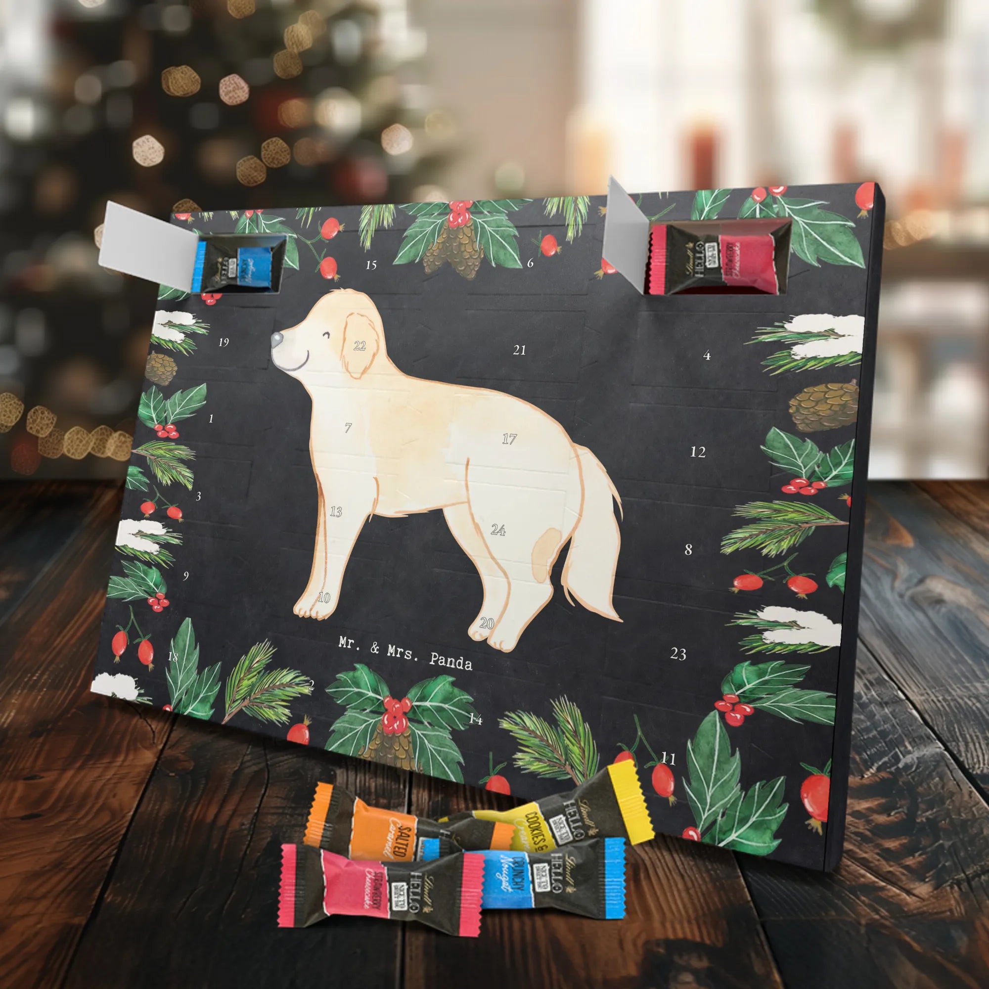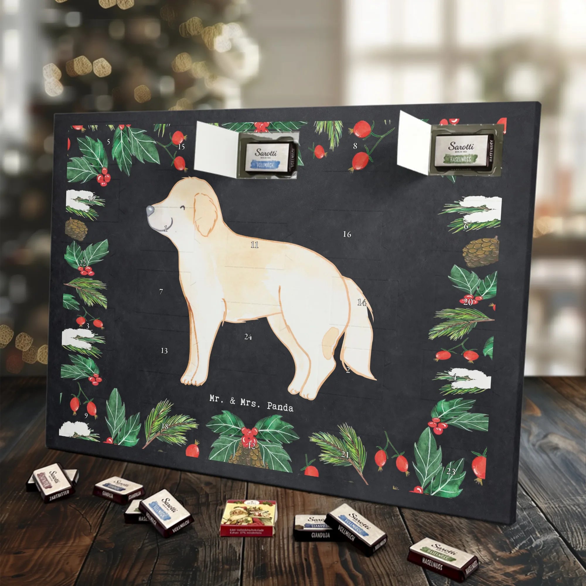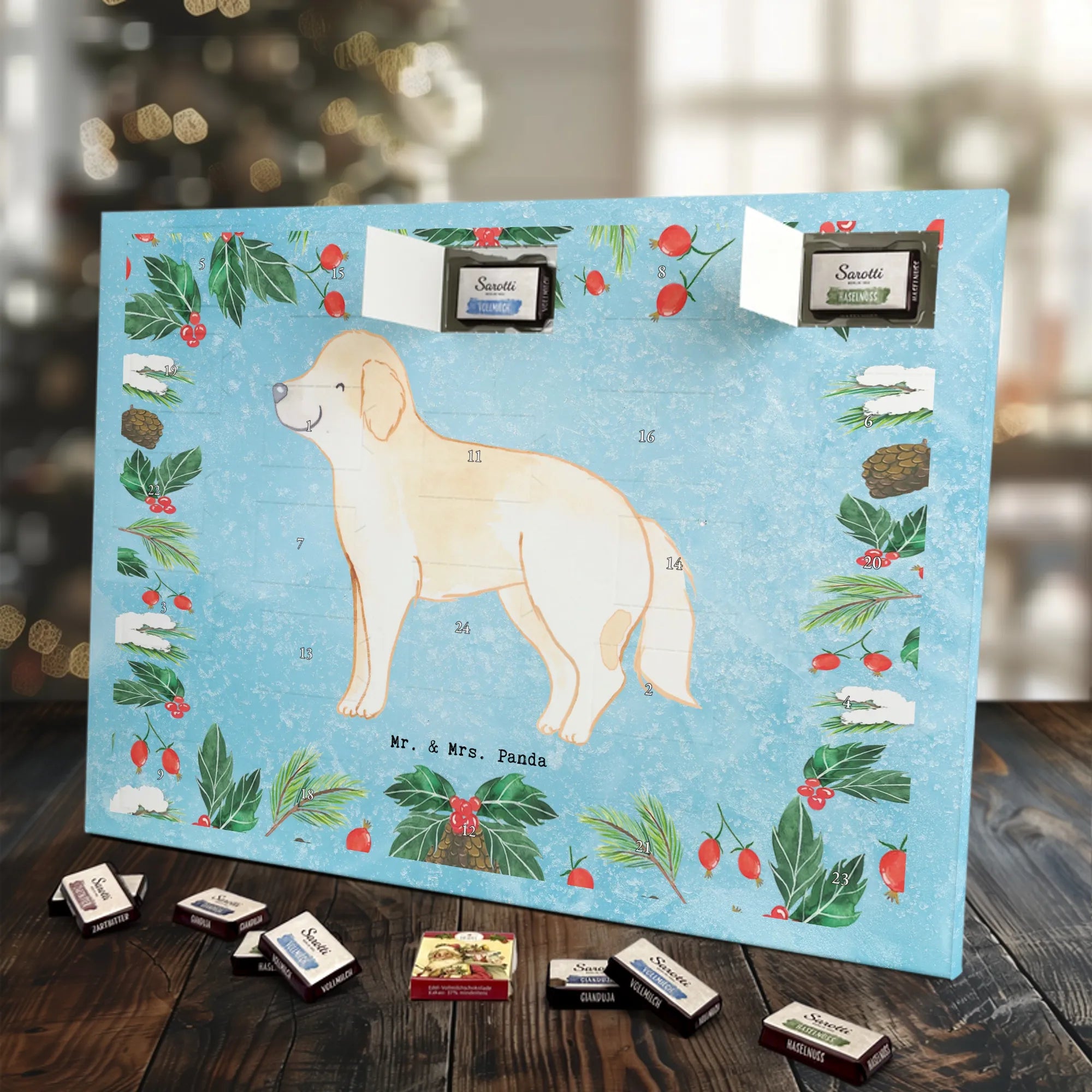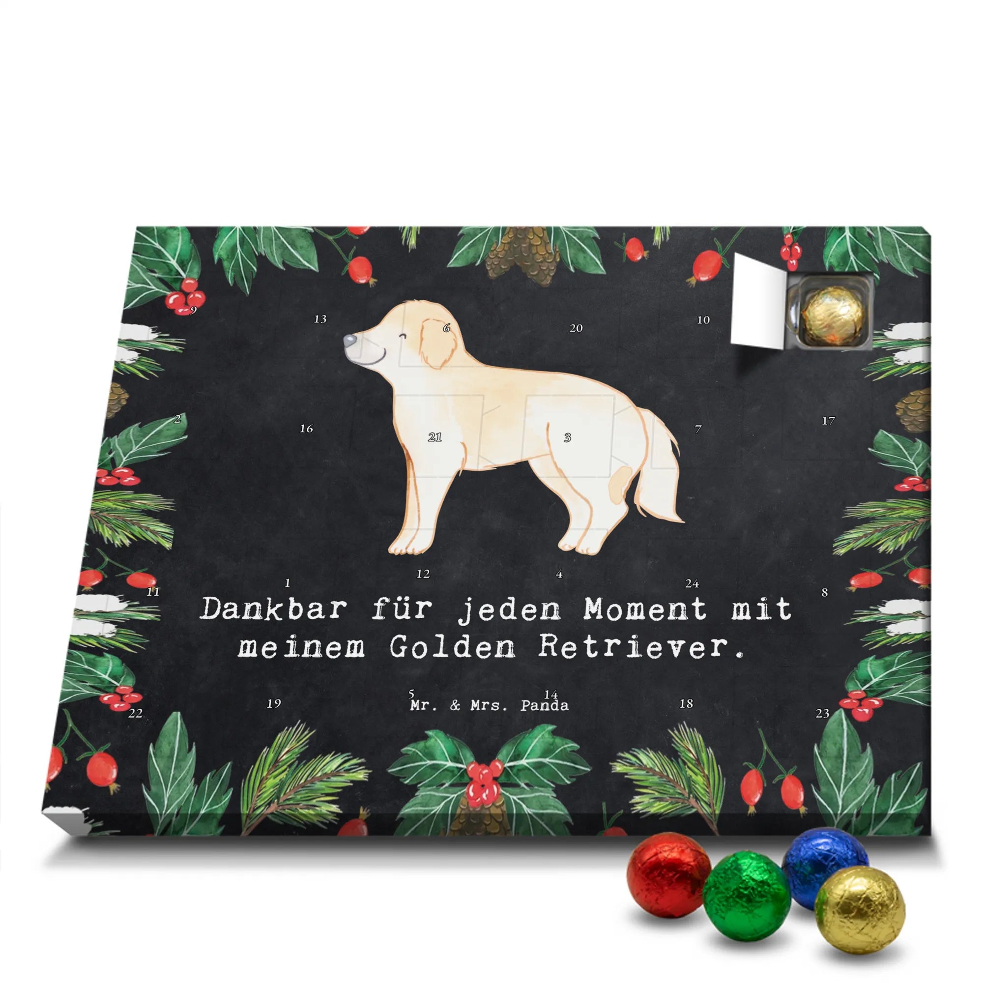 Wunderschöner Adventskalender mit Schokolade von Mr. & Mrs. Panda – für alle, die Advent und Design lieben. Dieser Adventskalender mit Schokolade ist liebevoll bedruckt mit wunderschönen Motiven & Sprüchen von Mr. & Mrs. Panda und ist nicht personalisierbar, aber mit viel Liebe zum Detail gefertigt. Brillante Druckqualität mit seidenmatter Oberflächenveredelung sorgt für einen edlen Look, und die bedruckten Seitenflächen geben dem Kalender eine besondere Optik. Maße: 233 mm x 178 mm x 24 mm. Dank seiner stabilen Verarbeitung kannst du ihn aufstellen oder ganz einfach aufhängen – Besonderheit: kann aufgehängt oder aufgestellt werden. Gefüllt mit MARKENNAMEN Schokolade und leckeren Schokoladenkugeln, bringt er jeden Tag ein kleines Glückserlebnis. Wichtige Hinweise: (Kann Spuren von Haselnüssen, Mandeln, Gluten und Soja enthalten!), bitte kühl und trocken lagern. Ob als Geschenk, Mitbringsel oder Adventsdeko – dieser Kalender zaubert ein Lächeln und sorgt für gemütliche Vorfreude. Viel Freude beim Entdecken der süßen Überraschungen wünscht dir Mr. & Mrs. Panda!