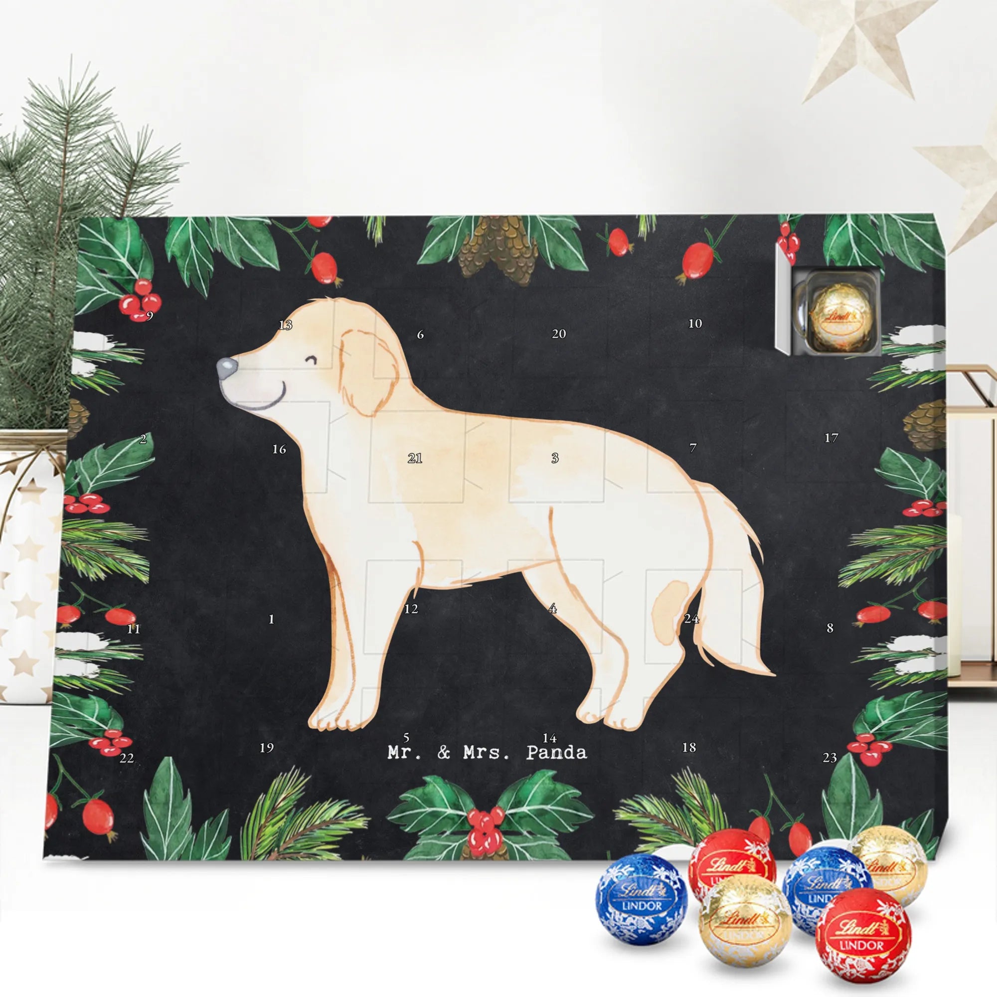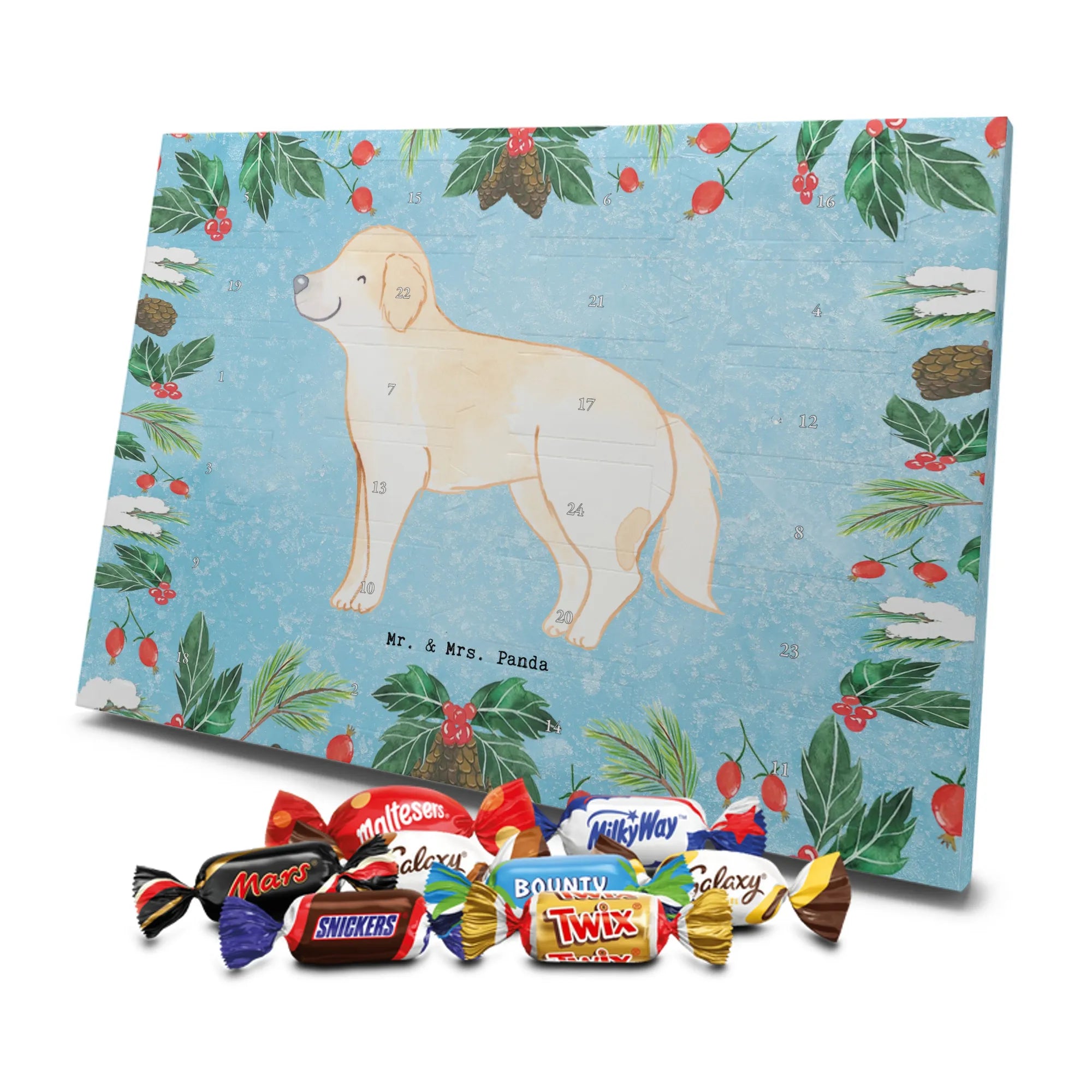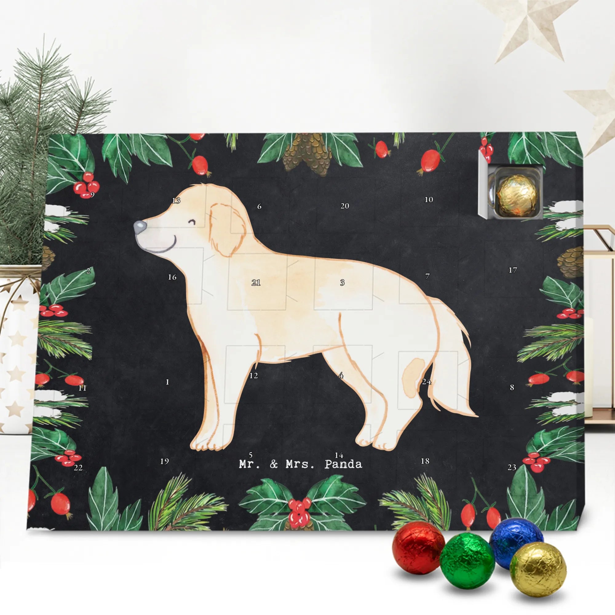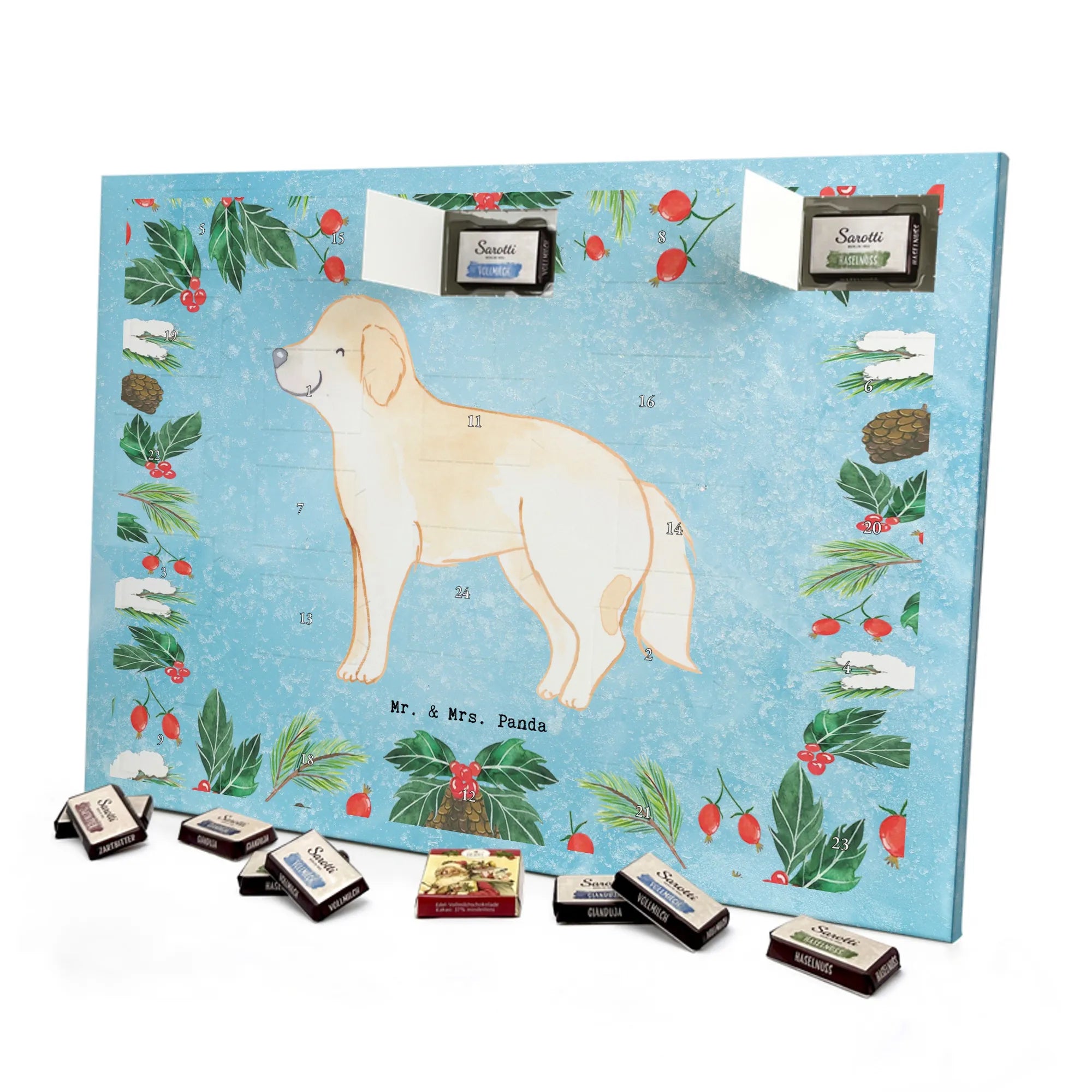 Wunderschöner Adventskalender mit Schokolade von Mr. & Mrs. Panda – für alle, die Advent und Design lieben. Dieser Adventskalender mit Schokolade ist liebevoll bedruckt mit wunderschönen Motiven & Sprüchen von Mr. & Mrs. Panda und ist nicht personalisierbar, aber mit viel Liebe zum Detail gefertigt. Brillante Druckqualität mit seidenmatter Oberflächenveredelung sorgt für einen edlen Look, und die bedruckten Seitenflächen geben dem Kalender eine besondere Optik. Maße: 233 mm x 178 mm x 24 mm. Dank seiner stabilen Verarbeitung kannst du ihn aufstellen oder ganz einfach aufhängen – Besonderheit: kann aufgehängt oder aufgestellt werden. Gefüllt mit MARKENNAMEN Schokolade und leckeren Schokoladenkugeln, bringt er jeden Tag ein kleines Glückserlebnis. Wichtige Hinweise: (Kann Spuren von Haselnüssen, Mandeln, Gluten und Soja enthalten!), bitte kühl und trocken lagern. Ob als Geschenk, Mitbringsel oder Adventsdeko – dieser Kalender zaubert ein Lächeln und sorgt für gemütliche Vorfreude. Viel Freude beim Entdecken der süßen Überraschungen wünscht dir Mr. & Mrs. Panda!