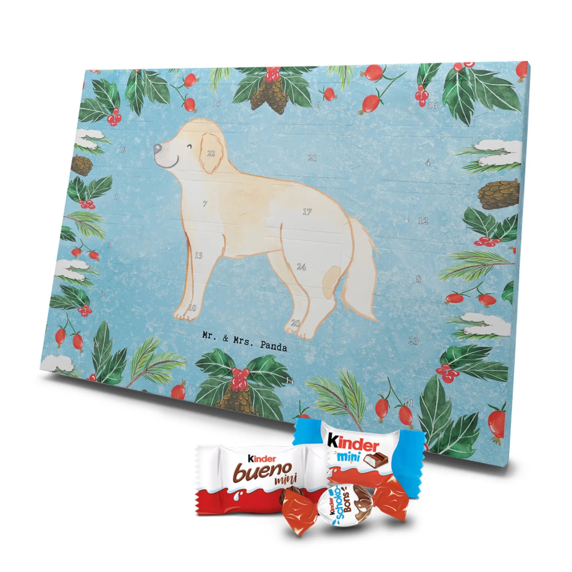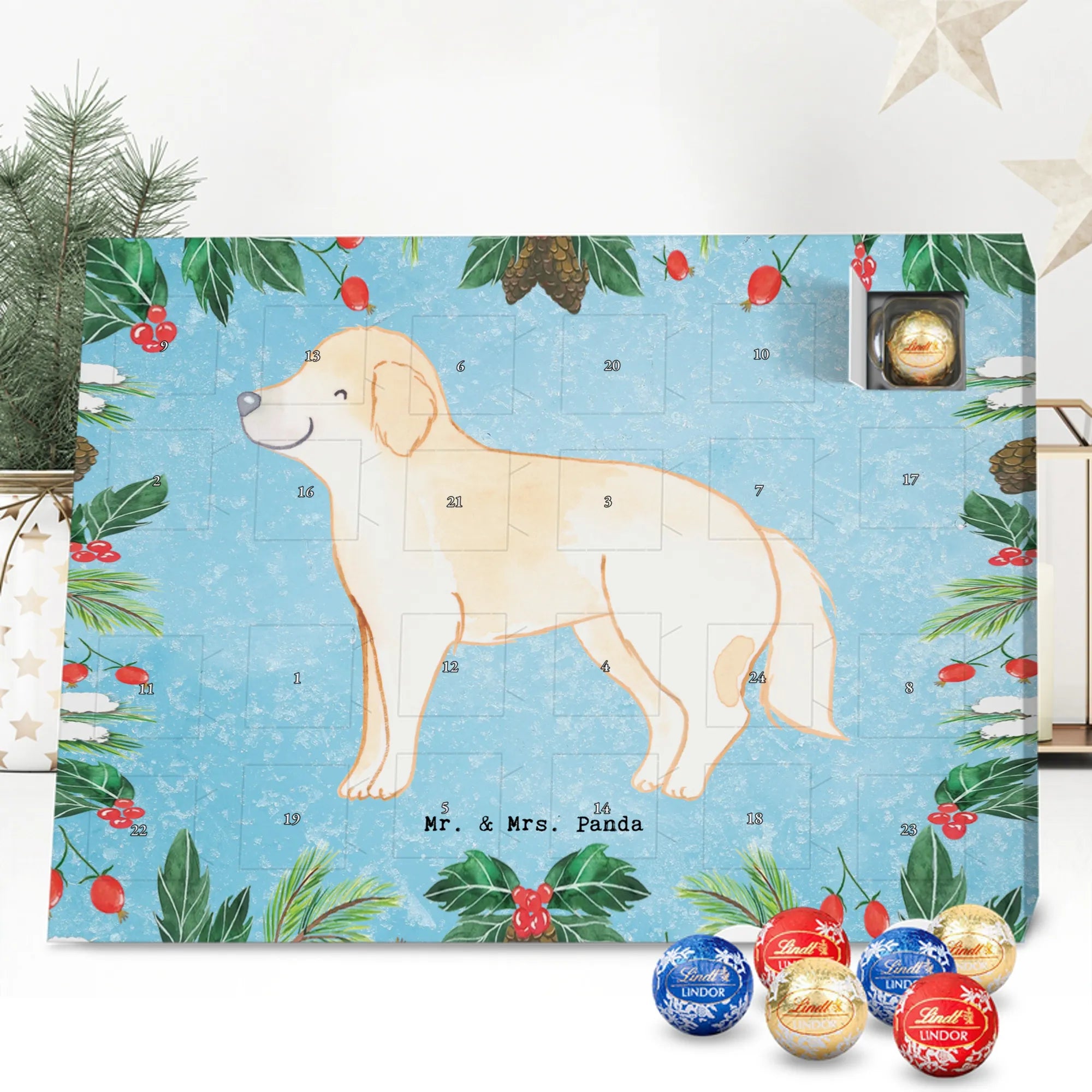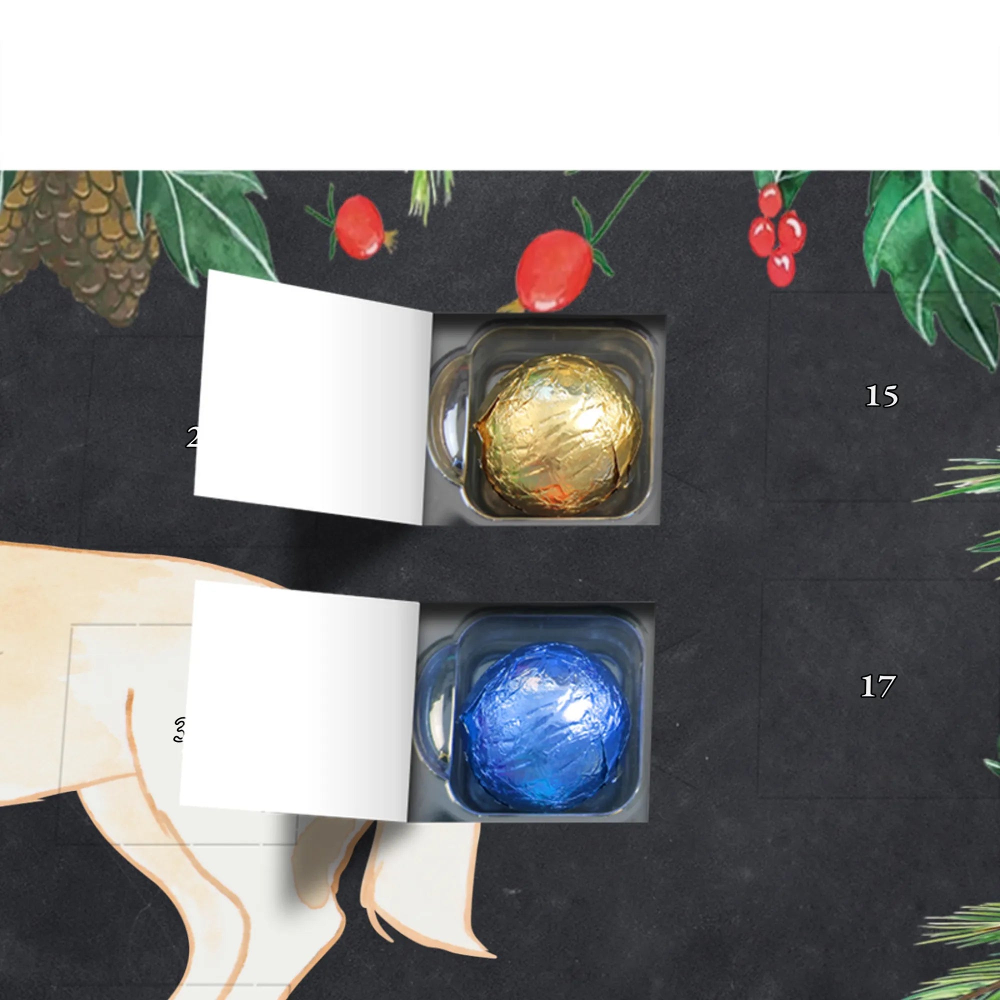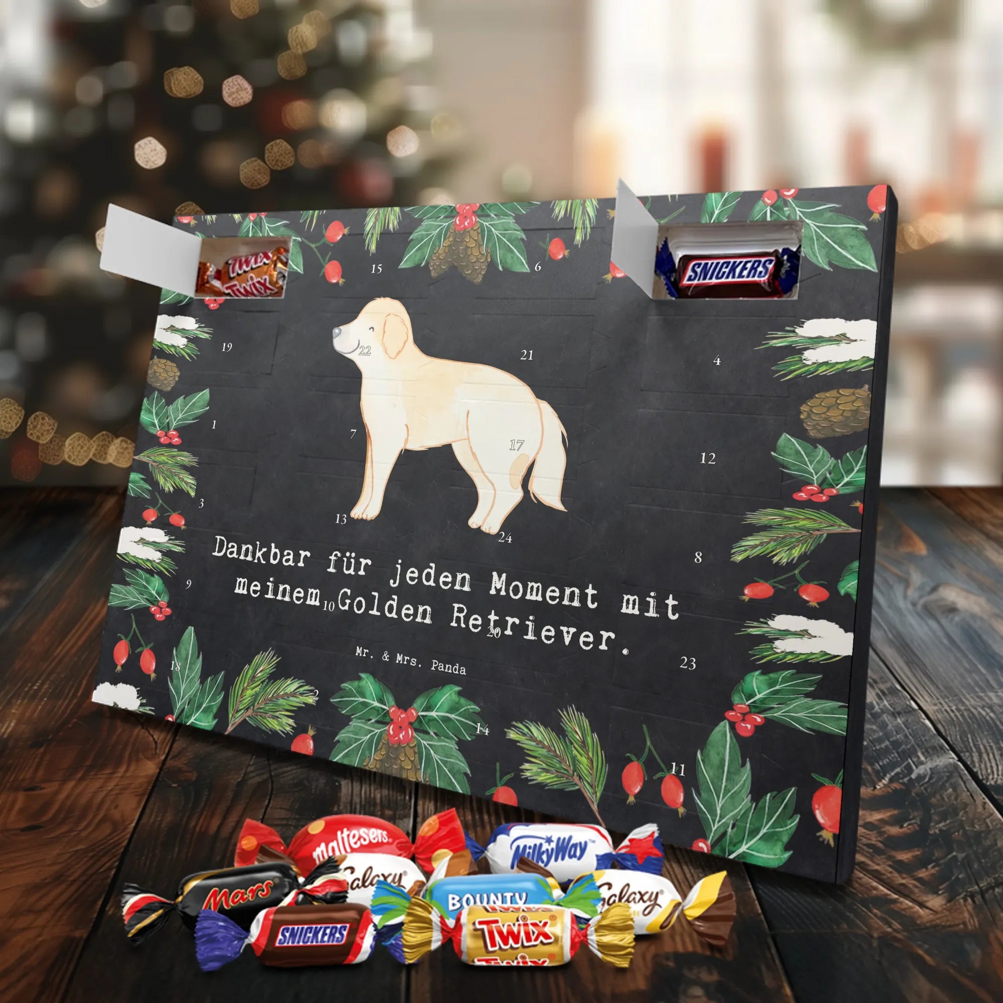 Wunderschöner Adventskalender mit Schokolade von Mr. & Mrs. Panda – für alle, die Advent und Design lieben. Dieser Adventskalender mit Schokolade ist liebevoll bedruckt mit wunderschönen Motiven & Sprüchen von Mr. & Mrs. Panda und ist nicht personalisierbar, aber mit viel Liebe zum Detail gefertigt. Brillante Druckqualität mit seidenmatter Oberflächenveredelung sorgt für einen edlen Look, und die bedruckten Seitenflächen geben dem Kalender eine besondere Optik. Maße: 233 mm x 178 mm x 24 mm. Dank seiner stabilen Verarbeitung kannst du ihn aufstellen oder ganz einfach aufhängen – Besonderheit: kann aufgehängt oder aufgestellt werden. Gefüllt mit MARKENNAMEN Schokolade und leckeren Schokoladenkugeln, bringt er jeden Tag ein kleines Glückserlebnis. Wichtige Hinweise: (Kann Spuren von Haselnüssen, Mandeln, Gluten und Soja enthalten!), bitte kühl und trocken lagern. Ob als Geschenk, Mitbringsel oder Adventsdeko – dieser Kalender zaubert ein Lächeln und sorgt für gemütliche Vorfreude. Viel Freude beim Entdecken der süßen Überraschungen wünscht dir Mr. & Mrs. Panda!