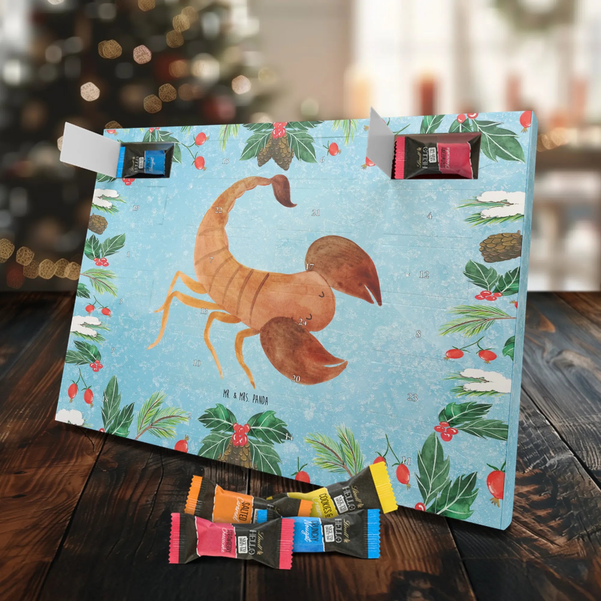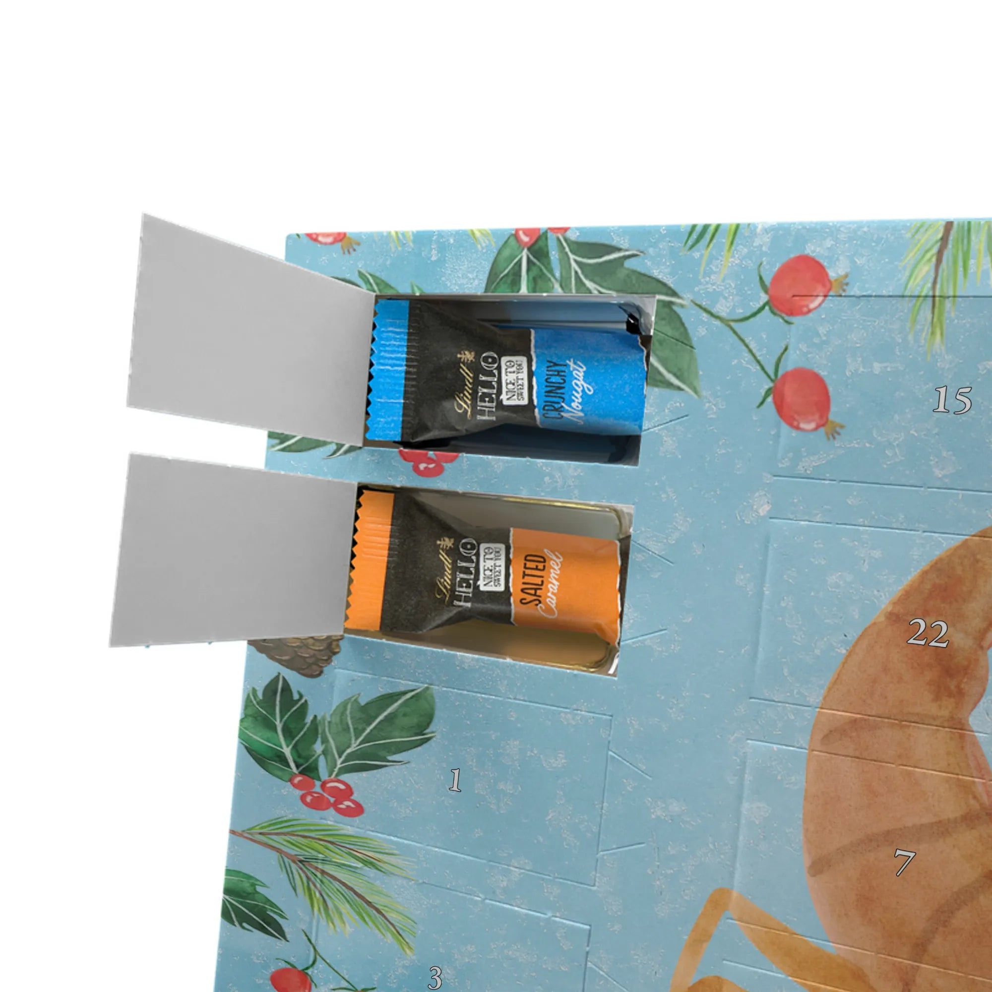 Entdecke den charmanten Schokoladen Adventskalender von Mr. & Mrs. Panda – ein kleines Kunstwerk für alle Schoko-Liebhaber. Der Schoko-Adventskalender ist mit liebevollen Illustrationen und kurzen Sprüchen bedruckt und verbreitet gemütliche Vorfreude auf Weihnachten. Er ist nicht personalisierbar, aber durch die brillante Druckqualität und die seidenmatte Oberflächenveredelung ein echtes Hingucker-Produkt. Auch die Seitenflächen sind bedruckt, was dem Kalender ein rundum schönes Erscheinungsbild verleiht. Maße: 325 mm x 225 mm x 27 mm. Das praktische Design erlaubt es, den Kalender aufzuhängen oder aufzustellen. Gefüllt mit Lindt Hello Schokolade: 24 einzeln verpackte Mini Sticks in vier leckeren Sorten – Karamell-Schokoladenkuchen, Kekse, Knuspriger Nougat und Erdbeer-Cheesecake. Zutaten sind u. a. Zucker, Kakaobutter, Vollmilchpulver, Haselnüsse und weitere Zutaten; Allergene: Milcheiweiß, Milchzucker, Soja, Weizen, Haselnüsse; kann Spuren von Mandeln und anderen Schalenfrüchten enthalten. Ideal als Geschenk oder zum Selbernaschen – einfach jeden Tag ein Türchen öffnen und genießen.