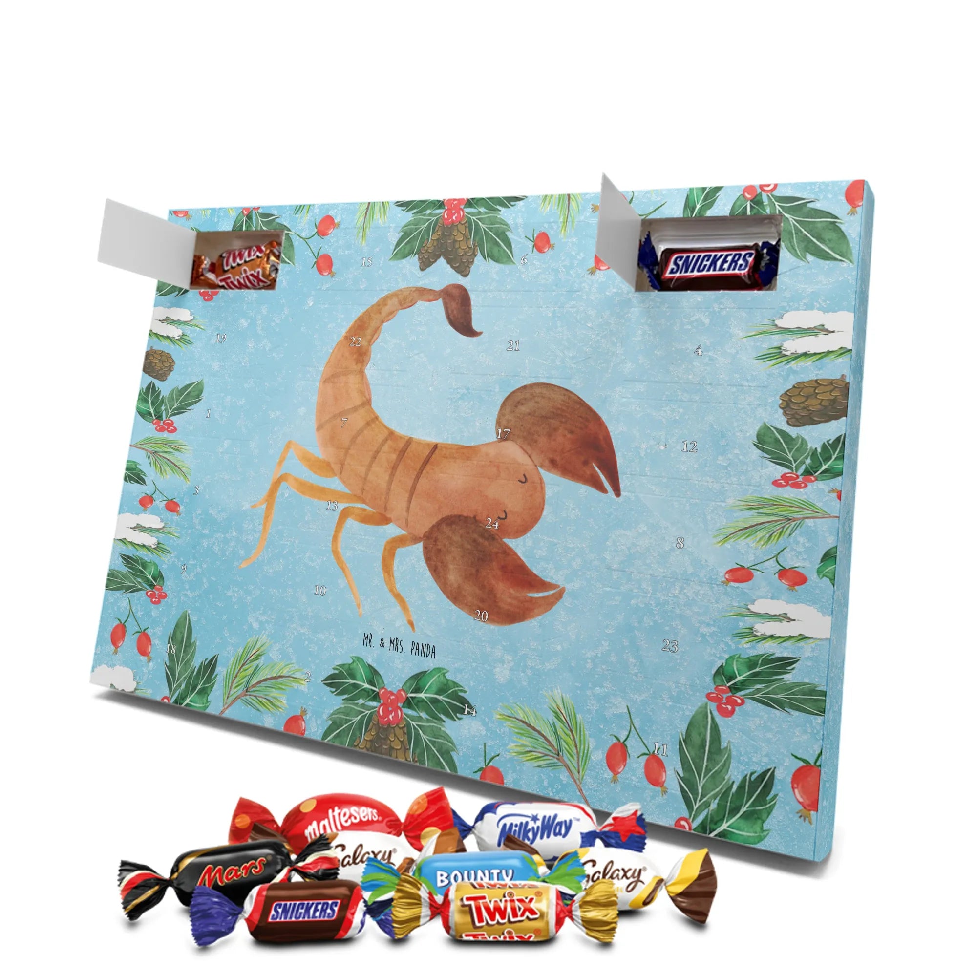 Unser liebevoller Schokoladen Adventskalender von Mr. & Mrs. Panda ist die perfekte Überraschung für gemütliche Adventstage. Mit verspielten Illustrationen und herzlichen Sprüchen bedruckt, verbreitet er Wärme und gute Laune. Die hochwertige Druckqualität und die seidenmatte Oberflächenveredelung geben dem Kalender einen edlen Look, während die bedruckten Seitenflächen das Design komplettieren. Hinweis: Der Kalender ist nicht personalisierbar. Hinter den 24 Türchen verbergen sich feine Celebrations-Füllungen in acht köstlichen Sorten: Maltesers, Mars, Snickers, Twix, Milky Way, Bounty, Galaxy und Galaxy Caramel — insgesamt 24 hochwertige Überraschungen. Praktisch: Du kannst den Kalender entweder aufstellen oder an die Wand hängen. Maße: 325 mm x 225 mm x 27 mm. Ideal als Geschenk für Freundinnen, Familie oder als kleine Aufmerksamkeit für dich selbst, um jeden Tag im Dezember mit einem Lächeln zu beginnen.