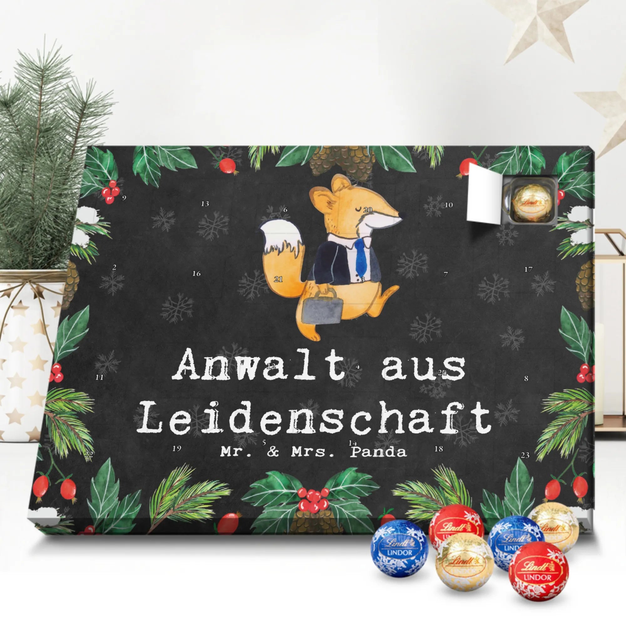 Unser zauberhafter Schoko Adventskalender von Mr. & Mrs. Panda bringt dir die süßeste Vorfreude auf Weihnachten! Dieser liebevoll gestaltete Adventskalender ist bedruckt mit wunderschönen Motiven & Sprüchen von Mr. & Mrs. Panda und ist nicht personalisierbar – dafür aber ein perfektes Geschenk für Freunde und Familie. Brillante Druckqualität mit seidenmatter Oberflächenveredelung sorgt für ein edles Finish, und die bedruckten Seitenflächen machen den Kalender von allen Seiten zu einem Hingucker. Maße: 233 mm x 178 mm x 24 mm. Besonderheit: kann aufgehängt oder aufgestellt werden, je nachdem, wie du ihn präsentieren möchtest. Gefüllt mit Lindt Lindor: 24 einzeln verpackte Markenschokoladen Kugeln in drei verschiedenen Sorten – Vollmilch, Feinherb und Weiße Schokolade – sorgen für abwechslungsreichen Genuss in der Adventszeit. Zutaten: Zucker, pflanzliches Fett (Kokosnuss, Palmkern), Kakaobutter, Vollmilchpulver, Kakaomasse, Milchzucker, Magermilchpulver, Butterreinfett, Emulgator (Sojalecithin), Gerstenmalzextrakt, Aromen. Besondere Hinweise: Kann Haselnüsse und Mandeln enthalten. Unser Schoko Adventskalender verbindet niedliches Design mit hochwertiger Füllung – ideal zum Verschenken oder selbst Naschen. Mr. & Mrs. Panda wünschen dir eine fröhliche und leckere Adventszeit!
