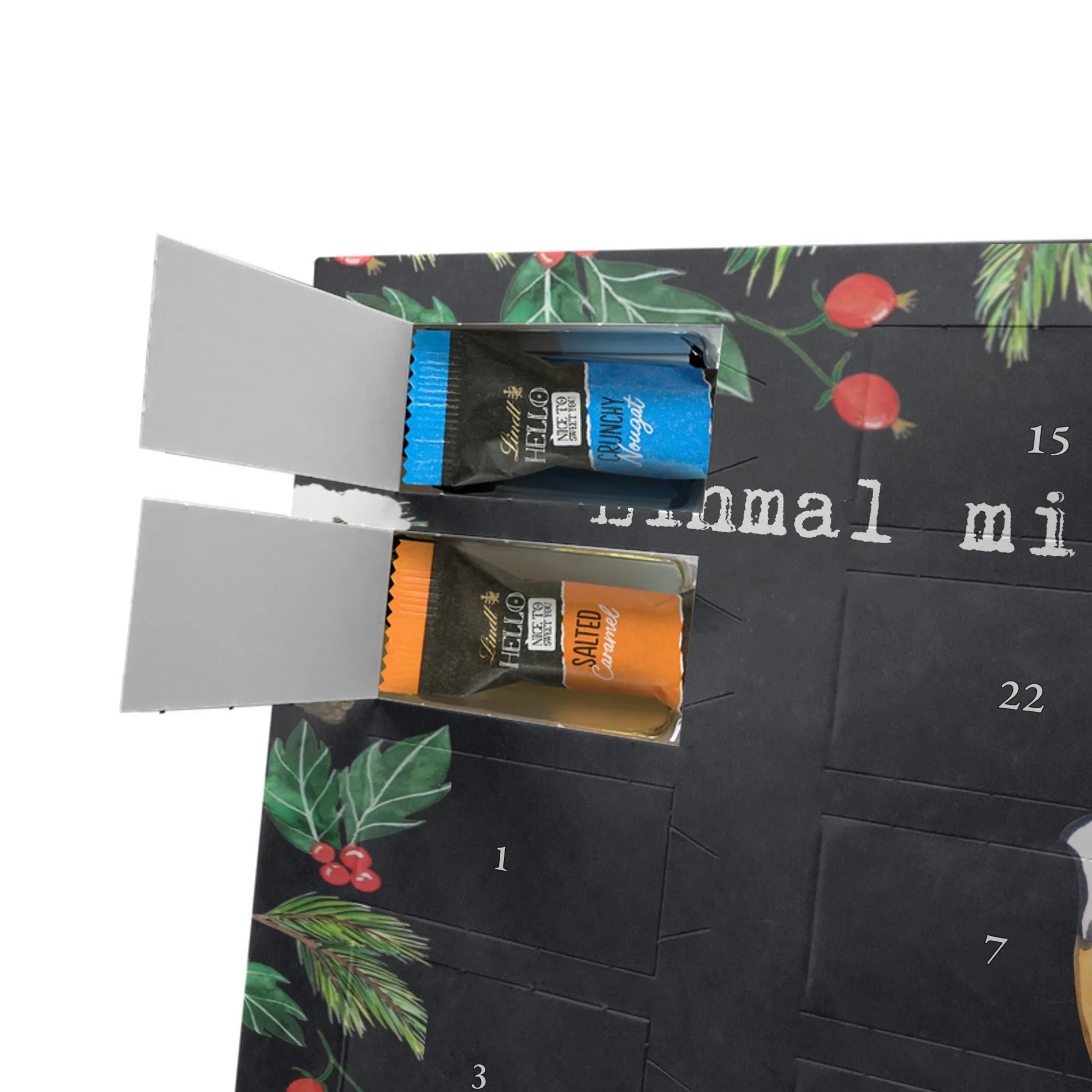 Entdecke den charmanten Schokoladen Adventskalender von Mr. & Mrs. Panda – ein kleines Kunstwerk für alle Schoko-Liebhaber. Der Schoko-Adventskalender ist mit liebevollen Illustrationen und kurzen Sprüchen bedruckt und verbreitet gemütliche Vorfreude auf Weihnachten. Er ist nicht personalisierbar, aber durch die brillante Druckqualität und die seidenmatte Oberflächenveredelung ein echtes Hingucker-Produkt. Auch die Seitenflächen sind bedruckt, was dem Kalender ein rundum schönes Erscheinungsbild verleiht. Maße: 325 mm x 225 mm x 27 mm. Das praktische Design erlaubt es, den Kalender aufzuhängen oder aufzustellen. Gefüllt mit Lindt Hello Schokolade: 24 einzeln verpackte Mini Sticks in vier leckeren Sorten – Karamell-Schokoladenkuchen, Kekse, Knuspriger Nougat und Erdbeer-Cheesecake. Zutaten sind u. a. Zucker, Kakaobutter, Vollmilchpulver, Haselnüsse und weitere Zutaten; Allergene: Milcheiweiß, Milchzucker, Soja, Weizen, Haselnüsse; kann Spuren von Mandeln und anderen Schalenfrüchten enthalten. Ideal als Geschenk oder zum Selbernaschen – einfach jeden Tag ein Türchen öffnen und genießen.