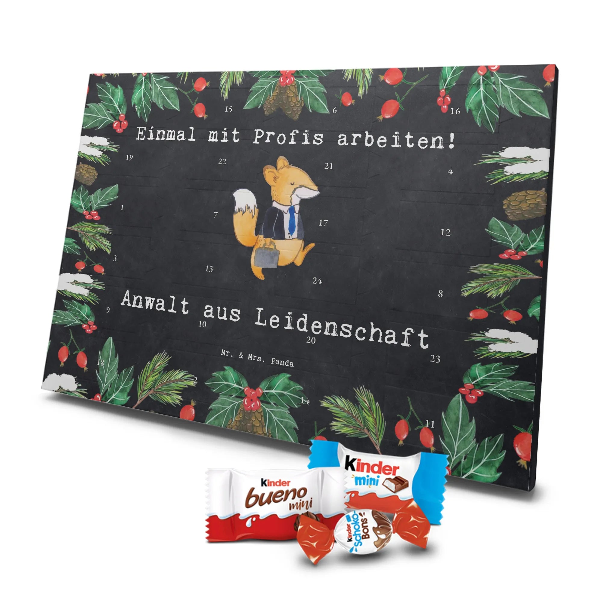 Entdecke unseren liebevoll gestalteten Schoko-Adventskalender von Mr. & Mrs. Panda – eine zauberhafte Idee, um die Tage bis Weihnachten zu versüßen. Der Kalender ist bedruckt mit wunderschönen Motiven & Sprüchen von Mr. & Mrs. Panda und ist nicht personalisierbar. Wir setzen auf brillante Druckqualität mit seidenmatter Oberflächenveredelung und bedruckte Seitenflächen für ein rundum schönes Erscheinungsbild. Maße: 355 mm x 245 mm x 11 mm. Die clevere Bauweise erlaubt es, den Kalender entweder aufzuhängen oder freistehend aufzustellen – so bist du flexibel bei der Dekoration. Gefüllt mit Markenname Schokolade: Adventskalender gefüllt mit kinder® Schokolade. Inhalt: kinder® Schoko-Bons, kinder® Bueno mini und kinder® Schokolade mini. Jeder Tag bringt eine kleine Freude und eignet sich perfekt als Geschenk oder als dekoratives Highlight in deinem Zuhause. Die stabile Verarbeitung sorgt dafür, dass der Kalender die ganze Adventszeit über Freude bereitet. Hol dir diesen Schoko-Adventskalender und lade die Vorweihnachtszeit mit süßen Überraschungen auf!