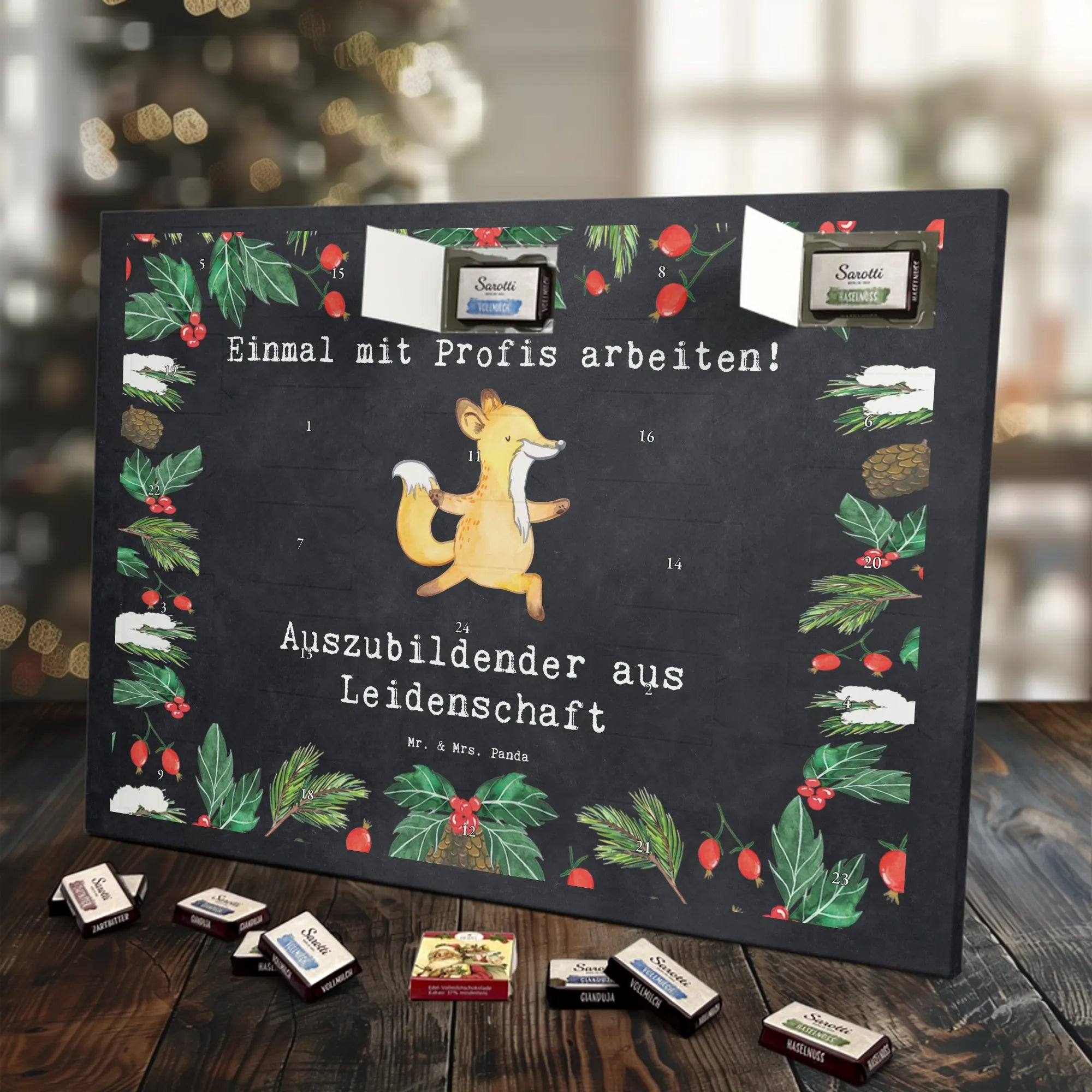 Schon unser Schoko-Adventskalender von Mr. & Mrs. Panda gesehen? Ein liebevoll gestalteter Kalender, bedruckt mit wunderschönen Motiven & Sprüchen, der deine Adventszeit versüßt. Der Kalender ist nicht personalisierbar, überzeugt aber durch brillante Druckqualität mit seidenmatter Oberflächenveredelung und bedruckte Seitenflächen für ein rundum schönes Erscheinungsbild. Maße: 325 mm x 225 mm x 27 mm. Du kannst ihn aufhängen oder aufstellen – ganz wie es dir gefällt. Gefüllt mit Ritter Sport Schokowürfeln in köstlichen Sorten: Mousse au Chocolat, Schoko Crisp, Voll-Nuss in Nougatcreme, Karamell Duo, Joghurt und Erdbeer-Joghurt. Bitte beachten: Es handelt sich um einen Kalender gefüllt mit Ritter Sport Schokolade, nicht um einen Kalender der Marke Ritter Sport. Ob als Geschenk oder für dich selbst – dieser Schoko-Adventskalender bringt täglich kleine Glücksmomente und süße Überraschungen.
