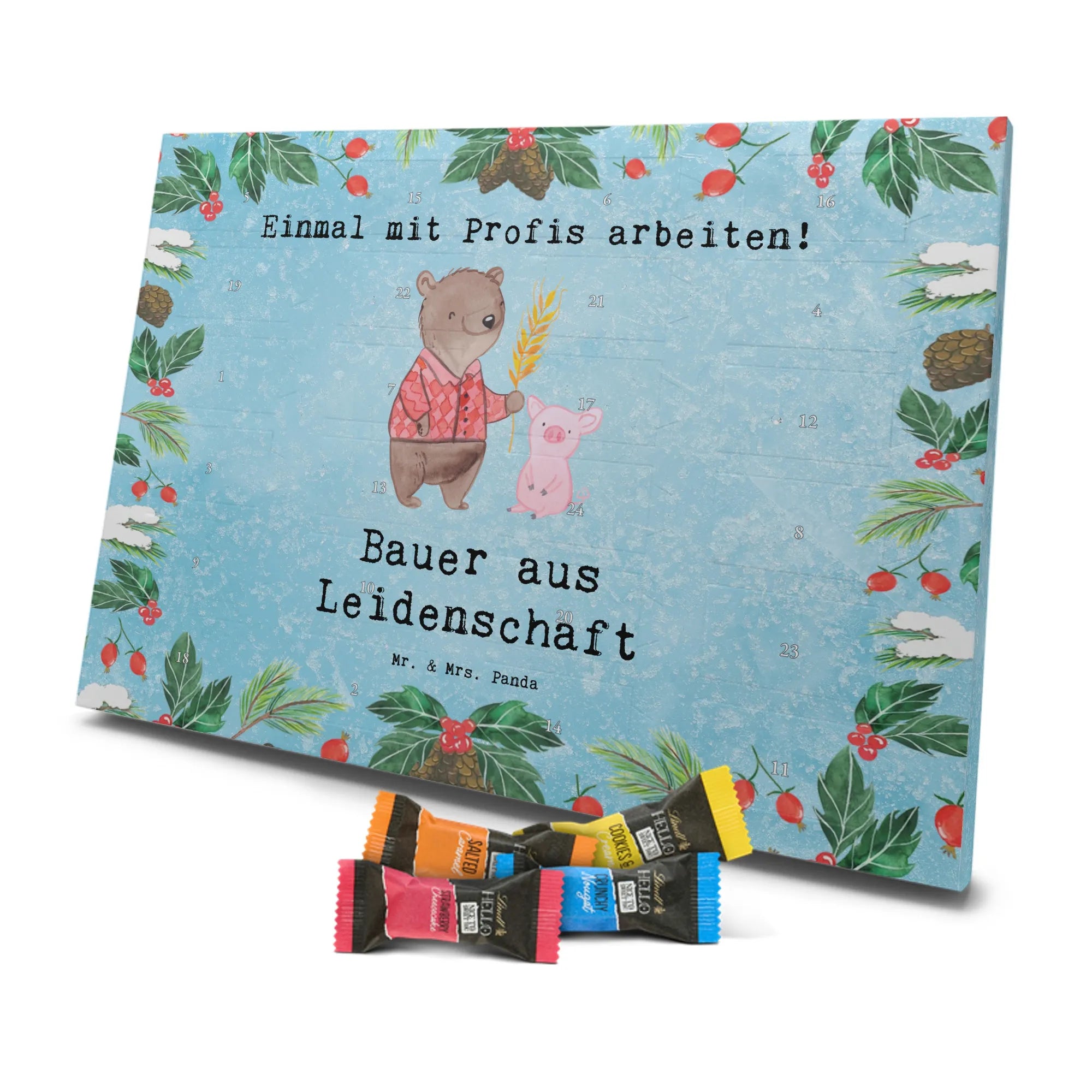Unser liebevoller Schokoladen Adventskalender von Mr. & Mrs. Panda ist perfekt für alle, die sich eine fröhliche und süße Adventszeit wünschen. Aufwendig bedruckt mit unseren typischen Motiven & Sprüchen, nicht personalisierbar – dafür aber unglaublich hübsch anzusehen. Die brillante Druckqualität mit seidenmatter Oberflächenveredelung verleiht dem Kalender ein edles Aussehen, und die bedruckten Seitenflächen runden das Design ab. Maße: 233 mm x 178 mm x 24 mm. Besonderheit: kann aufgehängt oder aufgestellt werden, so bleibt er flexibel für deinen Deko-Stil. Gefüllt mit Lindt Lindor: 24 einzeln verpackte Markenschokoladen Kugeln in drei leckeren Sorten – Vollmilch, Feinherb und Weiße Schokolade – sorgen für tägliche Genussmomente. Zutaten: Zucker, pflanzliches Fett (Kokosnuss, Palmkern), Kakaobutter, Vollmilchpulver, Kakaomasse, Milchzucker, Magermilchpulver, Butterreinfett, Emulgator (Sojalecithin), Gerstenmalzextrakt, Aromen. Besondere Hinweise: Kann Haselnüsse und Mandeln enthalten. Ein tolles Geschenk oder eine hübsche Dekoration – unser Schokoladen Adventskalender macht die Wartezeit bis Weihnachten noch schöner!