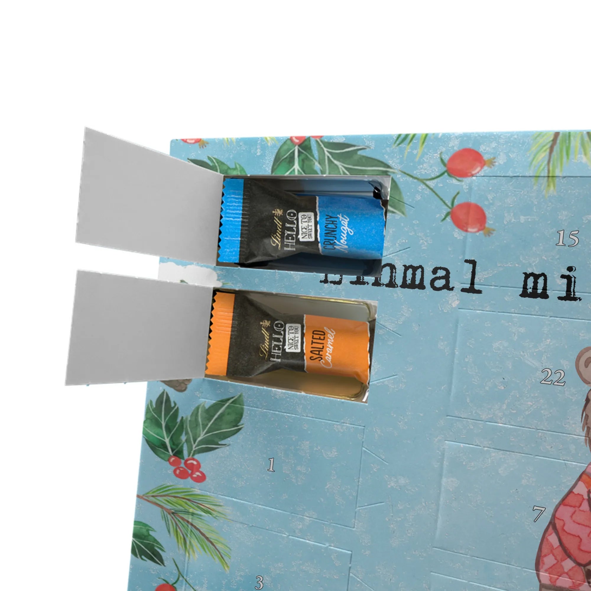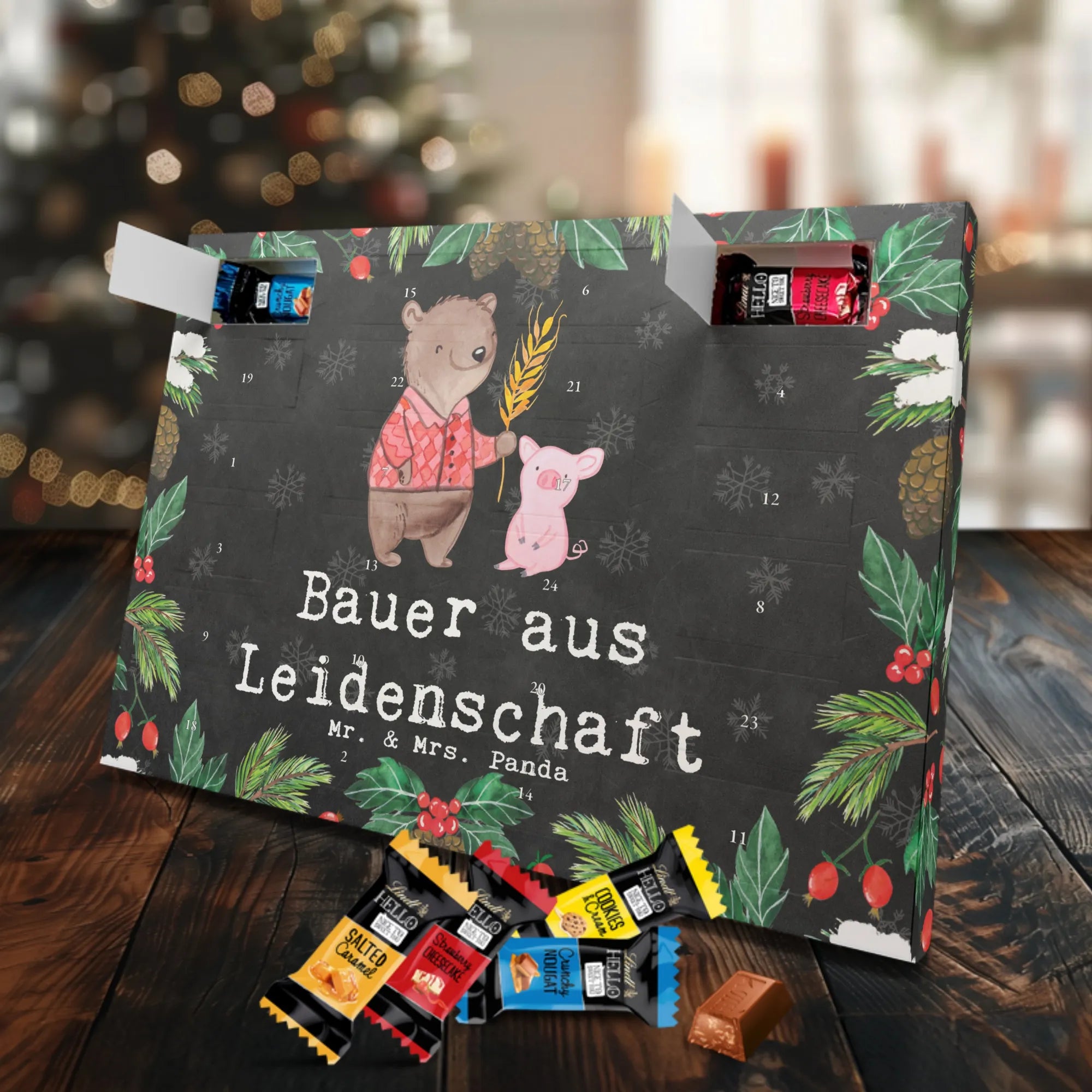 Wunderschöner Schokoladen-Adventskalender von Mr. & Mrs. Panda – süßes Design trifft hochwertige Verarbeitung. Unser Schokoladen-Adventskalender ist bedruckt mit wunderschönen Motiven & Sprüchen von Mr. & Mrs. Panda und nicht personalisierbar, dafür aber mit liebevollen Details gestaltet. Die brillante Druckqualität mit seidenmatter Oberflächenveredelung verleiht dem Kalender ein edles Finish, und auch die Seitenflächen sind bedruckt für einen rundum stimmigen Look. Maße: 233 mm x 178 mm x 24 mm. Die Konstruktion erlaubt sowohl das Aufstellen als auch das Aufhängen – Besonderheit: kann aufgehängt oder aufgestellt werden. Gefüllt mit MARKENNAMEN Schokolade und mit leckeren Schokoladenkugeln bestückt, ist jeder Dezembertag eine kleine Belohnung. Bitte lies die besonderen Hinweise: (Kann Spuren von Haselnüssen, Mandeln, Gluten und Soja enthalten!), kühl und trocken lagern. Ideal als Geschenk, Adventsdekoration oder süße Überraschung für Freunde und Familie. Mr. & Mrs. Panda wünscht dir eine gemütliche und genussvolle Adventszeit!