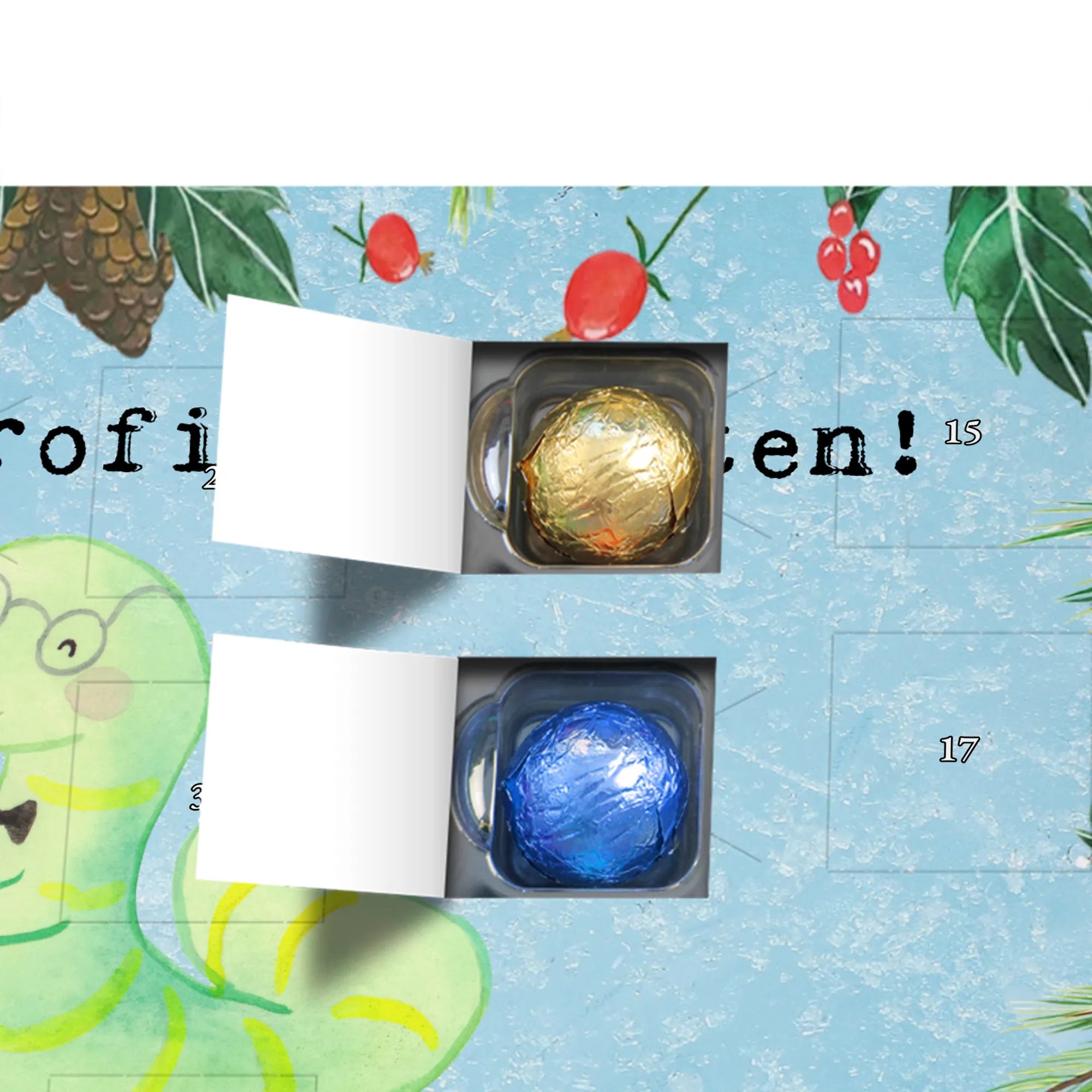 Wunderschöner Schokoladen-Adventskalender von Mr. & Mrs. Panda – süßes Design trifft hochwertige Verarbeitung. Unser Schokoladen-Adventskalender ist bedruckt mit wunderschönen Motiven & Sprüchen von Mr. & Mrs. Panda und nicht personalisierbar, dafür aber mit liebevollen Details gestaltet. Die brillante Druckqualität mit seidenmatter Oberflächenveredelung verleiht dem Kalender ein edles Finish, und auch die Seitenflächen sind bedruckt für einen rundum stimmigen Look. Maße: 233 mm x 178 mm x 24 mm. Die Konstruktion erlaubt sowohl das Aufstellen als auch das Aufhängen – Besonderheit: kann aufgehängt oder aufgestellt werden. Gefüllt mit MARKENNAMEN Schokolade und mit leckeren Schokoladenkugeln bestückt, ist jeder Dezembertag eine kleine Belohnung. Bitte lies die besonderen Hinweise: (Kann Spuren von Haselnüssen, Mandeln, Gluten und Soja enthalten!), kühl und trocken lagern. Ideal als Geschenk, Adventsdekoration oder süße Überraschung für Freunde und Familie. Mr. & Mrs. Panda wünscht dir eine gemütliche und genussvolle Adventszeit!