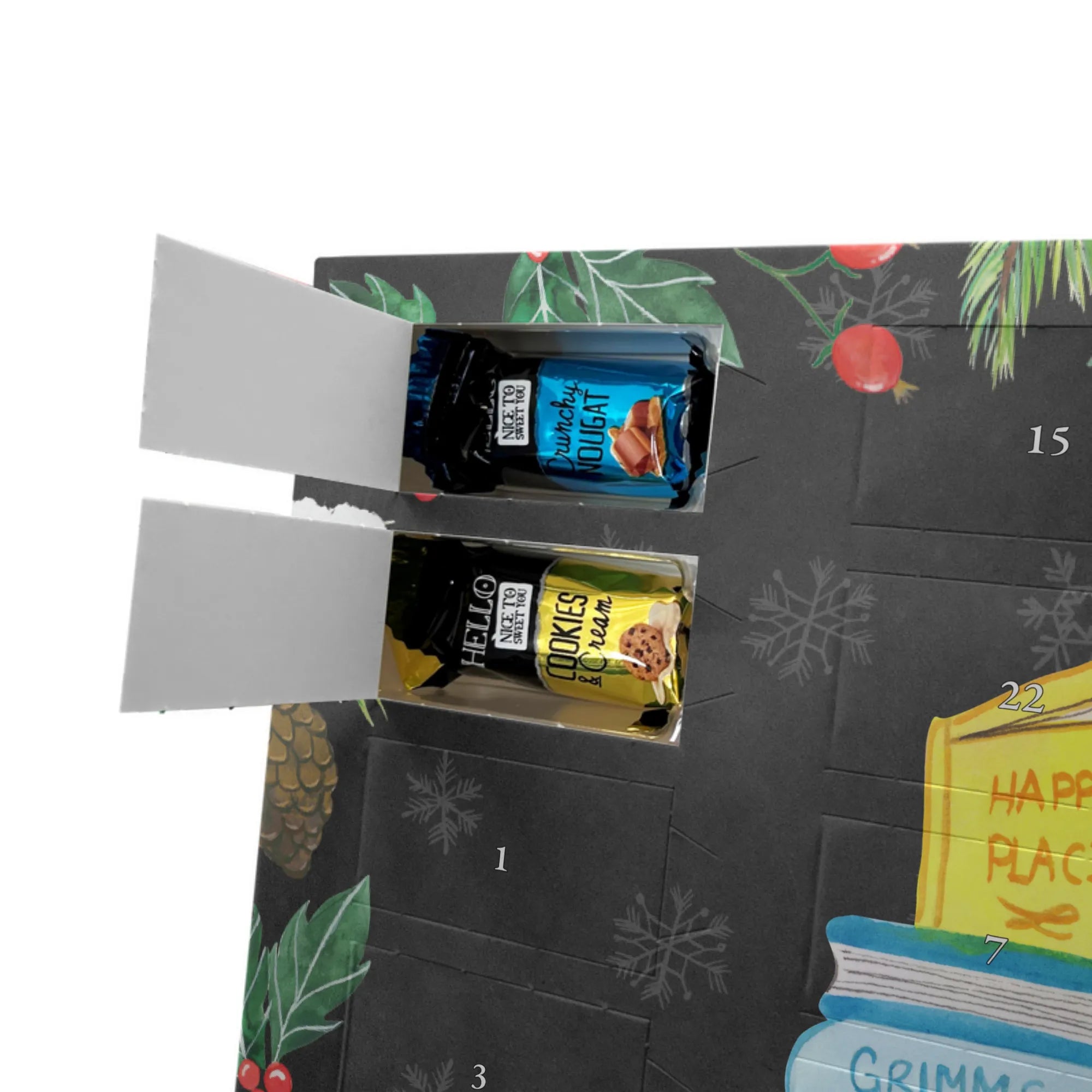 Entdecke den charmanten Schokoladen Adventskalender von Mr. & Mrs. Panda – ein kleines Kunstwerk für alle Schoko-Liebhaber. Der Schoko-Adventskalender ist mit liebevollen Illustrationen und kurzen Sprüchen bedruckt und verbreitet gemütliche Vorfreude auf Weihnachten. Er ist nicht personalisierbar, aber durch die brillante Druckqualität und die seidenmatte Oberflächenveredelung ein echtes Hingucker-Produkt. Auch die Seitenflächen sind bedruckt, was dem Kalender ein rundum schönes Erscheinungsbild verleiht. Maße: 325 mm x 225 mm x 27 mm. Das praktische Design erlaubt es, den Kalender aufzuhängen oder aufzustellen. Gefüllt mit Lindt Hello Schokolade: 24 einzeln verpackte Mini Sticks in vier leckeren Sorten – Karamell-Schokoladenkuchen, Kekse, Knuspriger Nougat und Erdbeer-Cheesecake. Zutaten sind u. a. Zucker, Kakaobutter, Vollmilchpulver, Haselnüsse und weitere Zutaten; Allergene: Milcheiweiß, Milchzucker, Soja, Weizen, Haselnüsse; kann Spuren von Mandeln und anderen Schalenfrüchten enthalten. Ideal als Geschenk oder zum Selbernaschen – einfach jeden Tag ein Türchen öffnen und genießen.