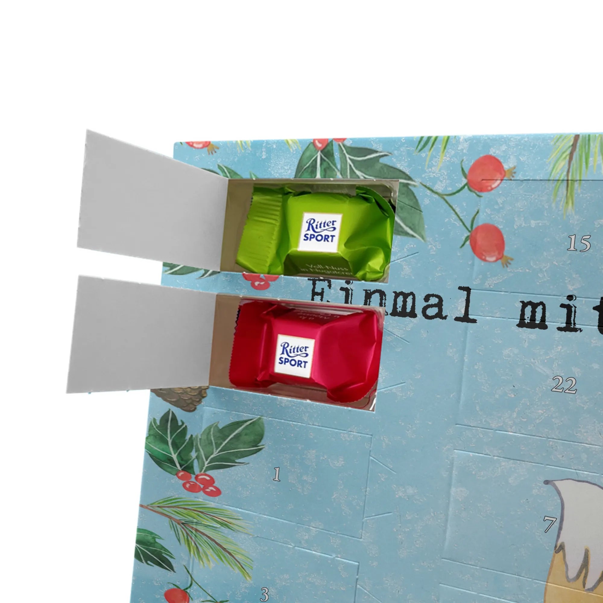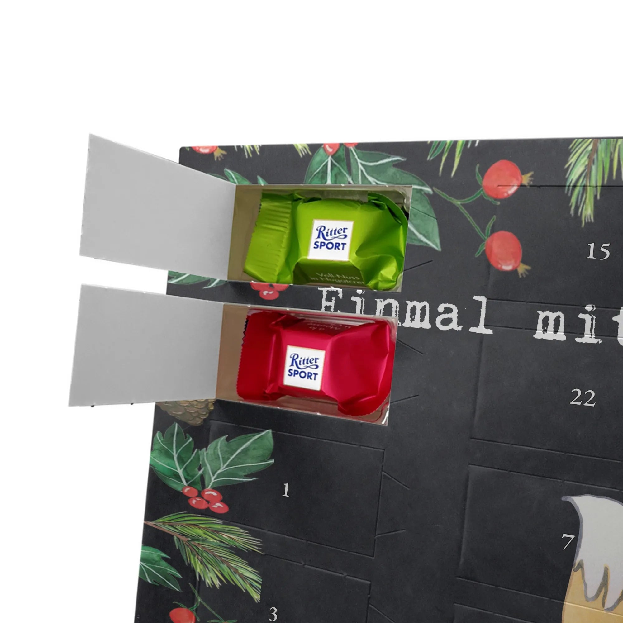 Unser zauberhafter Schoko Adventskalender von Mr. & Mrs. Panda bringt dir die Vorweihnachtszeit mit Liebe und Charme. Der Kalender ist bedruckt mit wunderschönen Motiven & Sprüchen von Mr. & Mrs. Panda und überrascht dich hinter jedem Türchen. Er ist nicht personalisierbar und kommt in brillanter Druckqualität mit seidenmatter Oberflächenveredelung – so sehen die Illustrationen einfach himmlisch aus. Die Seitenflächen sind ebenfalls bedruckt, sodass sich der Kalender von allen Seiten hübsch präsentiert. Maße: 325 mm x 225 mm x 27 mm. Eine besondere Eigenschaft: Du kannst ihn aufgehängt oder aufgestellt verwenden, je nachdem, wo er bei dir am besten zur Geltung kommt. Gefüllt ist der Kalender mit Ritter Sport Schokowürfeln in leckeren Geschmacksrichtungen: Mousse au Chocolat, Schoko Crisp, Voll-Nuss in Nougatcreme, Karamell Duo, Joghurt und Erdbeer-Joghurt. Bitte beachte: Es handelt sich um einen Kalender gefüllt mit Ritter Sport Schokolade, nicht um einen Kalender der Marke Ritter Sport. Perfekt als Geschenk für Freunde, Familie oder einfach als süße Belohnung für dich selbst – dieser Schoko Adventskalender macht die Adventszeit jeden Tag ein bisschen süßer.