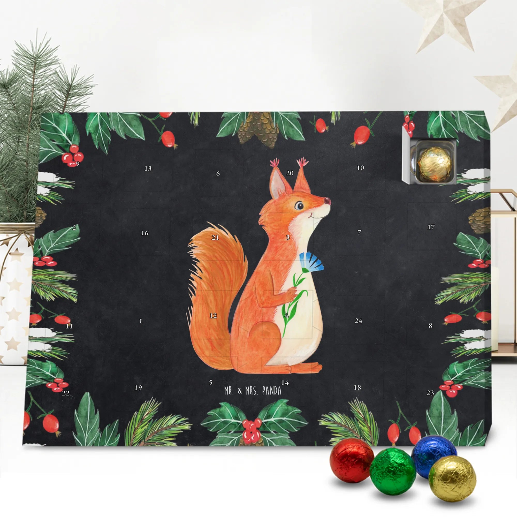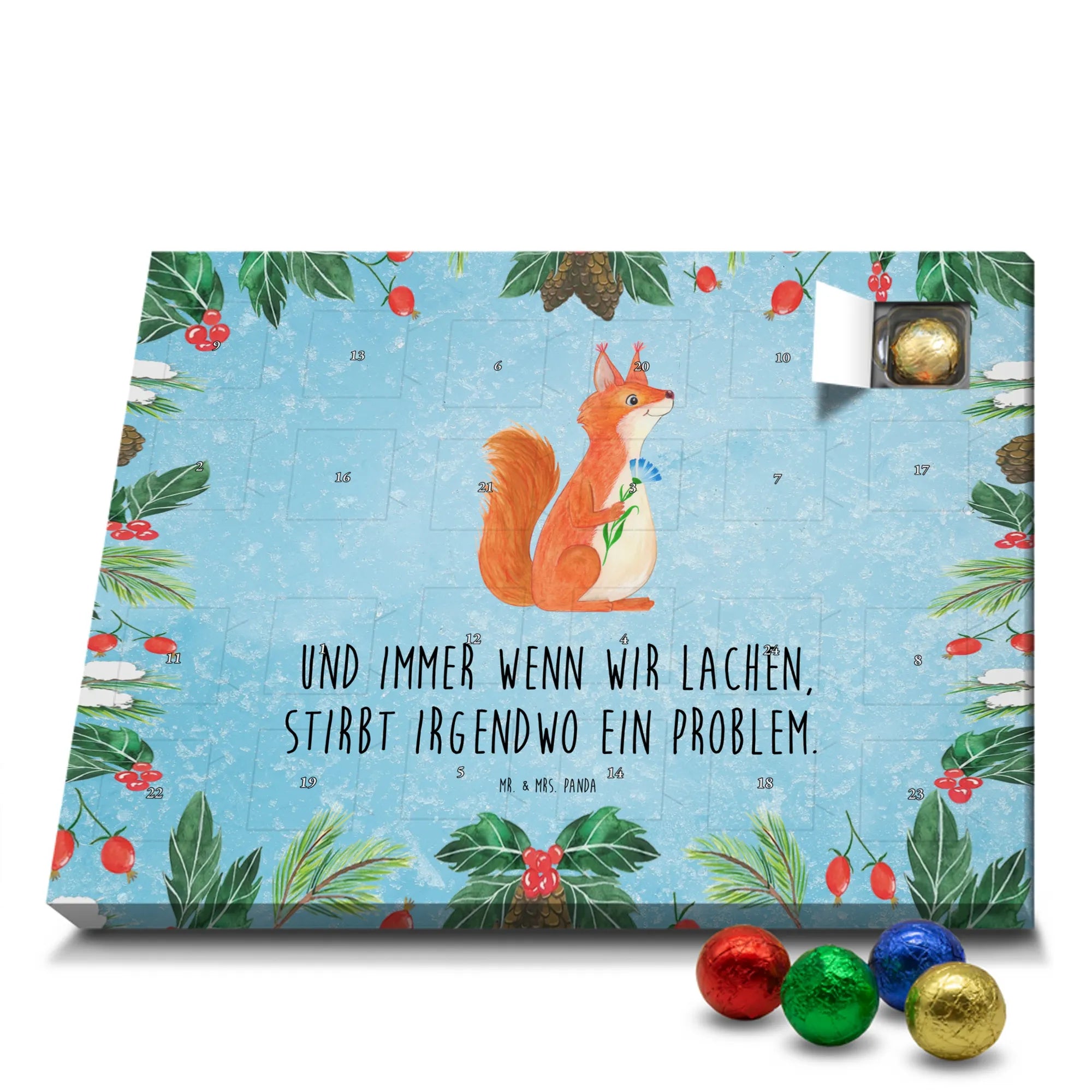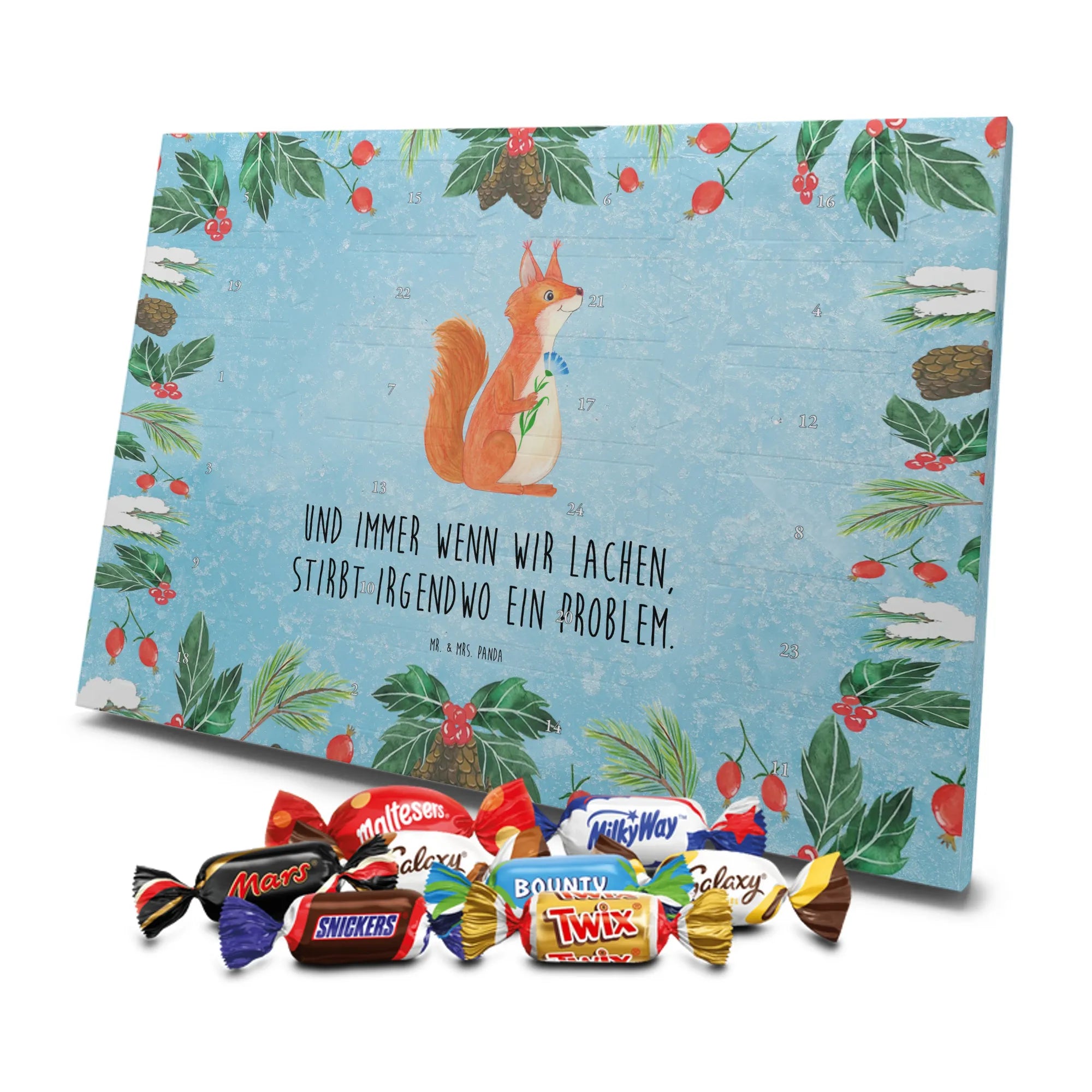 Schon unser Schoko-Adventskalender von Mr. & Mrs. Panda gesehen? Ein liebevoll gestalteter Kalender, bedruckt mit wunderschönen Motiven & Sprüchen, der deine Adventszeit versüßt. Der Kalender ist nicht personalisierbar, überzeugt aber durch brillante Druckqualität mit seidenmatter Oberflächenveredelung und bedruckte Seitenflächen für ein rundum schönes Erscheinungsbild. Maße: 325 mm x 225 mm x 27 mm. Du kannst ihn aufhängen oder aufstellen – ganz wie es dir gefällt. Gefüllt mit Ritter Sport Schokowürfeln in köstlichen Sorten: Mousse au Chocolat, Schoko Crisp, Voll-Nuss in Nougatcreme, Karamell Duo, Joghurt und Erdbeer-Joghurt. Bitte beachten: Es handelt sich um einen Kalender gefüllt mit Ritter Sport Schokolade, nicht um einen Kalender der Marke Ritter Sport. Ob als Geschenk oder für dich selbst – dieser Schoko-Adventskalender bringt täglich kleine Glücksmomente und süße Überraschungen.