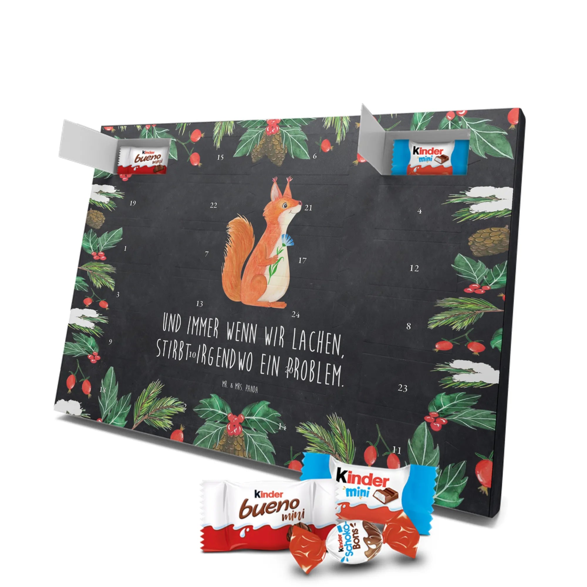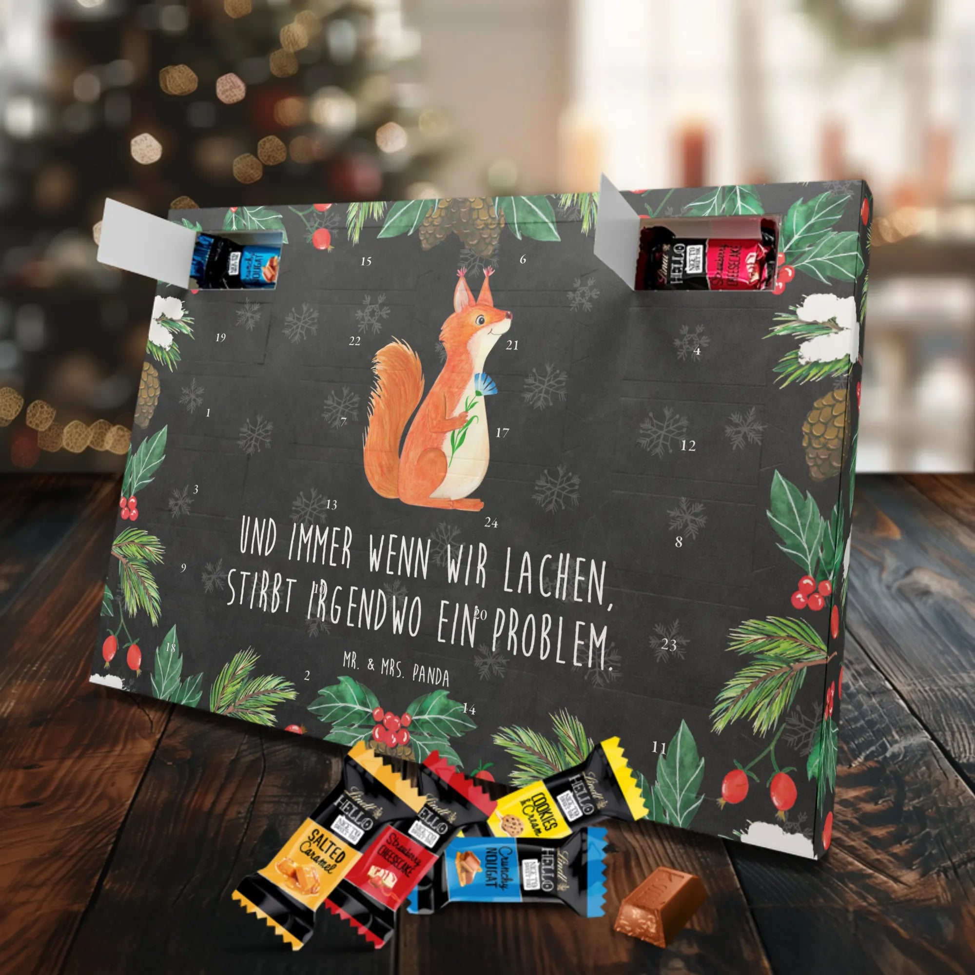 Schon unser Schoko-Adventskalender von Mr. & Mrs. Panda gesehen? Ein liebevoll gestalteter Kalender, bedruckt mit wunderschönen Motiven & Sprüchen, der deine Adventszeit versüßt. Der Kalender ist nicht personalisierbar, überzeugt aber durch brillante Druckqualität mit seidenmatter Oberflächenveredelung und bedruckte Seitenflächen für ein rundum schönes Erscheinungsbild. Maße: 325 mm x 225 mm x 27 mm. Du kannst ihn aufhängen oder aufstellen – ganz wie es dir gefällt. Gefüllt mit Ritter Sport Schokowürfeln in köstlichen Sorten: Mousse au Chocolat, Schoko Crisp, Voll-Nuss in Nougatcreme, Karamell Duo, Joghurt und Erdbeer-Joghurt. Bitte beachten: Es handelt sich um einen Kalender gefüllt mit Ritter Sport Schokolade, nicht um einen Kalender der Marke Ritter Sport. Ob als Geschenk oder für dich selbst – dieser Schoko-Adventskalender bringt täglich kleine Glücksmomente und süße Überraschungen.