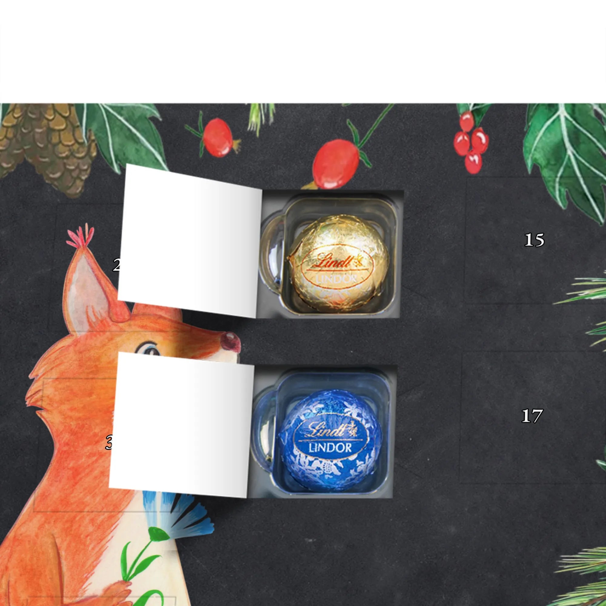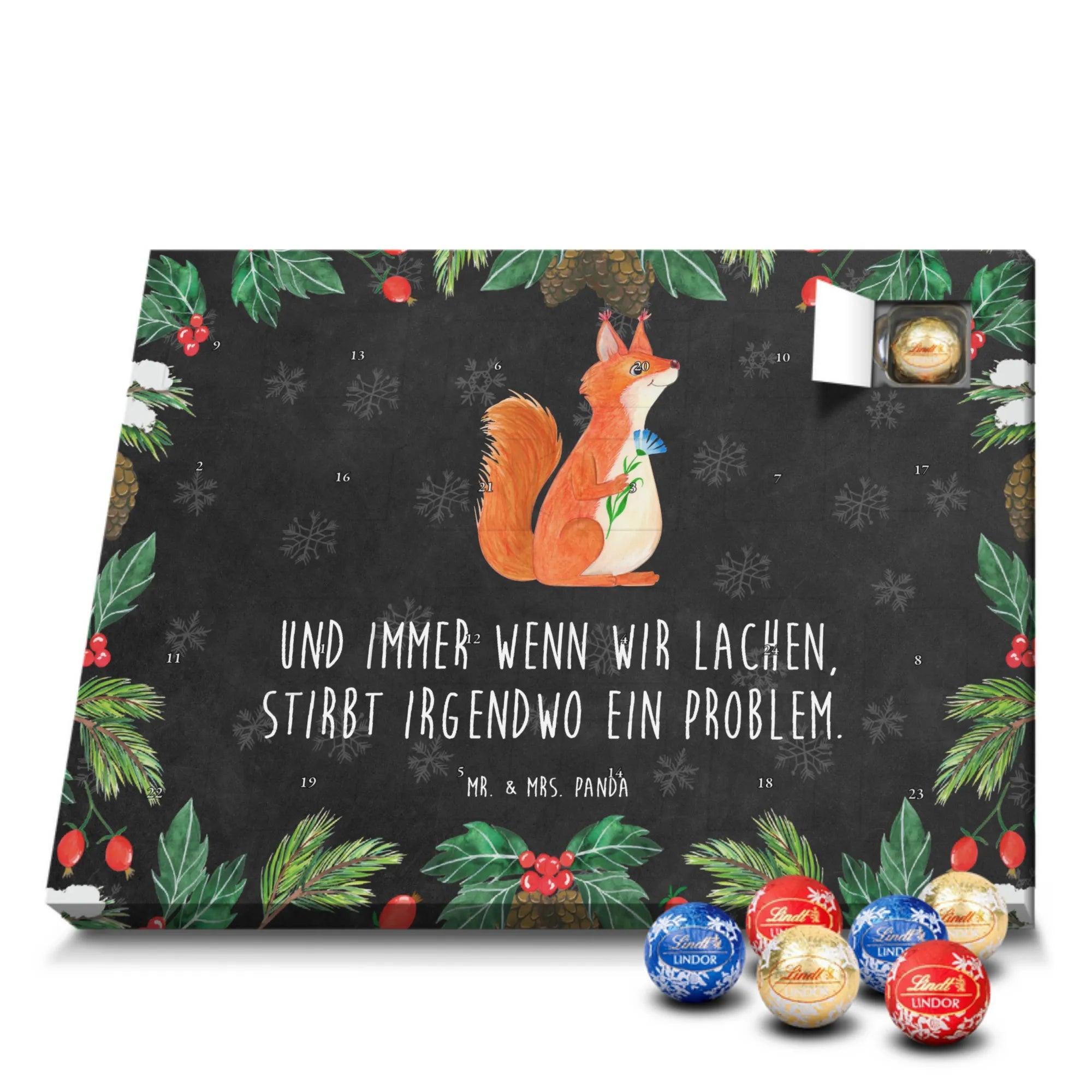 Unser zauberhafter Schoko Adventskalender von Mr. & Mrs. Panda bringt dir die süßeste Vorfreude auf Weihnachten! Dieser liebevoll gestaltete Adventskalender ist bedruckt mit wunderschönen Motiven & Sprüchen von Mr. & Mrs. Panda und ist nicht personalisierbar – dafür aber ein perfektes Geschenk für Freunde und Familie. Brillante Druckqualität mit seidenmatter Oberflächenveredelung sorgt für ein edles Finish, und die bedruckten Seitenflächen machen den Kalender von allen Seiten zu einem Hingucker. Maße: 233 mm x 178 mm x 24 mm. Besonderheit: kann aufgehängt oder aufgestellt werden, je nachdem, wie du ihn präsentieren möchtest. Gefüllt mit Lindt Lindor: 24 einzeln verpackte Markenschokoladen Kugeln in drei verschiedenen Sorten – Vollmilch, Feinherb und Weiße Schokolade – sorgen für abwechslungsreichen Genuss in der Adventszeit. Zutaten: Zucker, pflanzliches Fett (Kokosnuss, Palmkern), Kakaobutter, Vollmilchpulver, Kakaomasse, Milchzucker, Magermilchpulver, Butterreinfett, Emulgator (Sojalecithin), Gerstenmalzextrakt, Aromen. Besondere Hinweise: Kann Haselnüsse und Mandeln enthalten. Unser Schoko Adventskalender verbindet niedliches Design mit hochwertiger Füllung – ideal zum Verschenken oder selbst Naschen. Mr. & Mrs. Panda wünschen dir eine fröhliche und leckere Adventszeit!