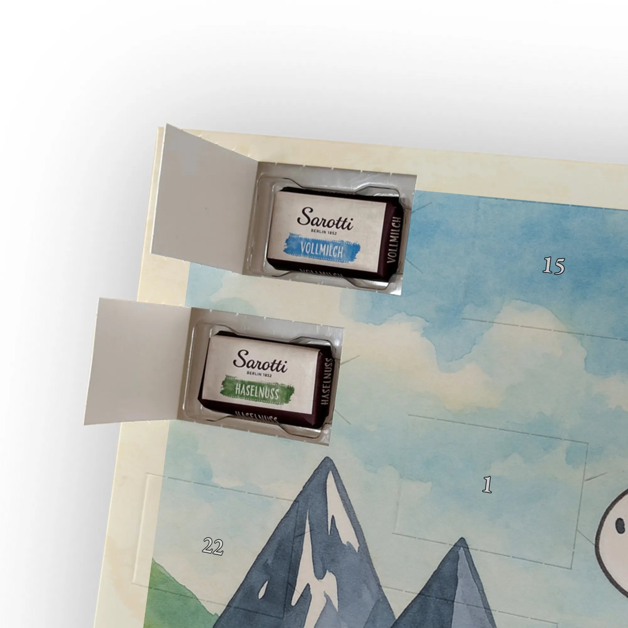🐼 Adventskalender mit Schokolade, liebevoll bedruckt, seidenmatt veredelt.