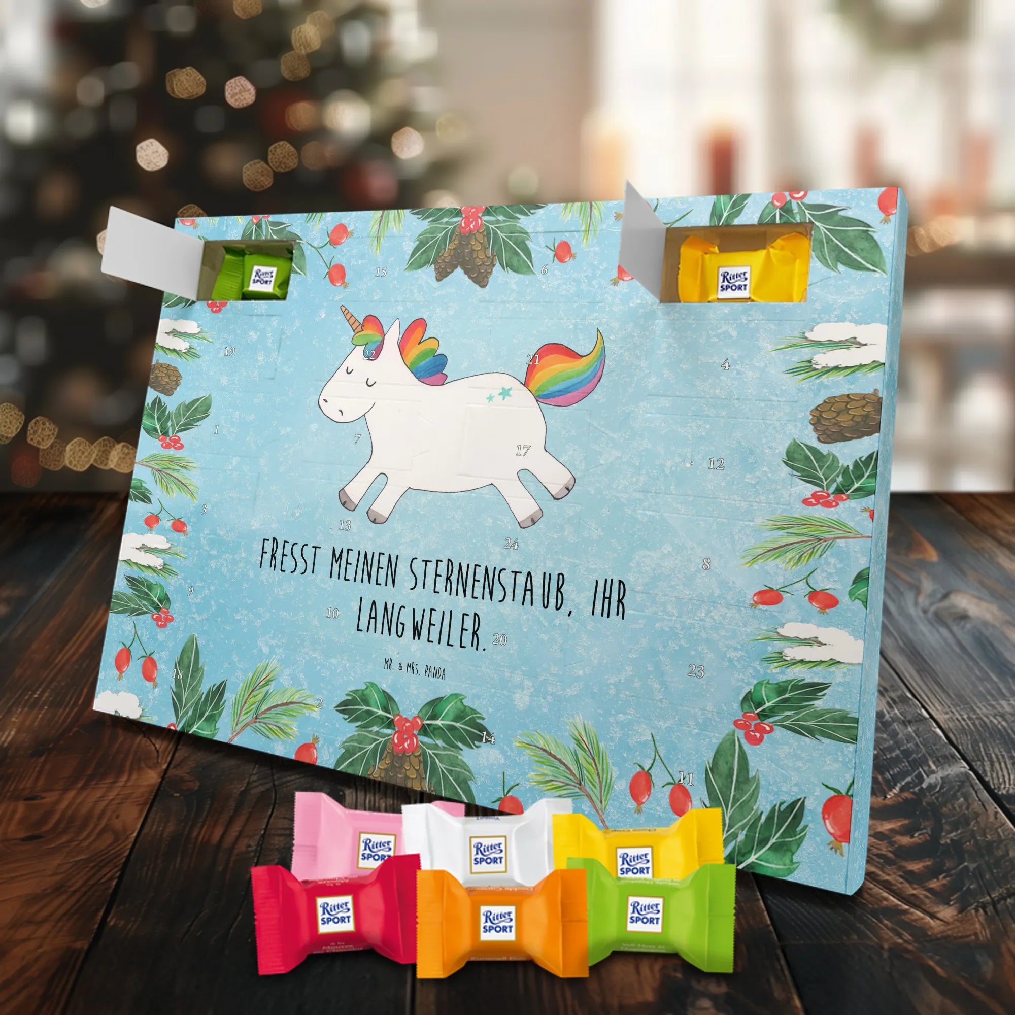Adventskalender Schokolade von Mr. & Mrs. Panda – eine liebevolle Kombination aus hübschem Design und süßem Inhalt. Der Kalender ist bedruckt mit wunderschönen Motiven & Sprüchen von Mr. & Mrs. Panda und besticht durch brillante Druckqualität mit seidenmatter Oberflächenveredelung. Die Seitenflächen sind ebenfalls bedruckt, wodurch der Kalender rundum ein Hingucker ist. Er ist nicht personalisierbar. Maße: 325 mm x 225 mm x 27 mm. Besonders praktisch: Du kannst ihn sowohl aufgehängt als auch aufgestellt nutzen, je nachdem, wo er bei dir am schönsten wirkt. Gefüllt ist der Kalender mit Ritter Sport Schokowürfeln in verführerischen Sorten – Mousse au Chocolat, Schoko Crisp, Voll-Nuss in Nougatcreme, Karamell Duo, Joghurt und Erdbeer-Joghurt. Wichtiger Hinweis: Es handelt sich um einen Kalender gefüllt mit Ritter Sport Schokolade, nicht um einen Kalender der Marke Ritter Sport. Schenke deinen Liebsten oder dir selbst tägliche Schokoglücksmomente mit diesem charmanten Adventskalender.