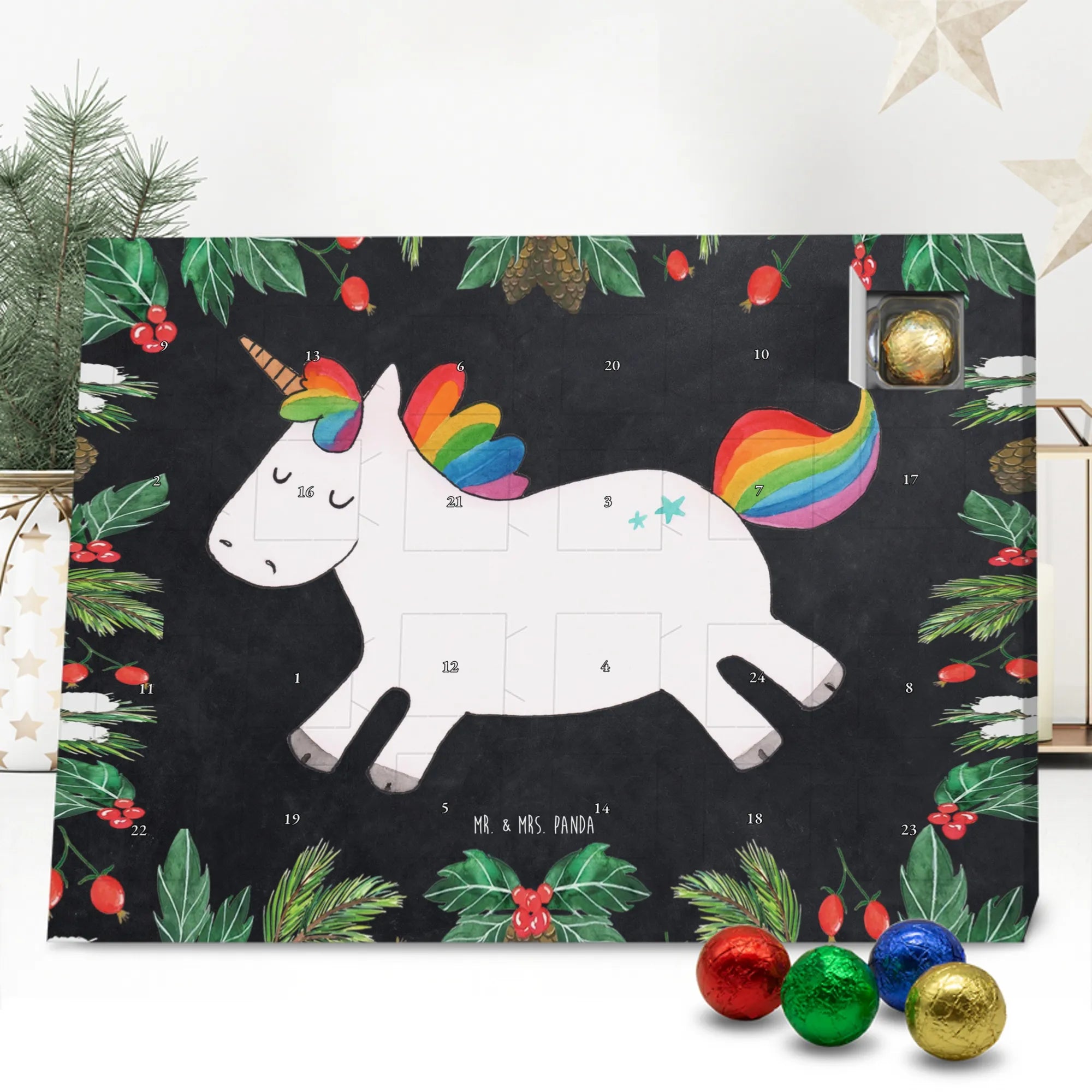 Wunderschöner Adventskalender mit Schokolade von Mr. & Mrs. Panda – für alle, die Advent und Design lieben. Dieser Adventskalender mit Schokolade ist liebevoll bedruckt mit wunderschönen Motiven & Sprüchen von Mr. & Mrs. Panda und ist nicht personalisierbar, aber mit viel Liebe zum Detail gefertigt. Brillante Druckqualität mit seidenmatter Oberflächenveredelung sorgt für einen edlen Look, und die bedruckten Seitenflächen geben dem Kalender eine besondere Optik. Maße: 233 mm x 178 mm x 24 mm. Dank seiner stabilen Verarbeitung kannst du ihn aufstellen oder ganz einfach aufhängen – Besonderheit: kann aufgehängt oder aufgestellt werden. Gefüllt mit MARKENNAMEN Schokolade und leckeren Schokoladenkugeln, bringt er jeden Tag ein kleines Glückserlebnis. Wichtige Hinweise: (Kann Spuren von Haselnüssen, Mandeln, Gluten und Soja enthalten!), bitte kühl und trocken lagern. Ob als Geschenk, Mitbringsel oder Adventsdeko – dieser Kalender zaubert ein Lächeln und sorgt für gemütliche Vorfreude. Viel Freude beim Entdecken der süßen Überraschungen wünscht dir Mr. & Mrs. Panda!