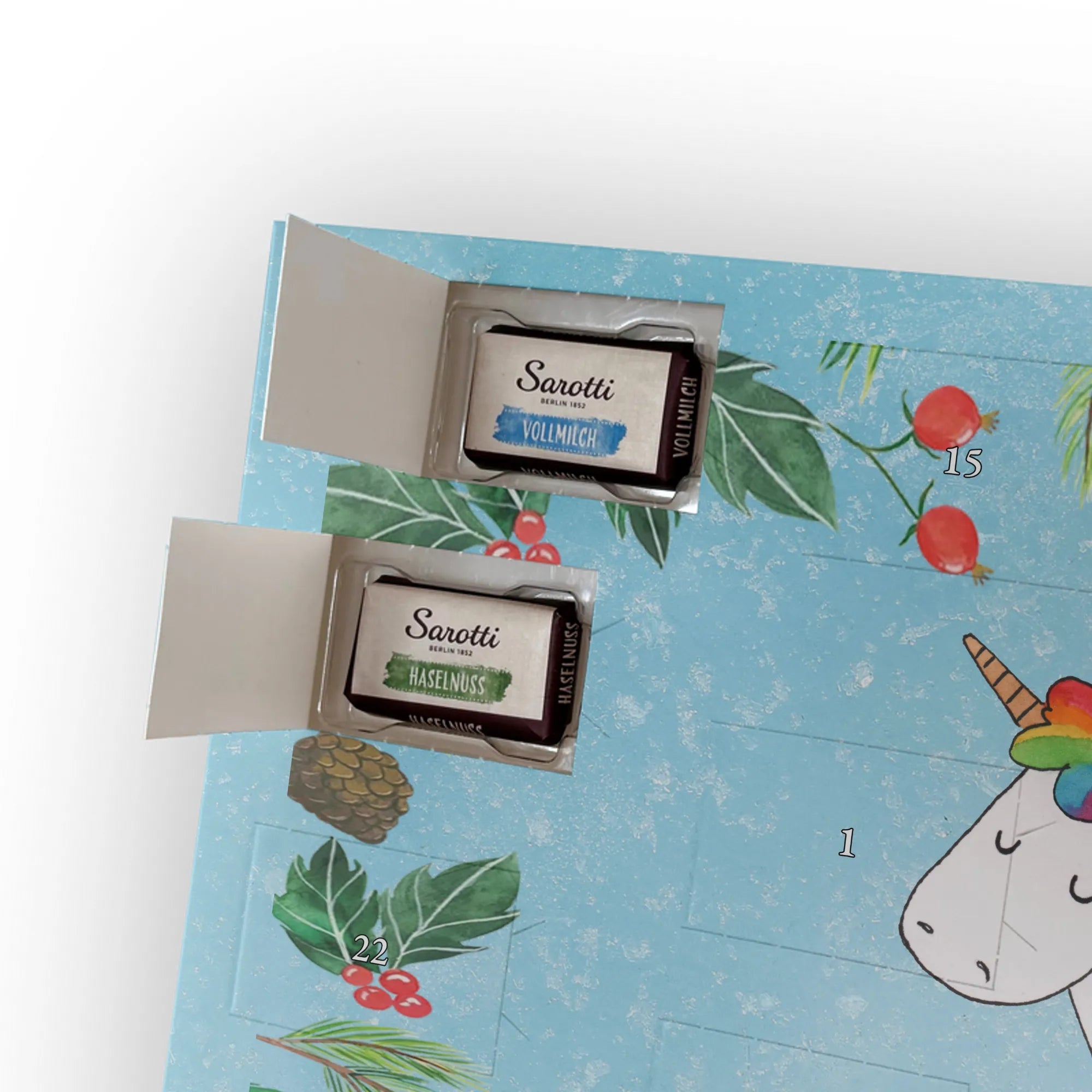 Unser Schokolade Adventskalender von Mr. & Mrs. Panda bringt dir jeden Tag im Dezember ein kleines Glücksgefühl. Die Außenseite ist liebevoll bedruckt mit niedlichen Illustrationen und herzlichen Sprüchen – in brillanter Druckqualität und mit seidenmatter Oberflächenveredelung für einen edlen Look. Die Seitenflächen sind ebenfalls bedruckt, sodass der Kalender von allen Seiten ein echter Hingucker ist. Du kannst ihn hinstellen oder an die Wand hängen, ganz wie es dir gefällt. Der Kalender ist nicht personalisierbar, dafür aber mit feiner Markenschokolade bestückt: 24 einzeln verpackte Schokoladentäfelchen in vier köstlichen Geschmacksrichtungen aus dem Hause Sarotti® und Confiserie Heidel® (Vollmilch, Nougat, Zartbitter, Haselnuss). Insgesamt sind 107 g Markenschokolade enthalten. Maße: 355 mm x 245 mm x 11 mm – ideal für Tisch, Regal oder Fensterbank. Verschenke warme Vorfreude, liebevolle Gestaltung und kleine Schoko-Überraschungen an deine Liebsten – im typischen, gemütlichen Stil von Mr. & Mrs. Panda.