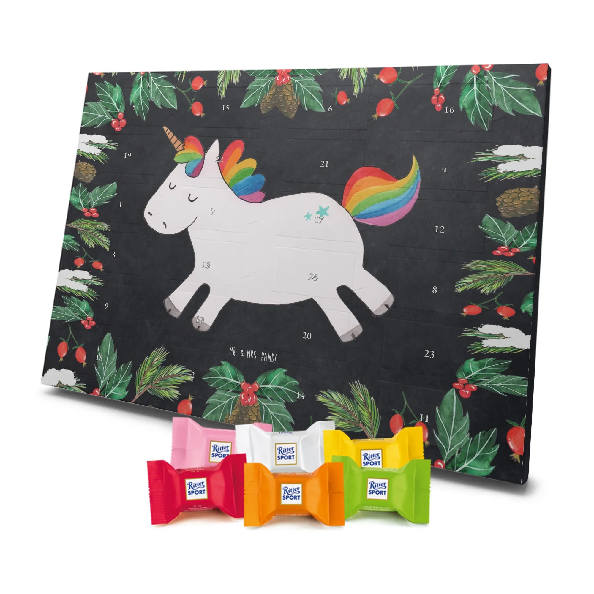 Unser entzückender Schokoladen Adventskalender von Mr. & Mrs. Panda ist das perfekte Highlight für die Adventszeit. Bedruckt mit wunderschönen Motiven & Sprüchen von Mr. & Mrs. Panda zaubert er dir ein Lächeln an jedem Tag im Dezember. Der Kalender ist nicht personalisierbar, überzeugt aber durch brillante Druckqualität mit seidenmatter Oberflächenveredelung und sorgsame bedruckte Seitenflächen. Die stabile Verarbeitung macht ihn zu einem dekorativen Hingucker. Maße: 325 mm x 225 mm x 27 mm. Besonders praktisch: Er kann aufgehängt oder aufgestellt werden, ganz nach deinem Geschmack und Platzangebot. Gefüllt ist der Adventskalender mit Ritter Sport Schokowürfeln – in verführerischen Sorten wie Mousse au Chocolat, Schoko Crisp, Voll-Nuss in Nougatcreme, Karamell Duo, Joghurt und Erdbeer-Joghurt. Wichtiger Hinweis: Es handelt sich um einen Kalender gefüllt mit Ritter Sport Schokolade, nicht um einen Kalender der Marke Ritter Sport. Schenk ihn Freunden, der Familie oder gönn dir selbst eine süße Vorfreude: kleine Schokoladenmomente, liebevoll verpackt von Mr. & Mrs. Panda.